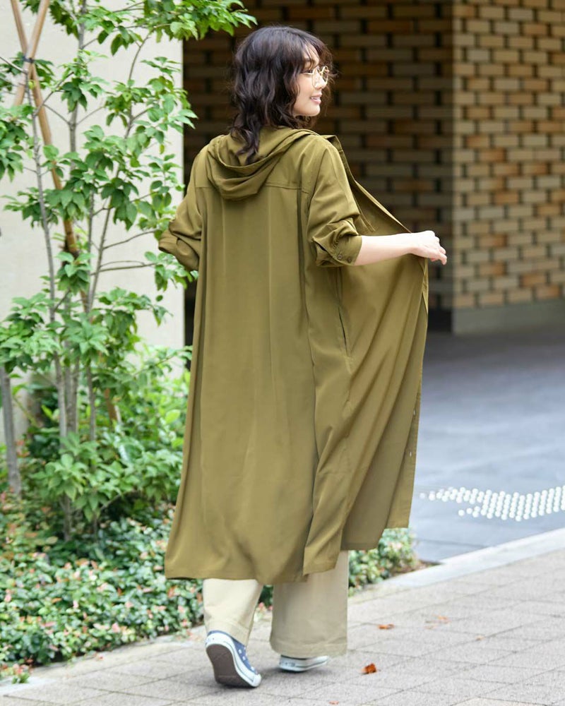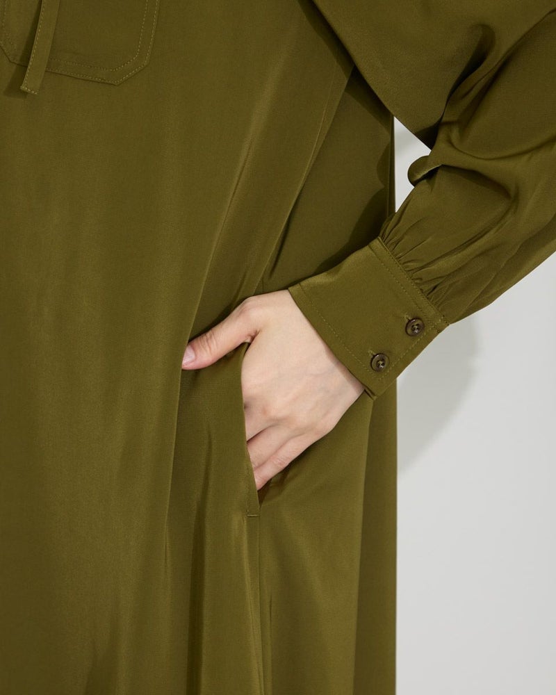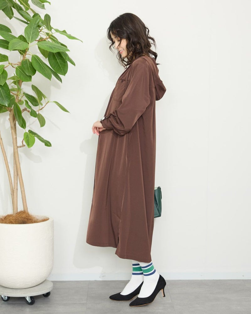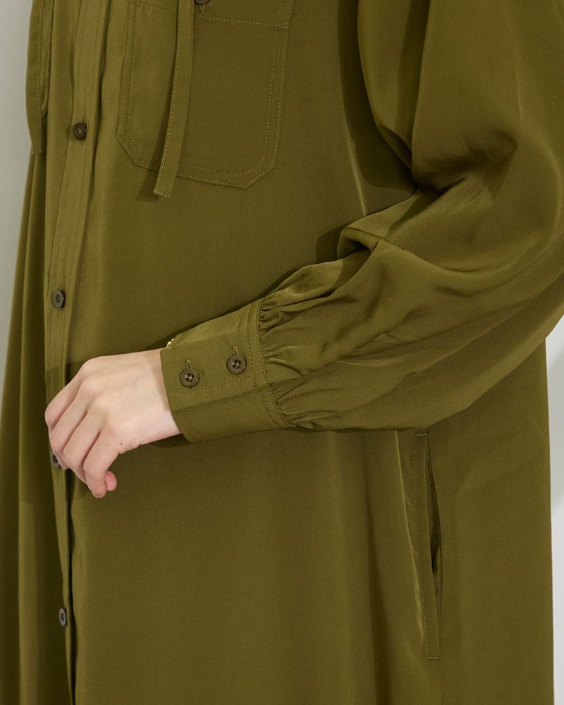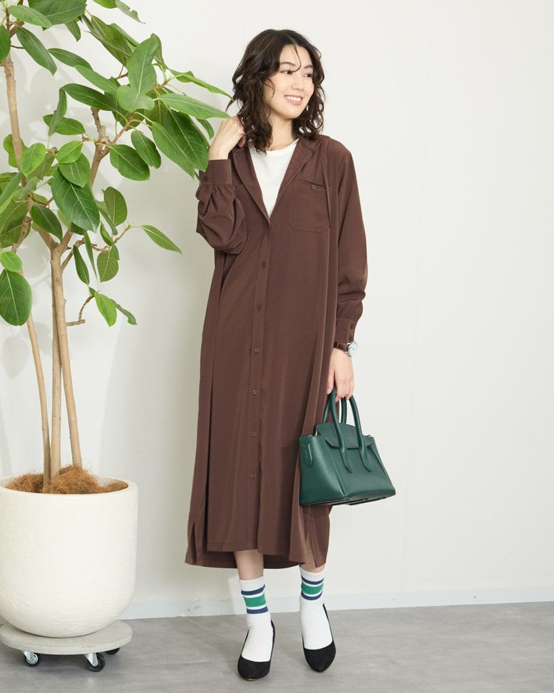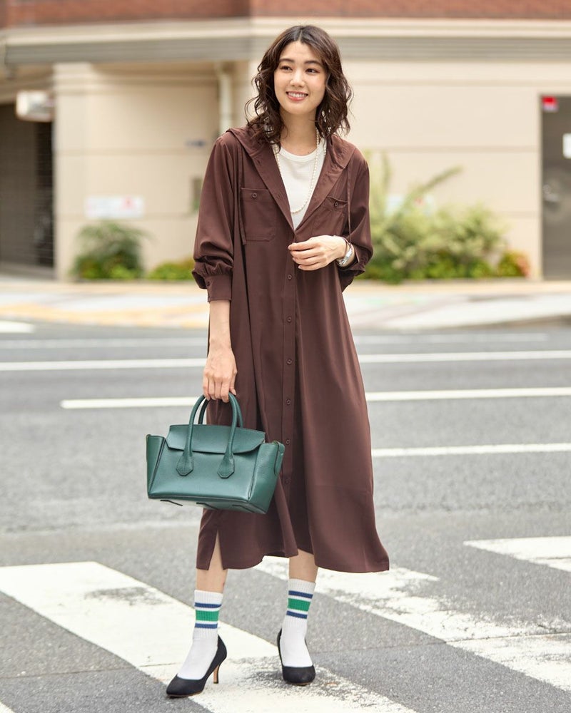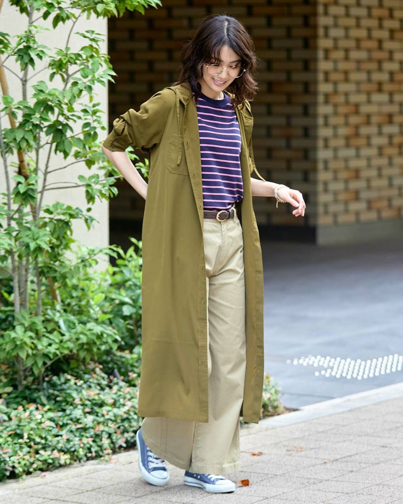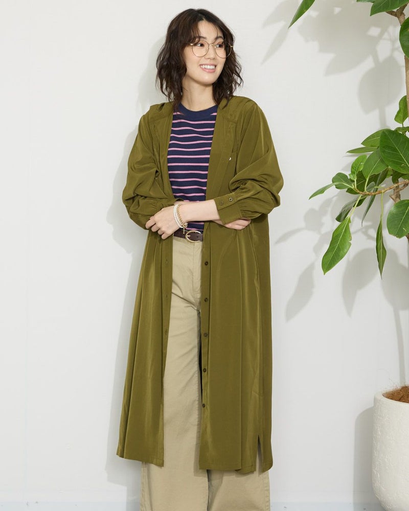 ドレープ性と微光沢のポリエステル素材のフードワンピース。1枚で着ても羽織としてTシャツに重ねるのもおすすめです。両胸ポケットがアクセントで落ち着いたアースカラーです。 モデル身長: 166 cm 着用サイズ: M サイズ Golden Bear WOMEN ブラウス (WOMEN) 【着用アイテム】467Q4412 ボーダータンクトップ 467QA405 リブ使いボーダーTシャツ 467Q6712 フレアパンツ