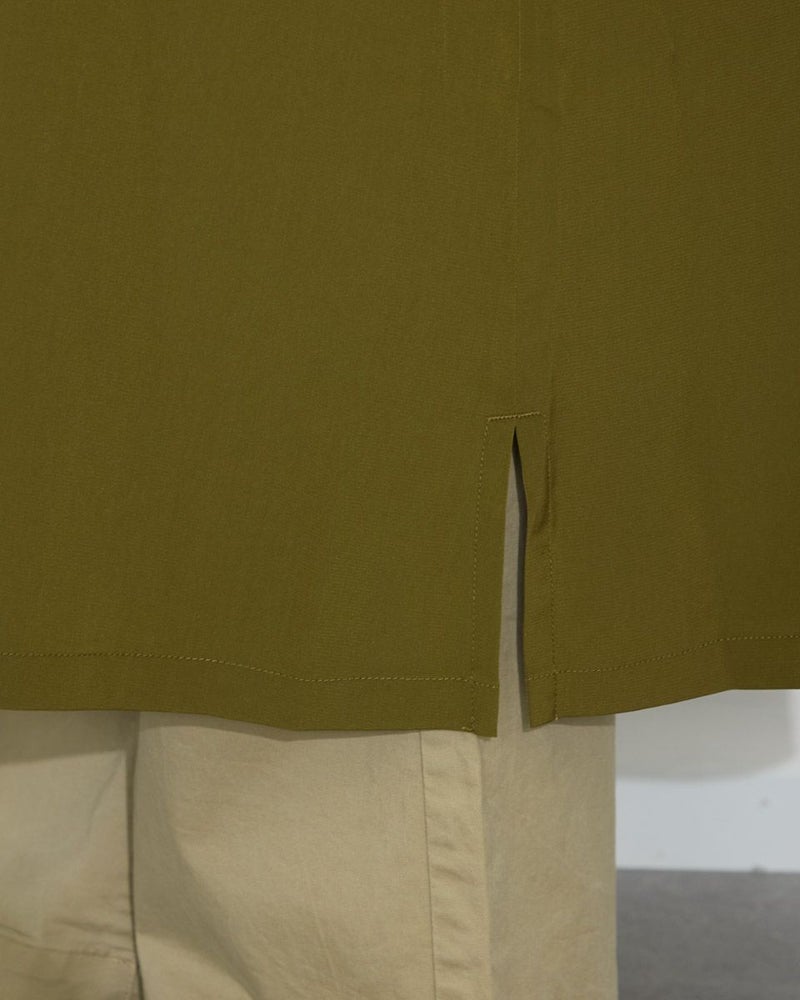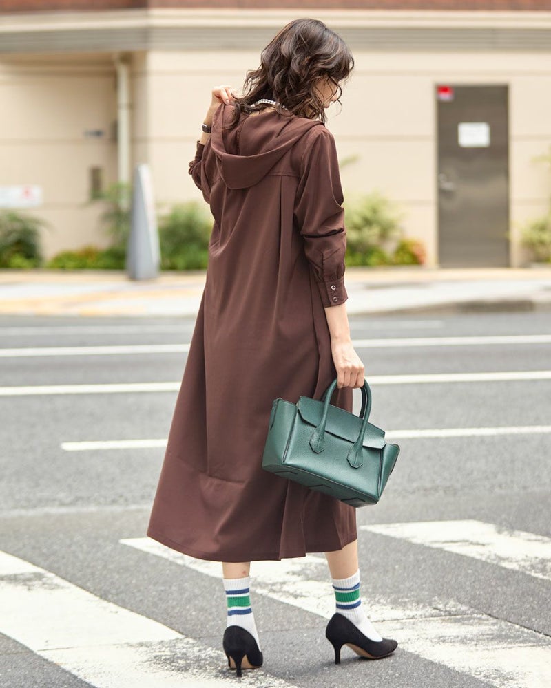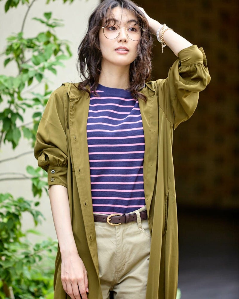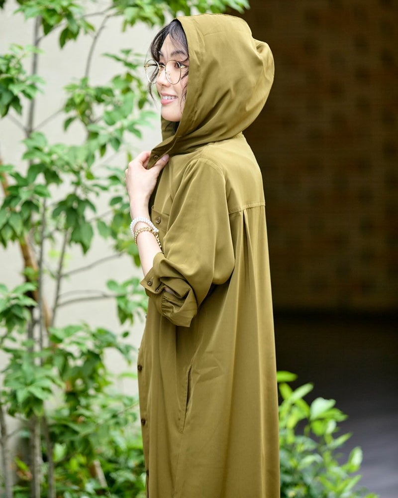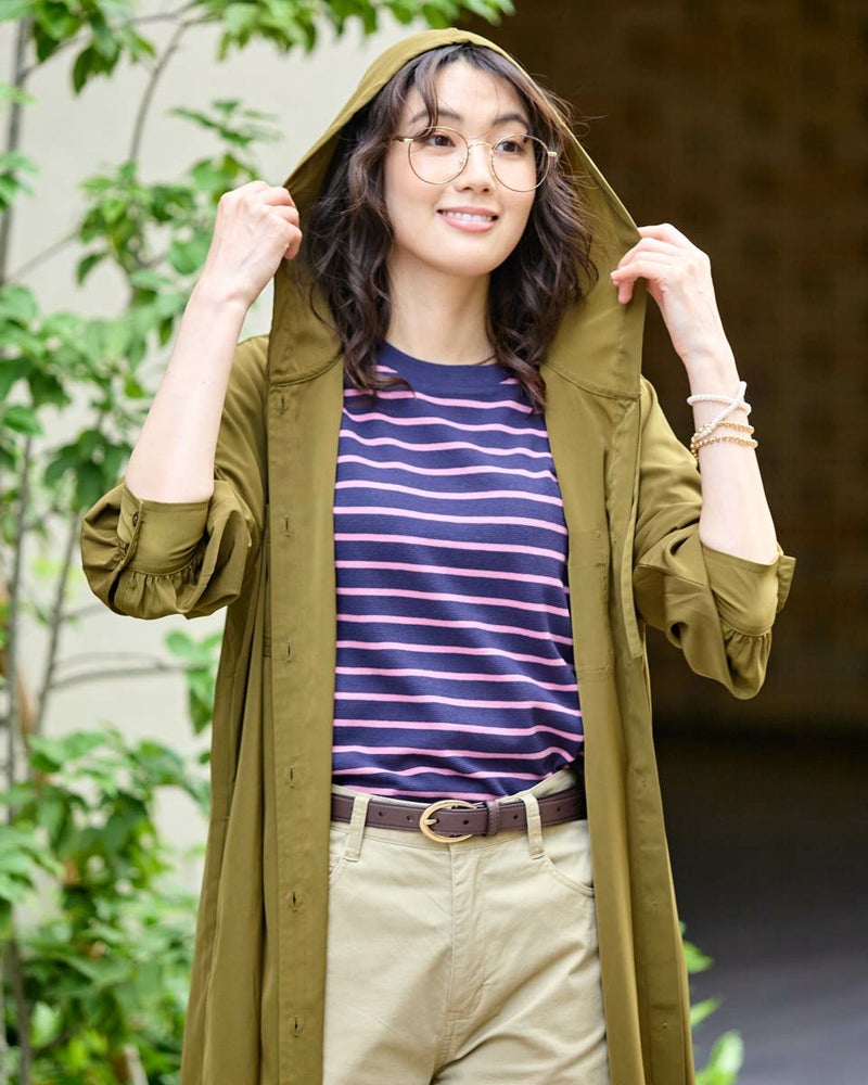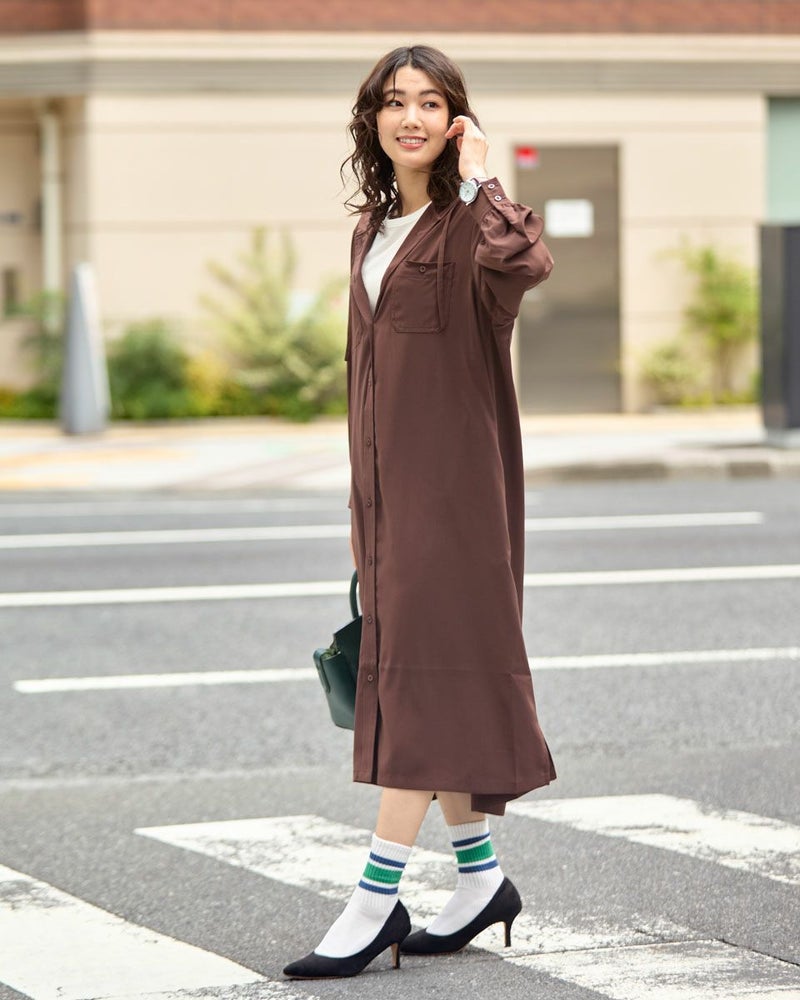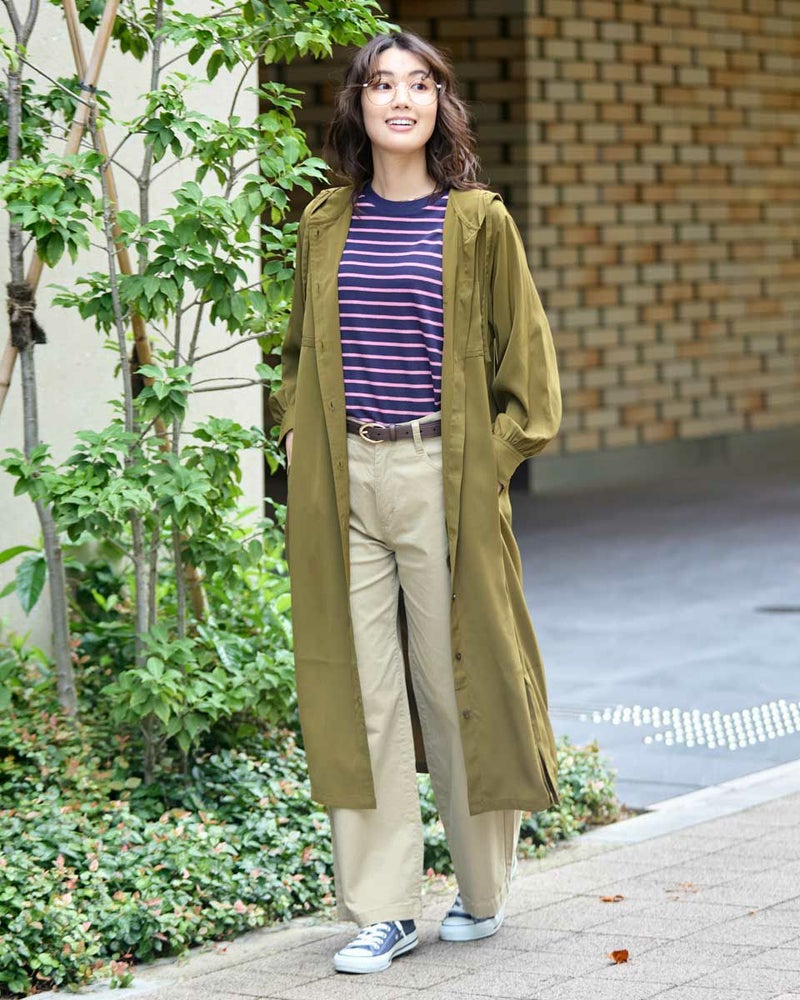ドレープ性と微光沢のポリエステル素材のフードワンピース。1枚で着ても羽織としてTシャツに重ねるのもおすすめです。両胸ポケットがアクセントで落ち着いたアースカラーです。 モデル身長: 166 cm 着用サイズ: M サイズ Golden Bear WOMEN ブラウス (WOMEN) 【着用アイテム】467Q4412 ボーダータンクトップ 467QA405 リブ使いボーダーTシャツ 467Q6712 フレアパンツ