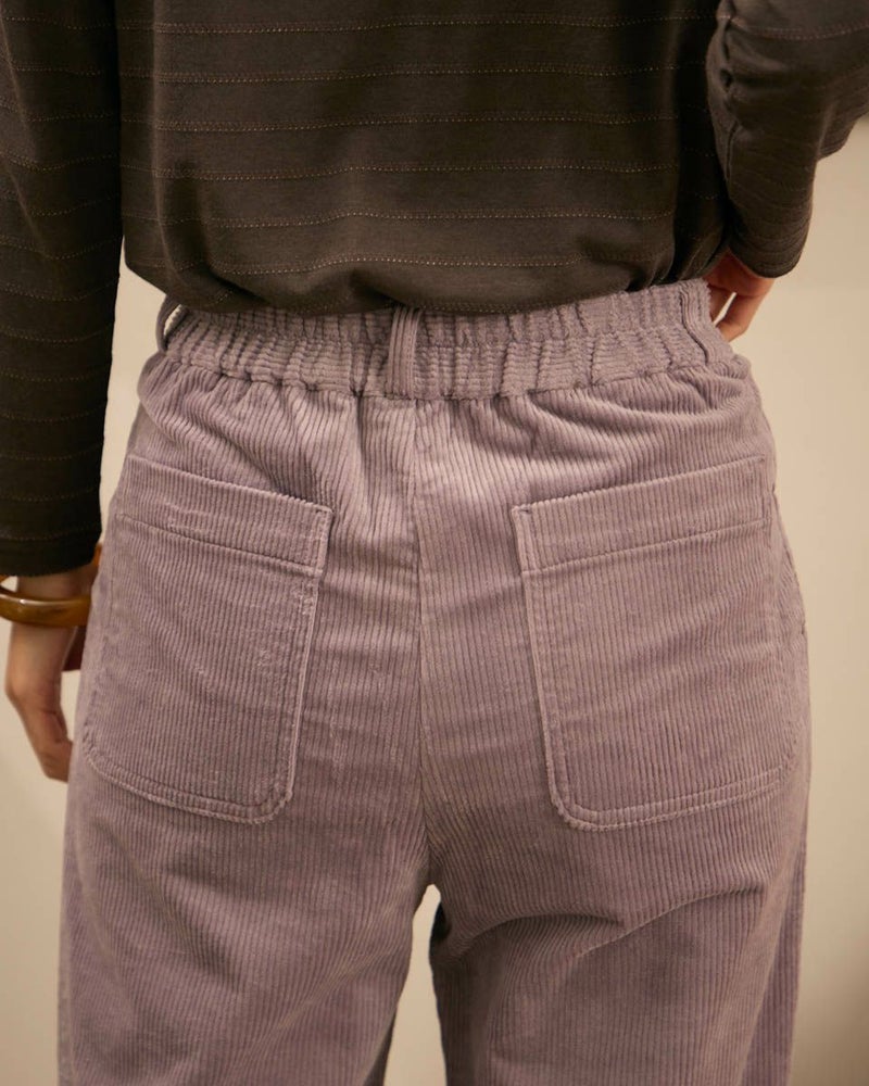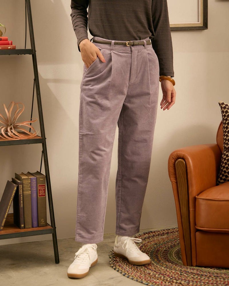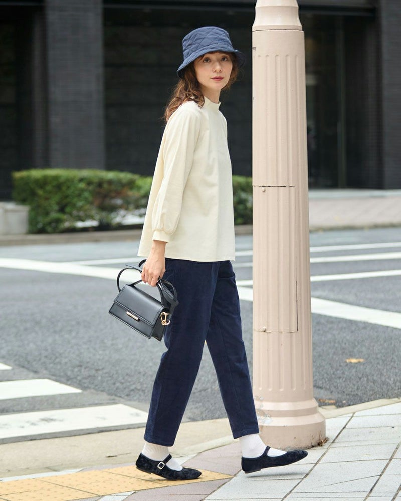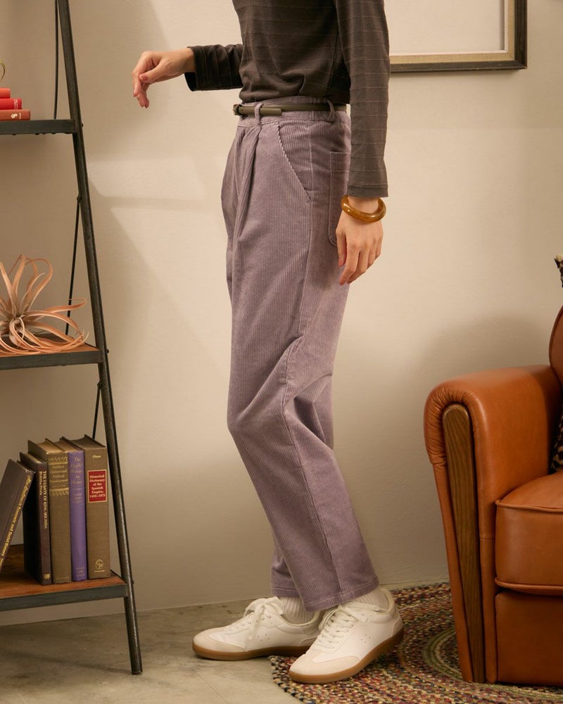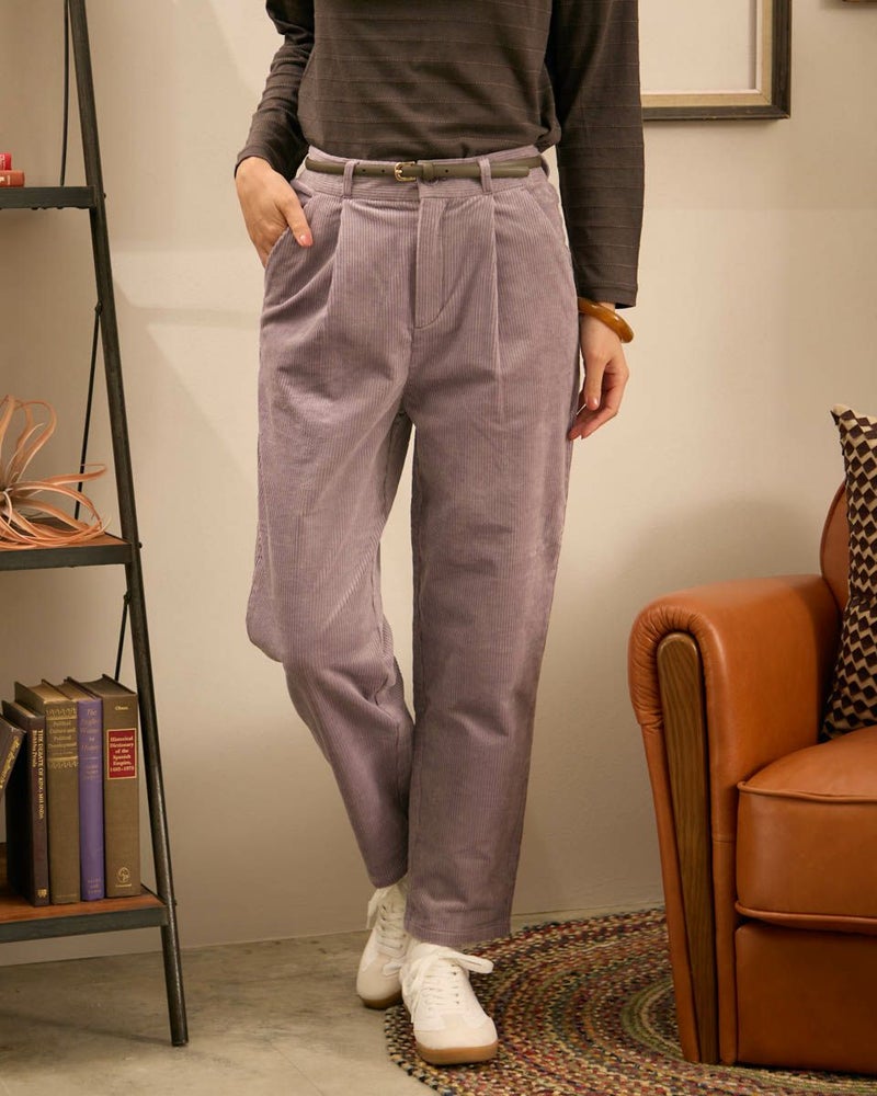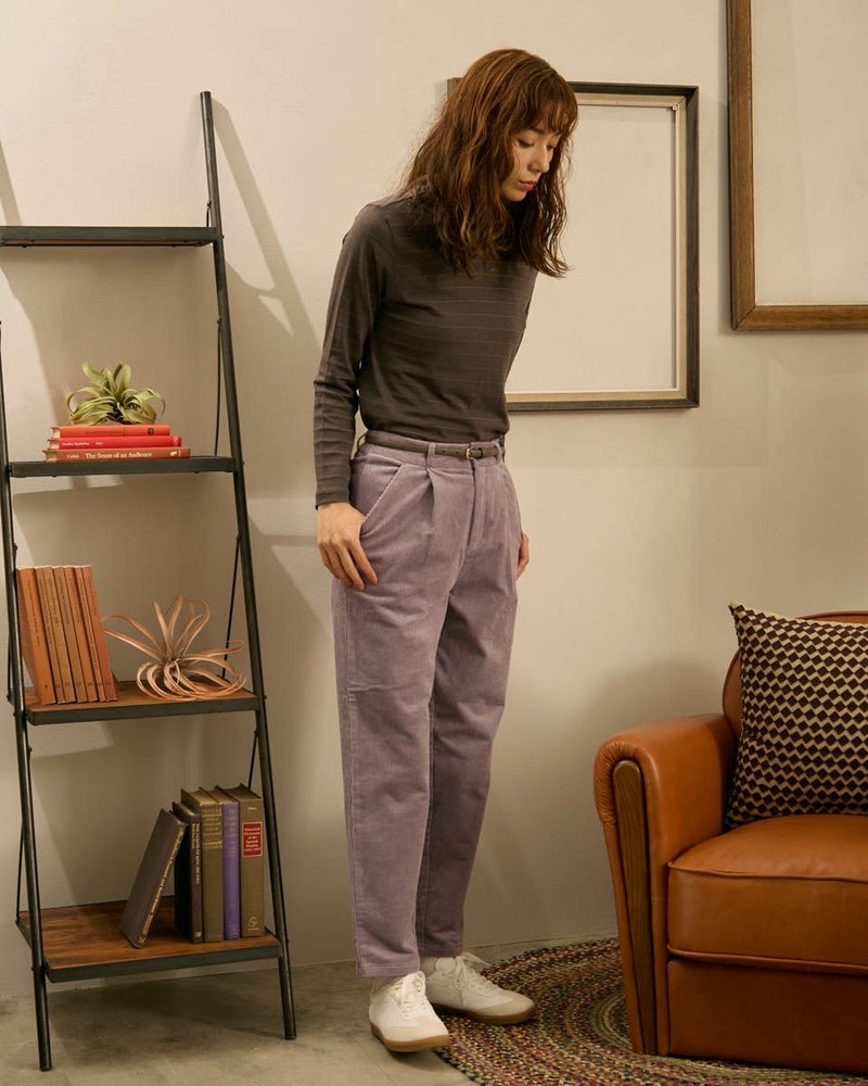 やや畝の目立つ8Wコーデュロイを使用したテーパードパンツです。ウエスト部分は後ろにギャザーを入れ、前はタックを入れていますので、全体にゆとりの有るテーパードシルエットです。前中心ファスナー開きです。 モデル身長: 171 cm 着用サイズ: 61 サイズ Golden Bear WOMEN ボトムス (WOMEN) 【着用アイテム】467QC411 タートルネックTシャツ 467QD301 コーデュロイブラウス 467QD431 ロゴプルオーバー 467QD131 洗えるGBキルトジャケット 467QD032 キルト帽子