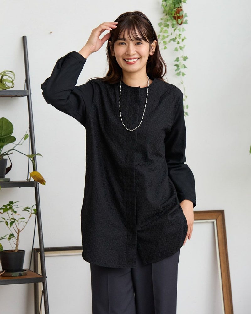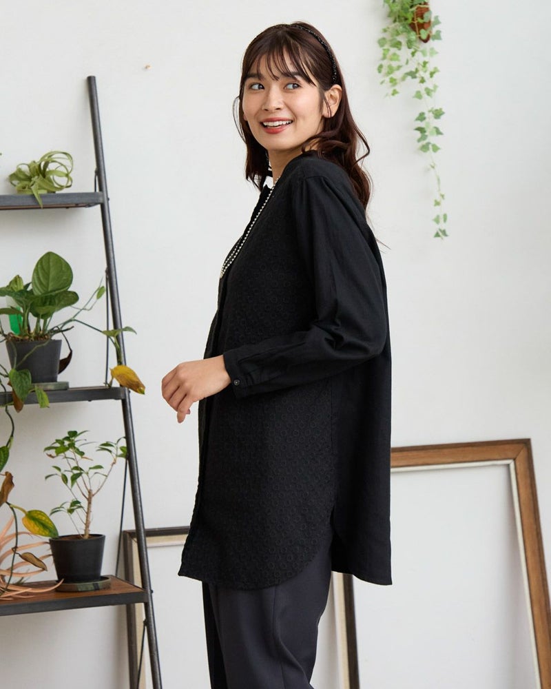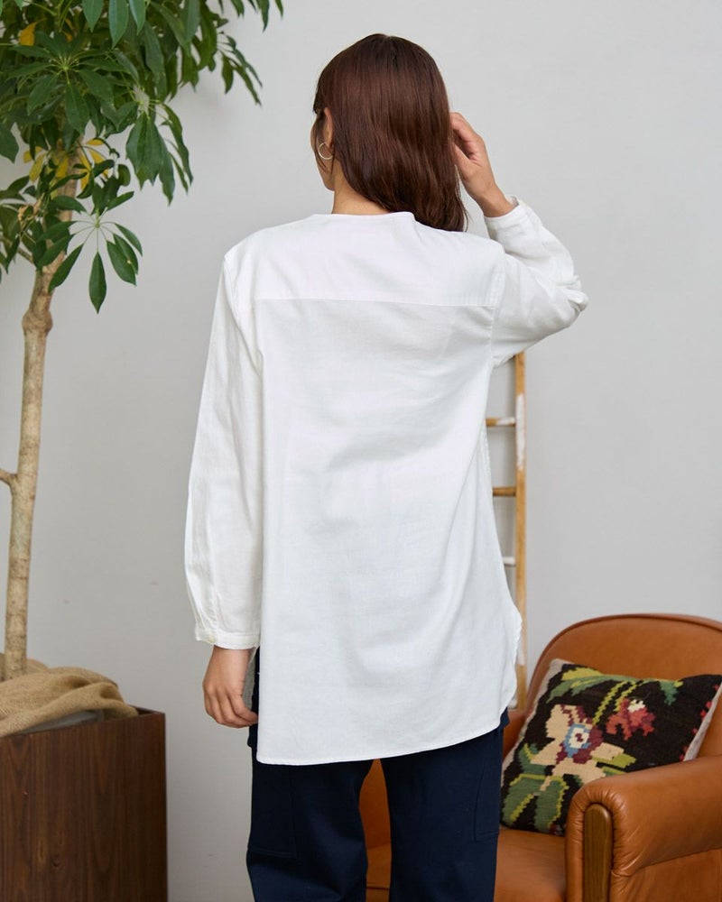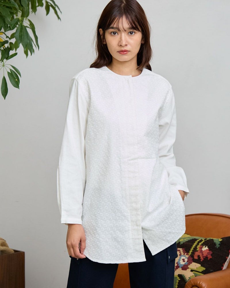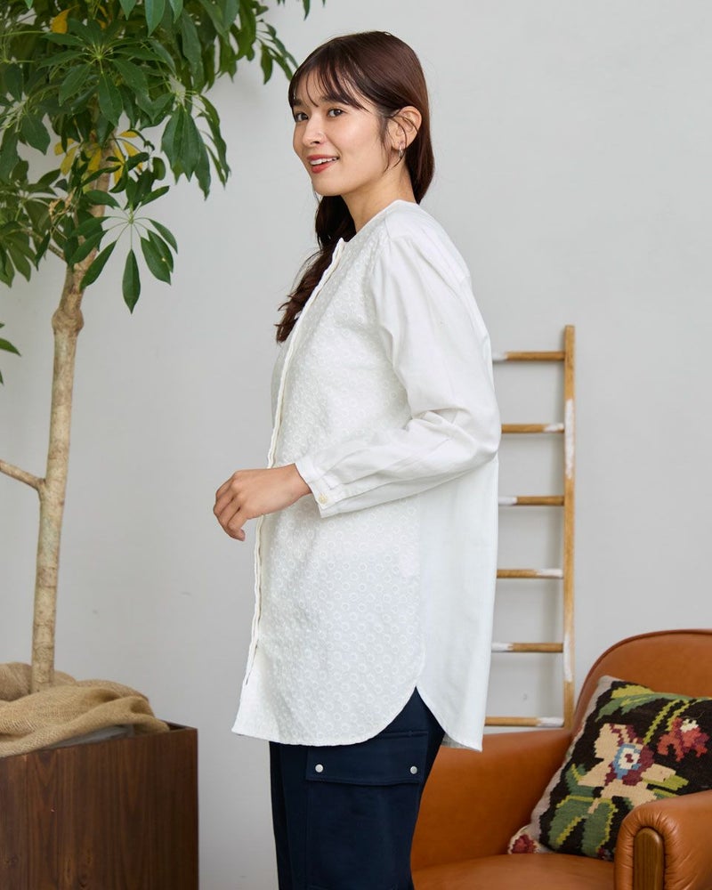 オーガニックコットン100%のノーカラーシャツチュニックです。微起毛をしたツイル素材で前身頃のみ全体に同色の糸で刺繍をしています。長めの着丈で一枚着でも羽織としても着用頂けます。 モデル身長: 168 cm 着用サイズ: M サイズ Golden Bear WOMEN ブラウス (WOMEN) 【着用アイテム】467RD701 ストレートカーゴパンツ 468R4760 サスペンダーパンツ