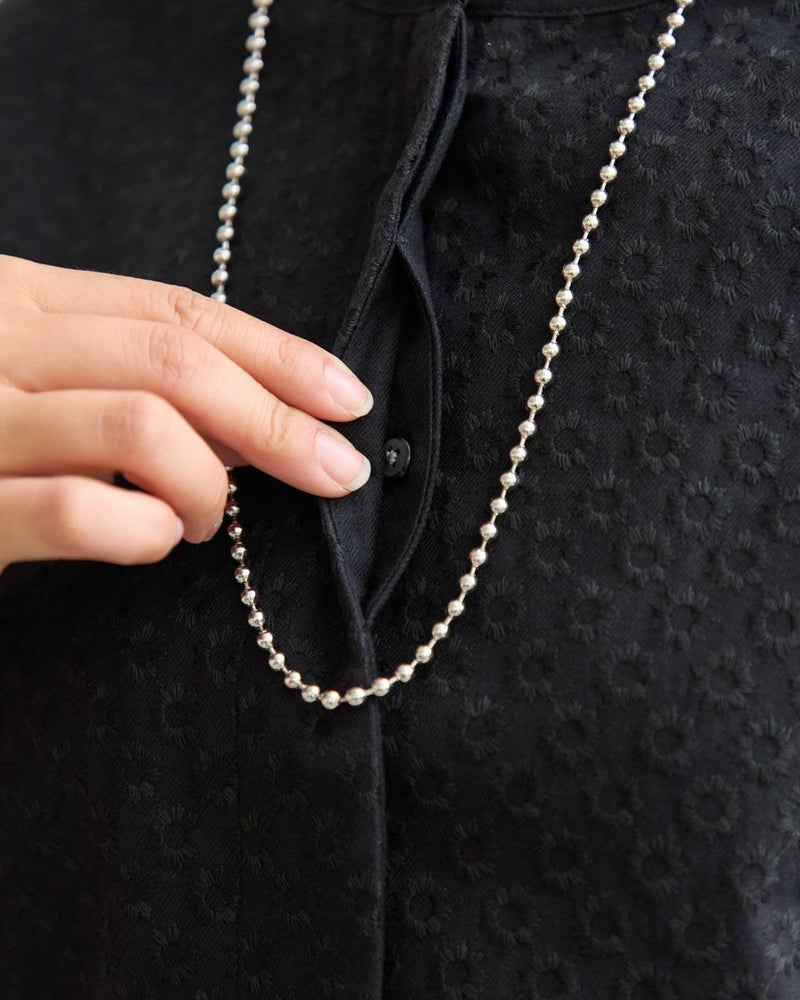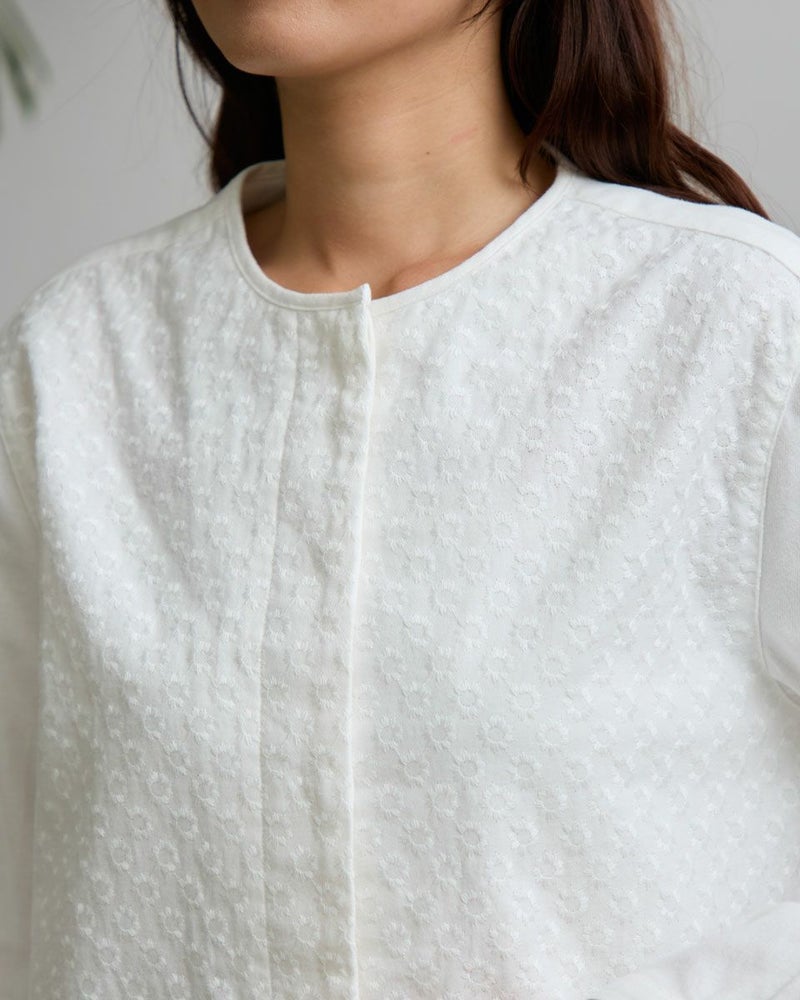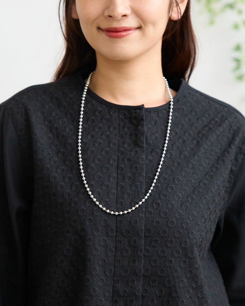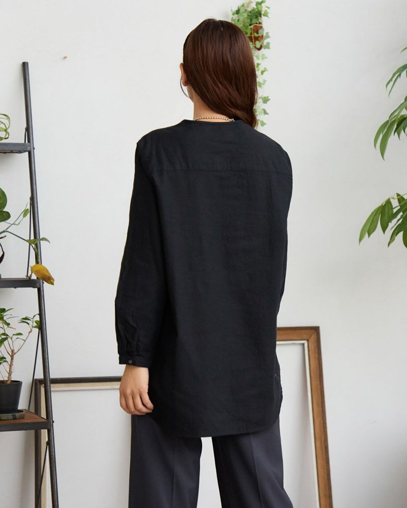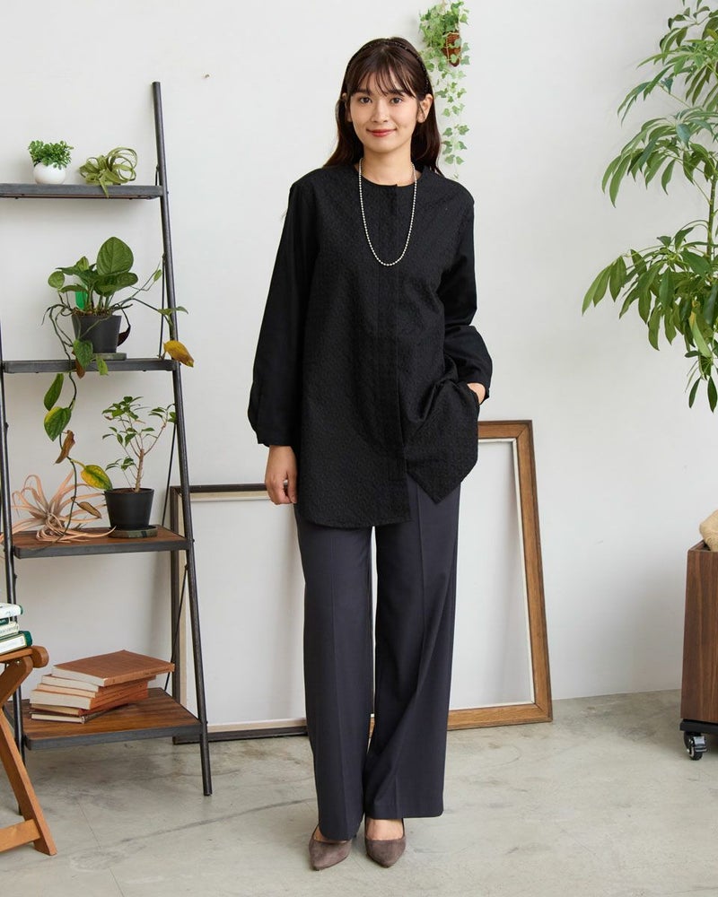 オーガニックコットン100%のノーカラーシャツチュニックです。微起毛をしたツイル素材で前身頃のみ全体に同色の糸で刺繍をしています。長めの着丈で一枚着でも羽織としても着用頂けます。 モデル身長: 168 cm 着用サイズ: M サイズ Golden Bear WOMEN ブラウス (WOMEN) 【着用アイテム】467RD701 ストレートカーゴパンツ 468R4760 サスペンダーパンツ