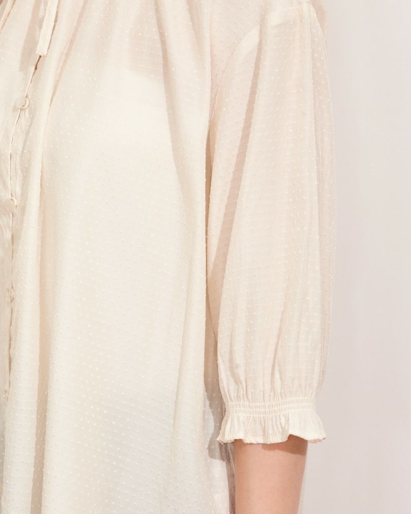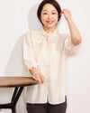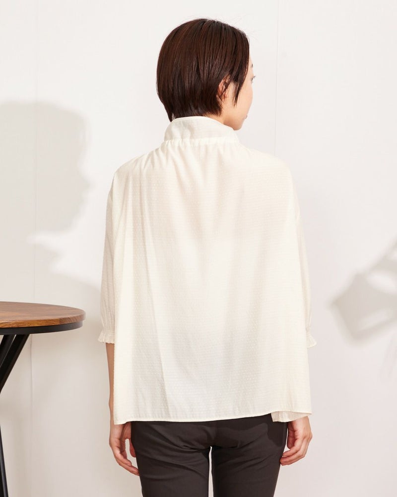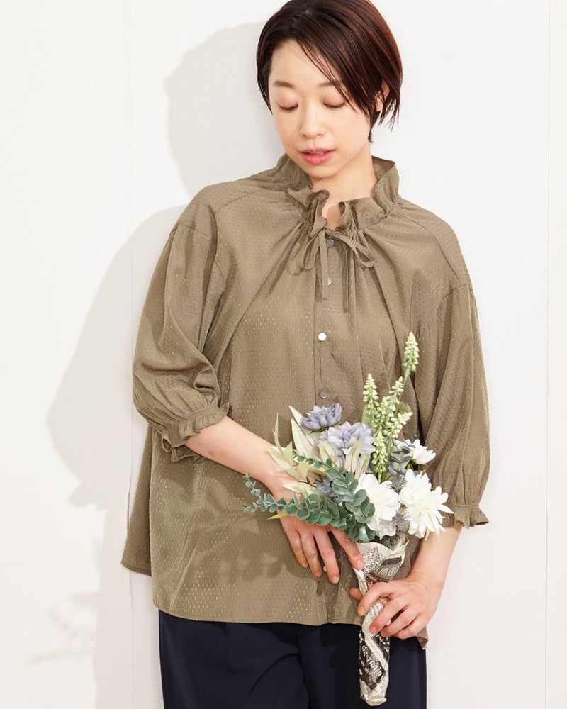 マットでしなやかな生地には小さく織り込んだドットが並び、光を反射し時々光る様子がとても綺麗。襟元に通したヒモをキュッと絞るとフリル状になった襟が立ち上がりとても華やかに。フロントで軽く蝶結びにしてお召ください。フェミニンな雰囲気なのでオフィスや在宅業務での着用もおすすめ。気温に応じてカーディガンやジレを羽織ってもOK。ボタンを全て開け羽織る時は襟をゆるく絞り小さく隆起させると顔回りに立体感が出て可愛い表情に。柔らかく女性らしさがある為、綺麗めなボトムスの他、カジュアルなアイテムとのミックスコーディネートも素敵です。