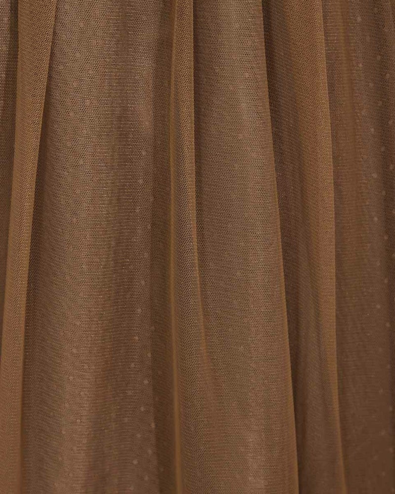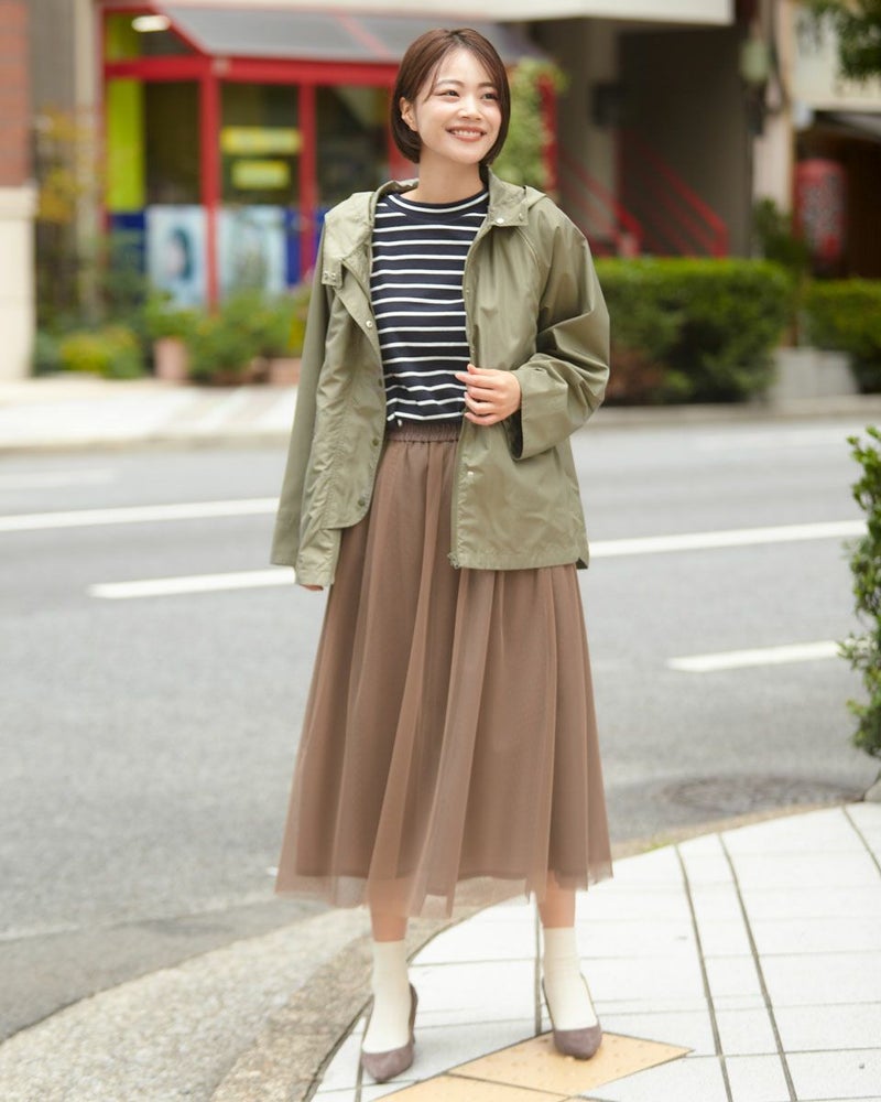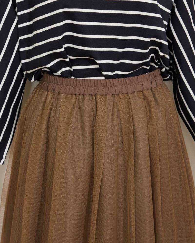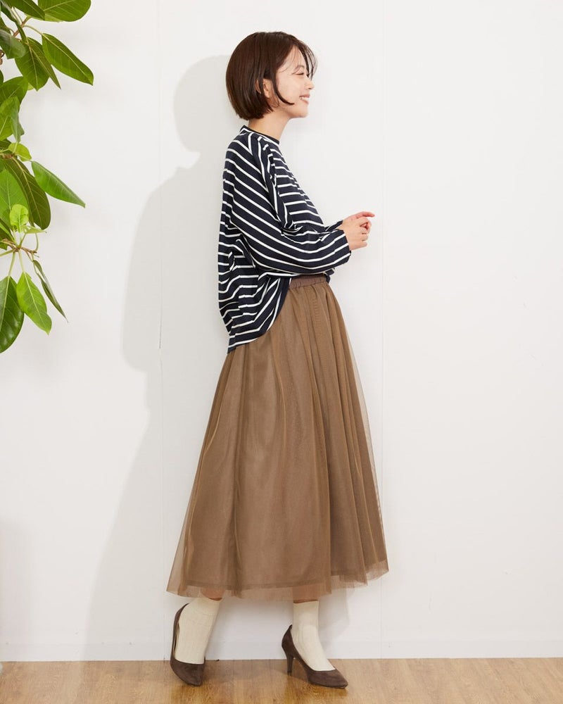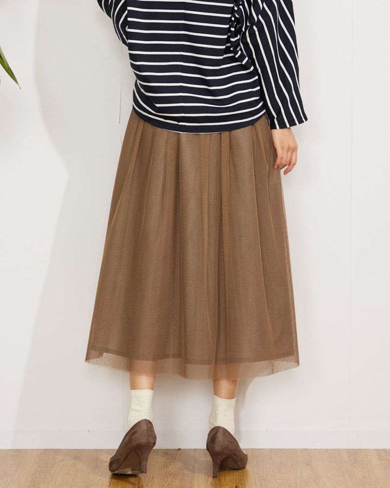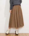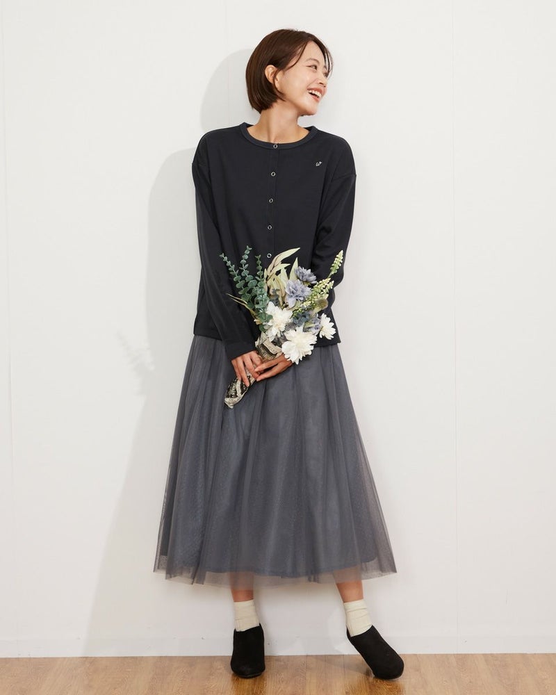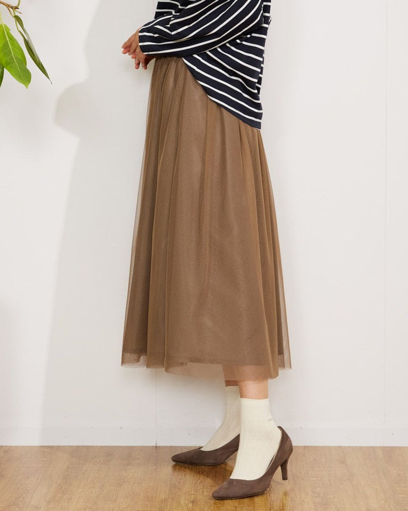 ふわっと広がるチュールが華やかなスカートです。ドット柄のチュールを中間に、表のチュールから、かすかにドットの陰影が見え隠れする様子が大人っぽくて素敵な1着です。しっかりと裏地が付いている為、透けを心配することなくお召しいただけます。足を覆うミモレ丈でチュールに動きが出るためブーツを合わせても足元が重くなりすぎません。ジャケットやカーディガンを合わせてオフィス仕様にしたりパーカやダウンベストとミックスしてもチュールの持つ女性らしさで砕け過ぎず綺麗めカジュアルに仕上がります。