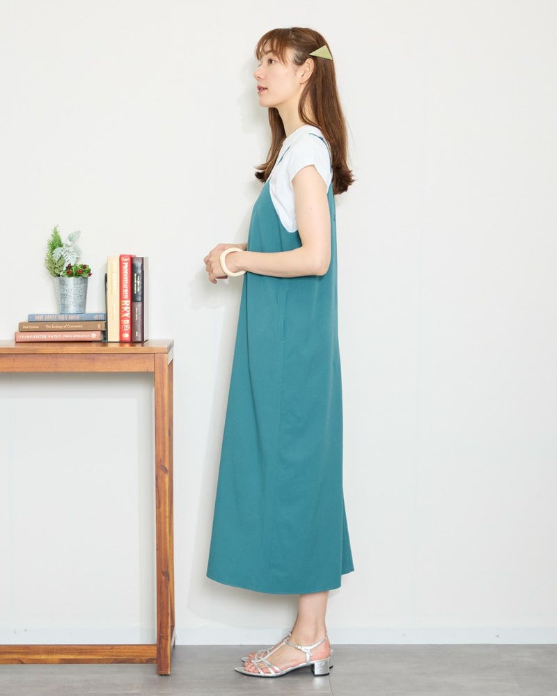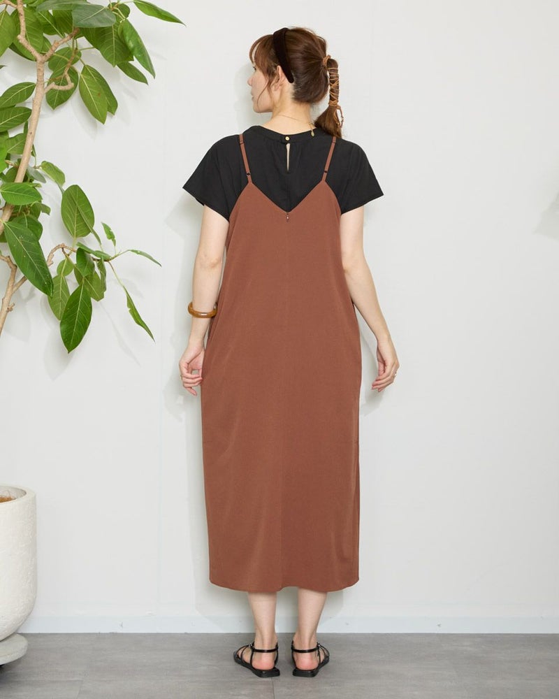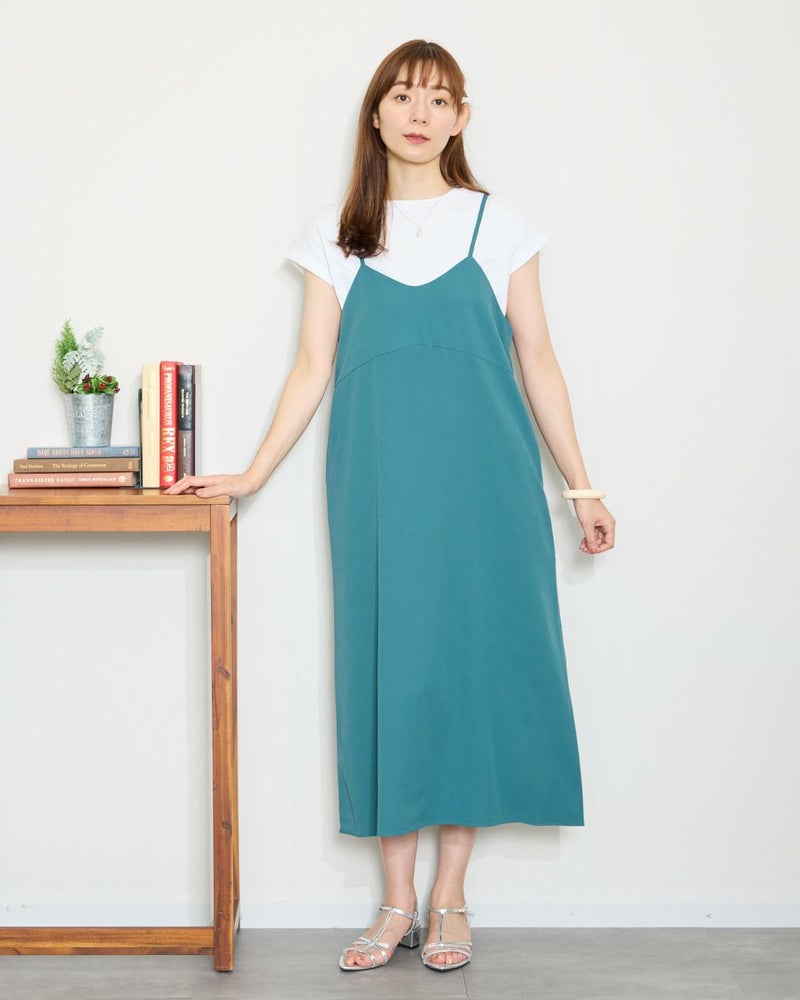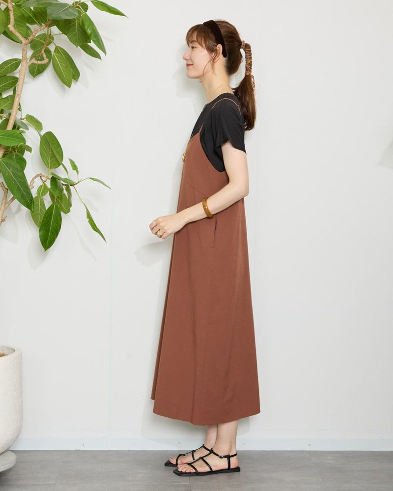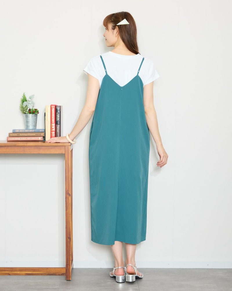 細かい格子状の織り目が広がる生地には、小さな凹凸と優しい微光沢で上品なリラックス感が漂います。ほどよく入れたフレアで身体への張り付きを軽減します。フロントのV字ラインで顔周りがスッキリ見えるため、骨格ストレートタイプの方にもお薦めです。素足にも安心の裏地付き。肩ひもの調節も可能です。