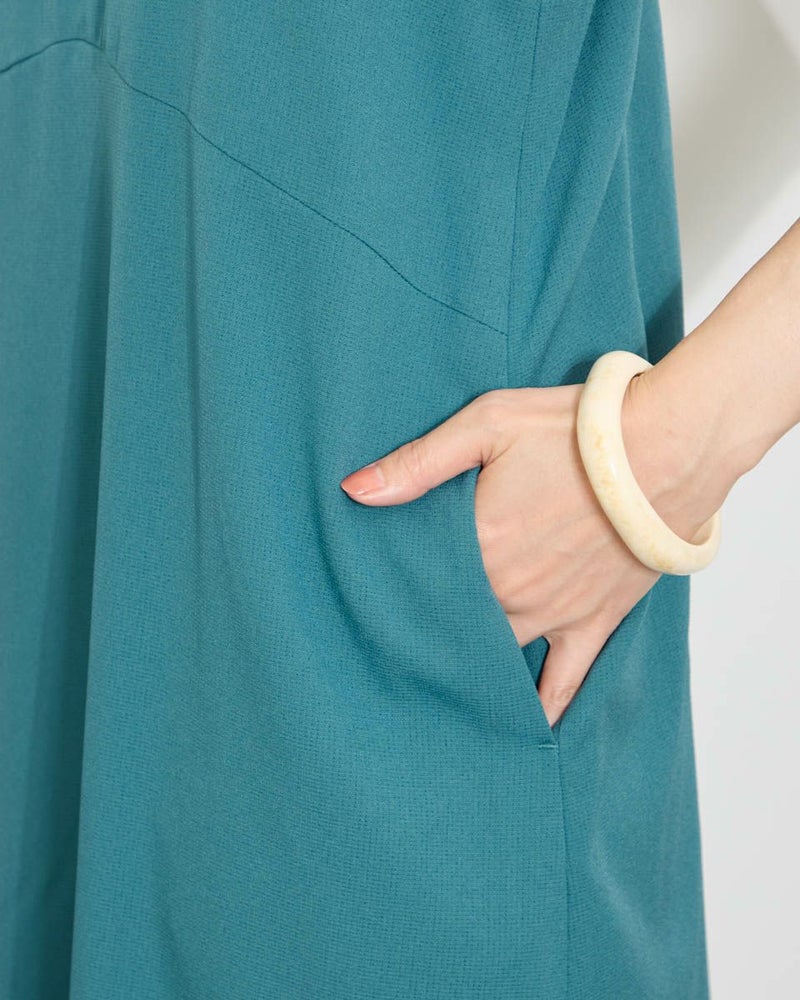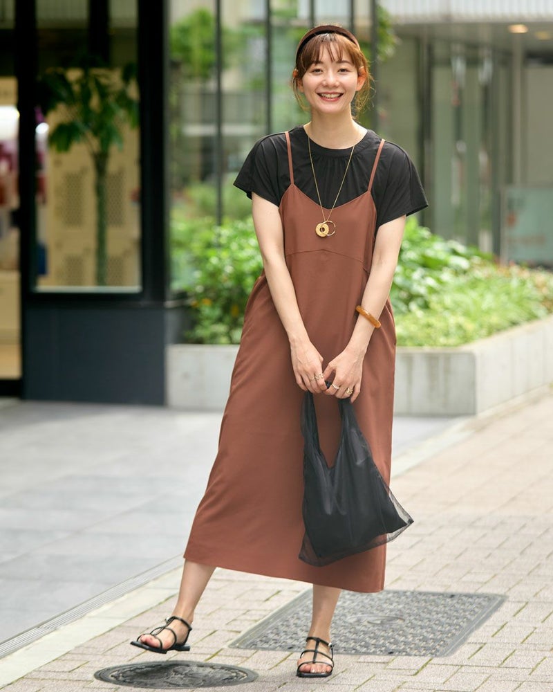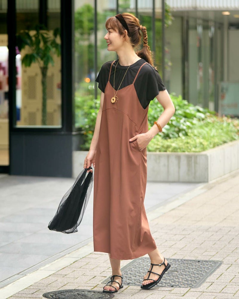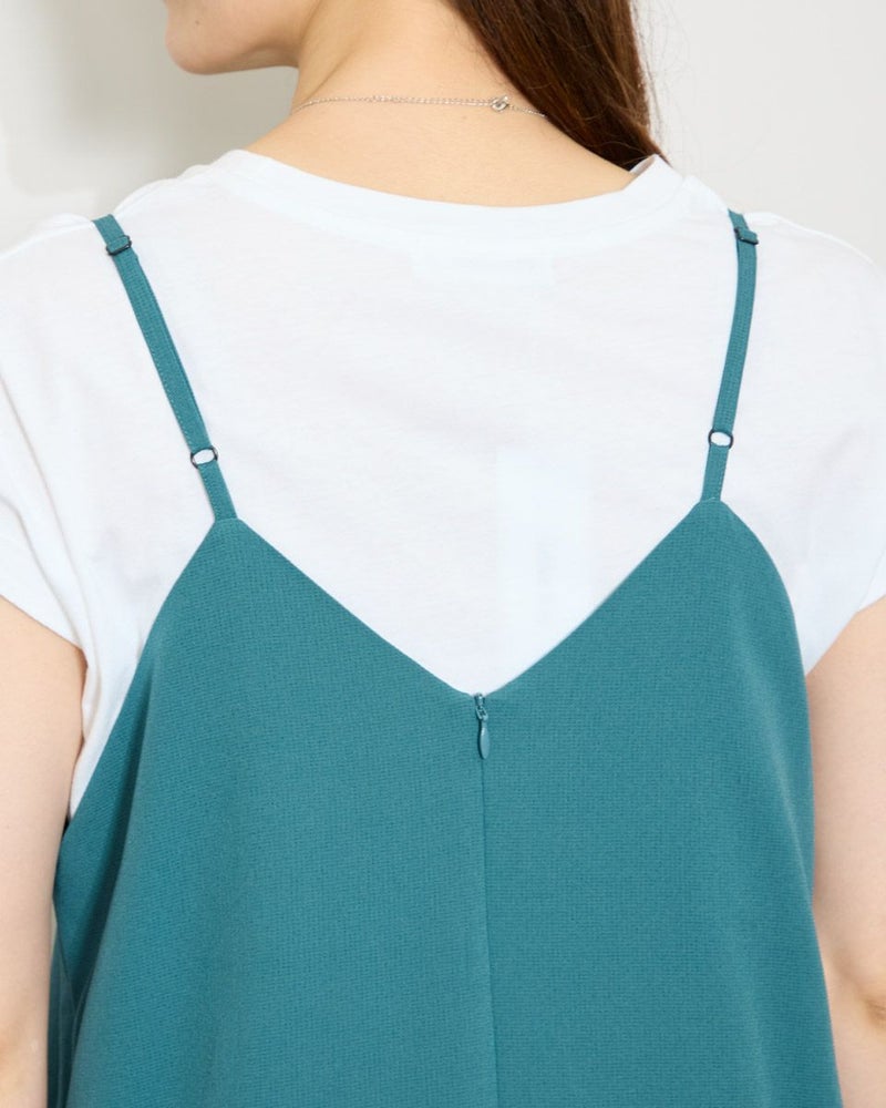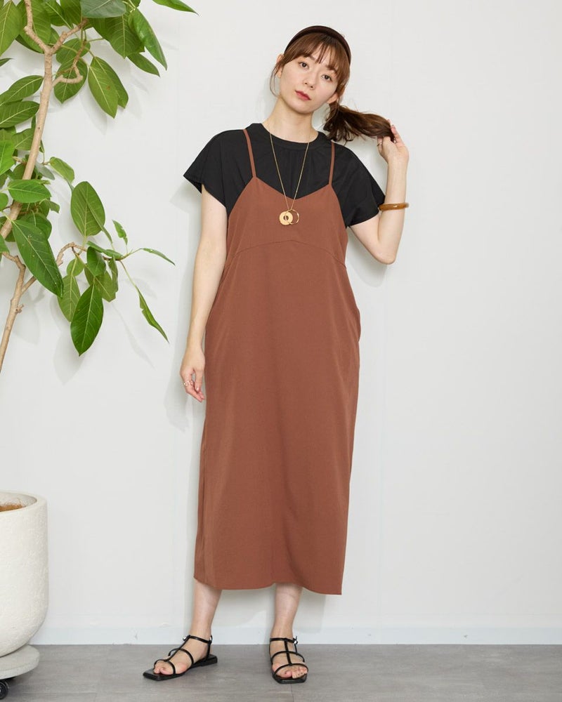 細かい格子状の織り目が広がる生地には、小さな凹凸と優しい微光沢で上品なリラックス感が漂います。ほどよく入れたフレアで身体への張り付きを軽減します。フロントのV字ラインで顔周りがスッキリ見えるため、骨格ストレートタイプの方にもお薦めです。素足にも安心の裏地付き。肩ひもの調節も可能です。