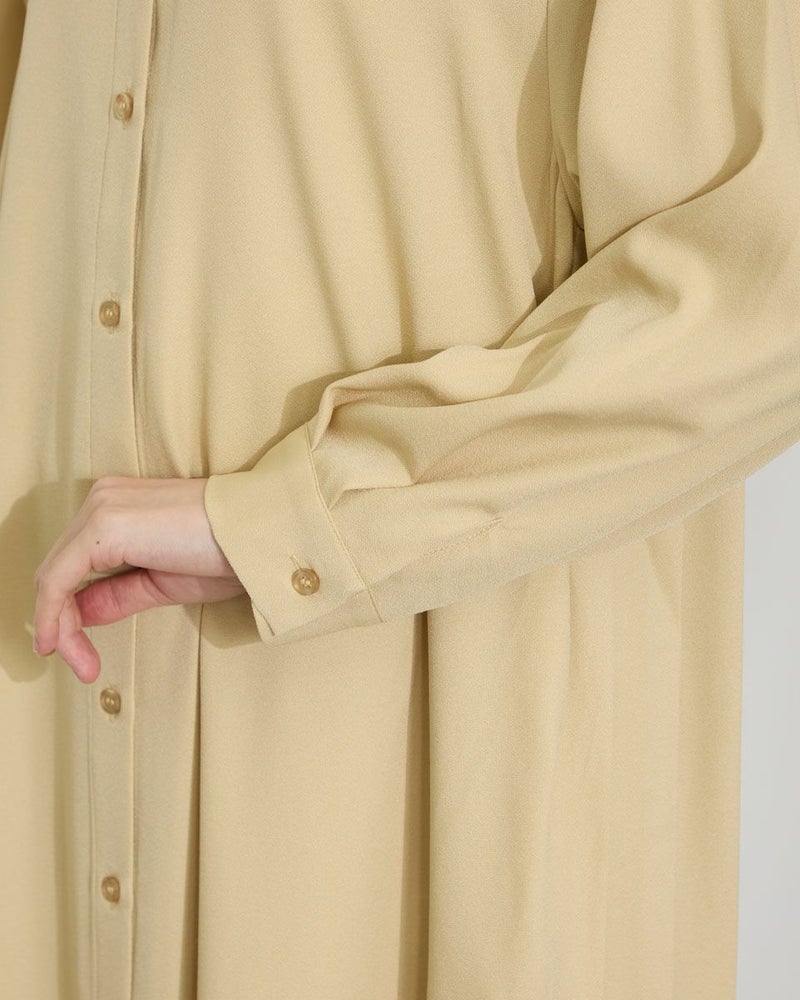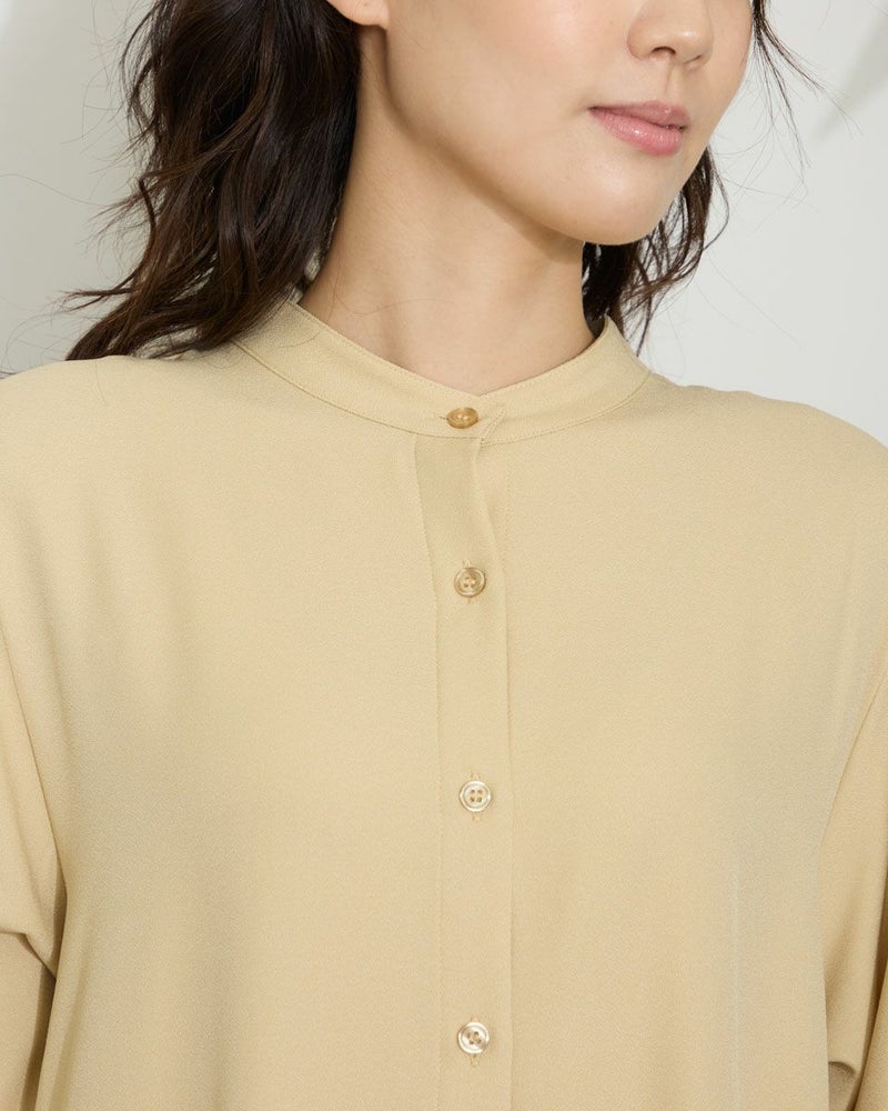 細かいシボが広がるジョーゼットは、フラットな薄手生地に比べ品の良さが際立ち大人世代におすすめです。背中に施したプリーツが歩くたびに揺れ表情豊か。シンプルなフロントにはロングネックレスを添えても素敵です。透け感を活かした羽織りのスタイルも、しなやかな生地が風にそよぎとても優雅なアイテムです。 モデル身長: 166 cm 着用サイズ: M サイズ Golden Bear White Label (WOMEN) ブラウス (WOMEN) 【着用アイテム】467Q4412 ボーダータンクトップ