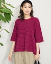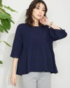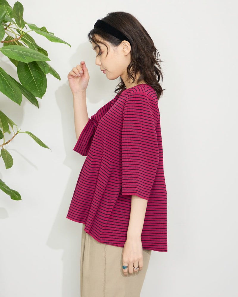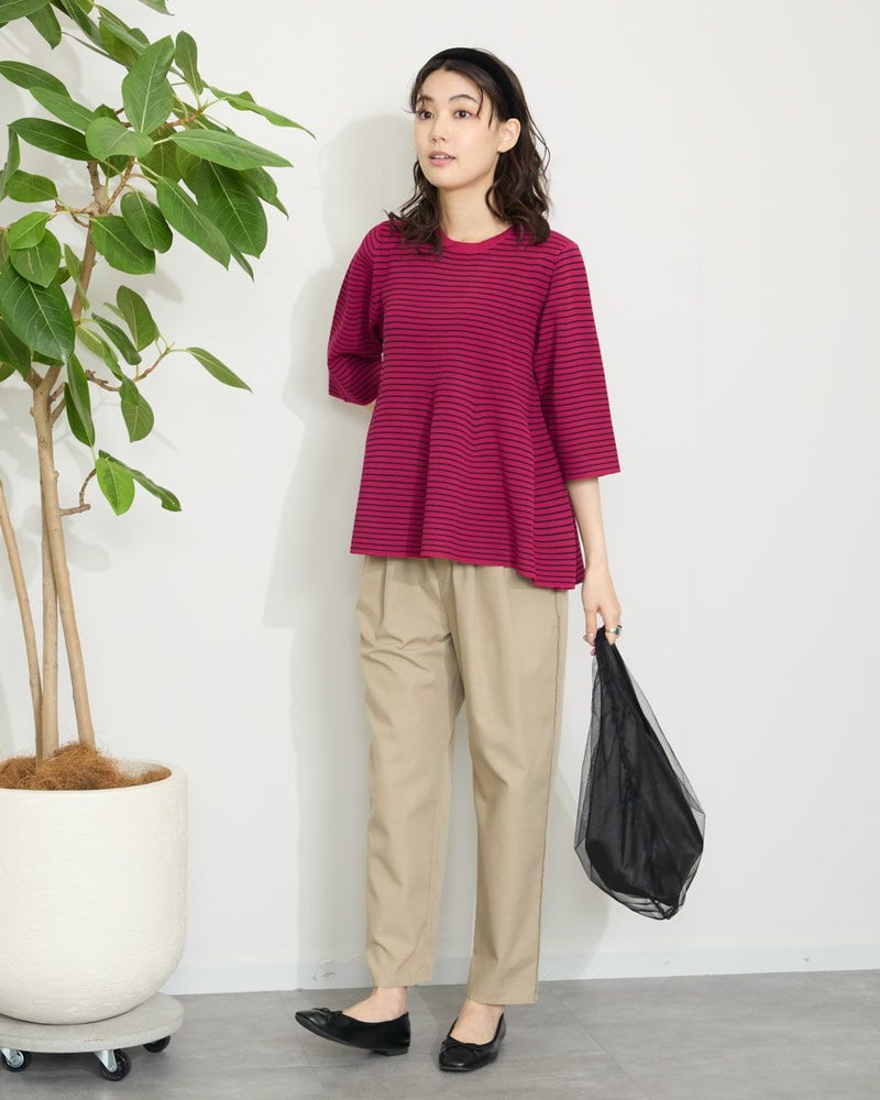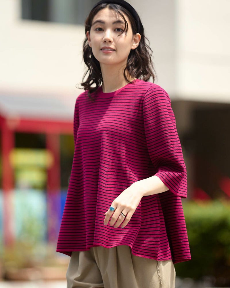 2ミリほどのタテ畝が隙間なく並ぶ片畔の編地は身体のシルエットを拾い過ぎず、適度な厚みが初秋までのスイッチシーズンに便利です。バスト下から揺れるフレアは編地の弾力でダレず上品な雰囲気。パンツを合わせた方がバランスが取りやすくジュエリーを添えてオフィスや食事会でお召しになってもOKです。