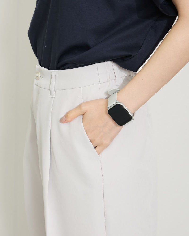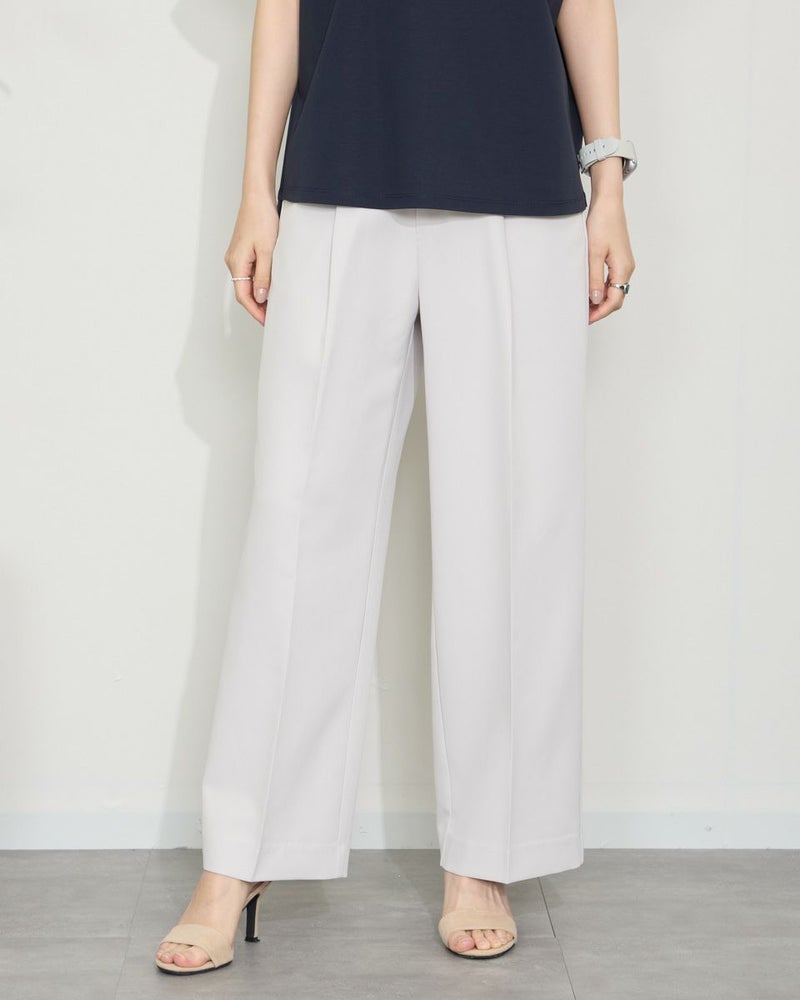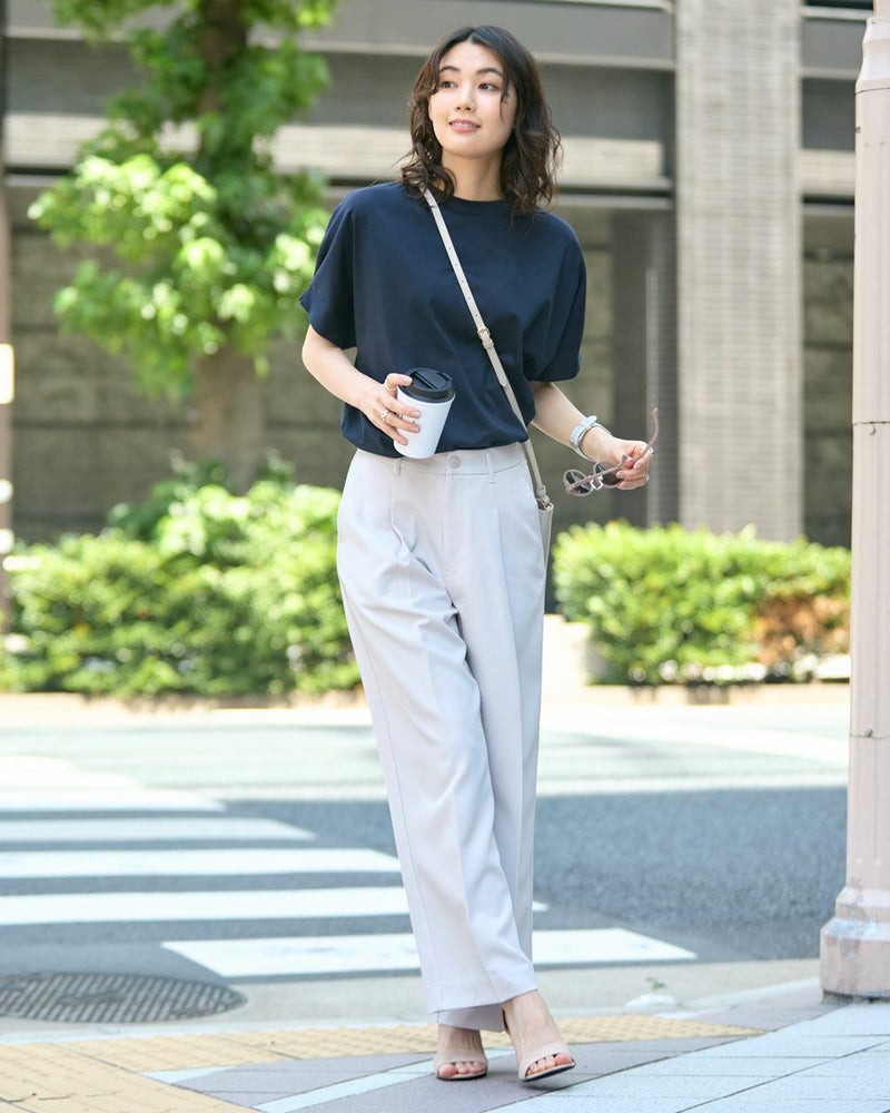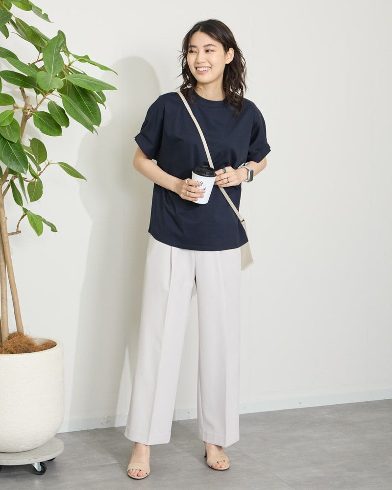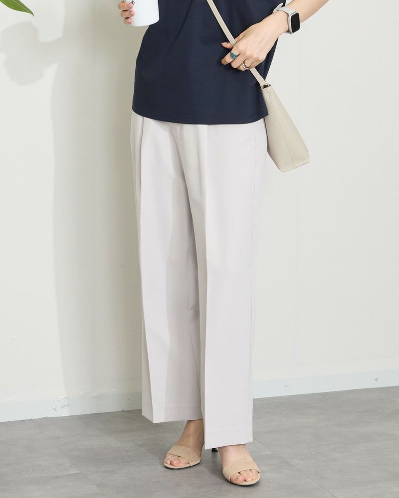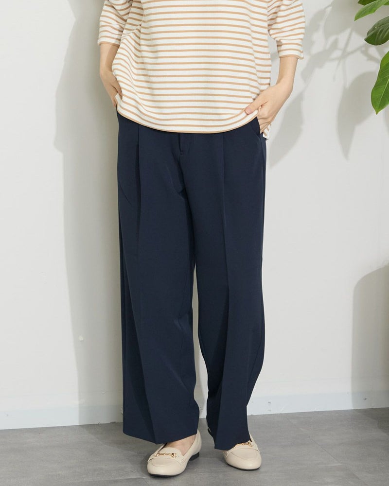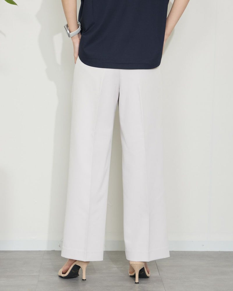 ほどよい弾力と表裏ともに整った織り目が心地良い二重織り調の生地を使っています。ワイドな筒部分にダレ感も無く、ほのかな光沢で清潔感がありオフィスや学校行事での着用もおすすめです。万能なネイビーの他、スモーキーなアイボリーは上品さもあり白過ぎないため、晩夏や初春にも使えるアイテムです。 モデル身長: 166 cm 着用サイズ: 64 サイズ Golden Bear White Label (WOMEN) ボトムス (WOMEN) 【着用アイテム】468QA470 布帛コンビボーダーカットソー 468QB461 ハイネックプルオーバー