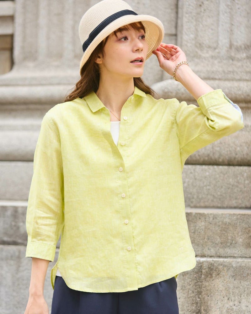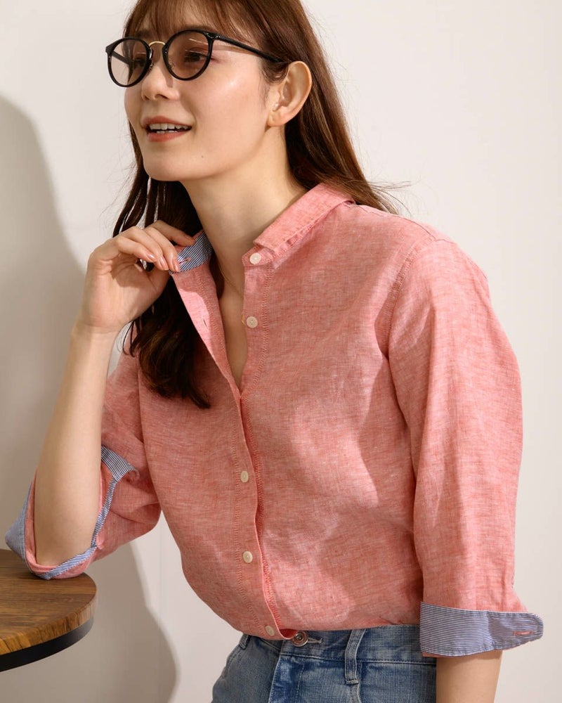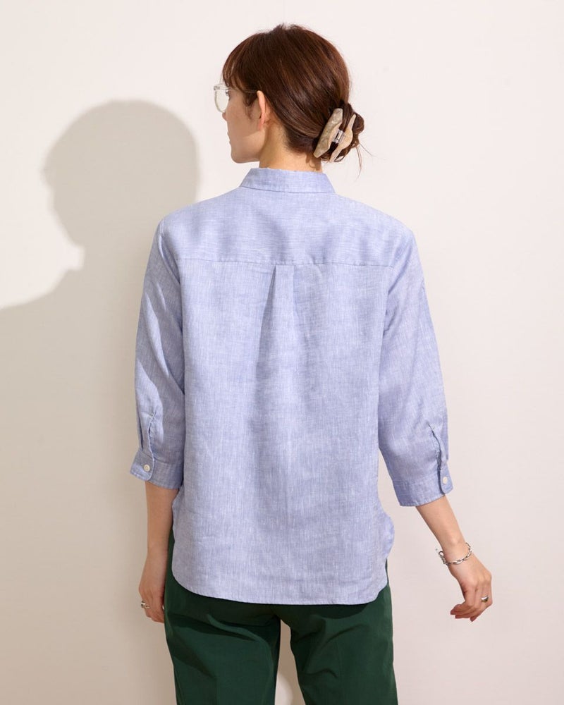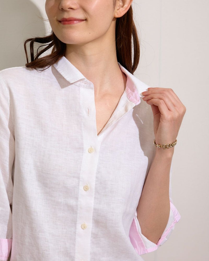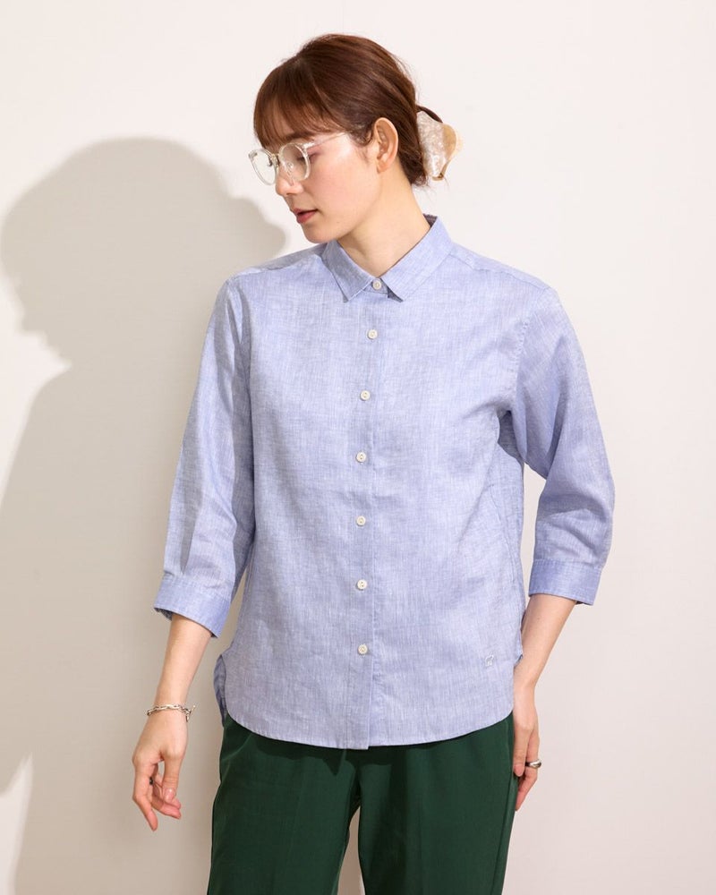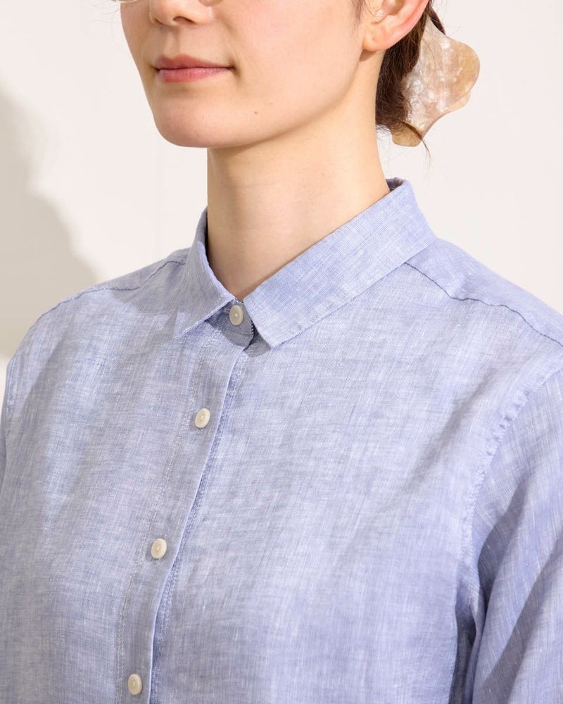 フレンチリネン100%のシャツです。イージーケアでシワになりにくいのが特徴です。表面の凹凸感を滑らかにする加工で、縮みやシワを防ぎ、キュアリングという加熱加工で効果を定着させています。そのキュアリングという熱処理加工。一般的に3分160度と短い時間、高熱で処理するところを、24時間35度と長時間、低温で行うことで形態安定と柔らかさを両立させました。別布にストライプ生地を使用して着用時のアクセントに。裏糸の配色もさりげなくポイント。メンズと同素材で展開しております。