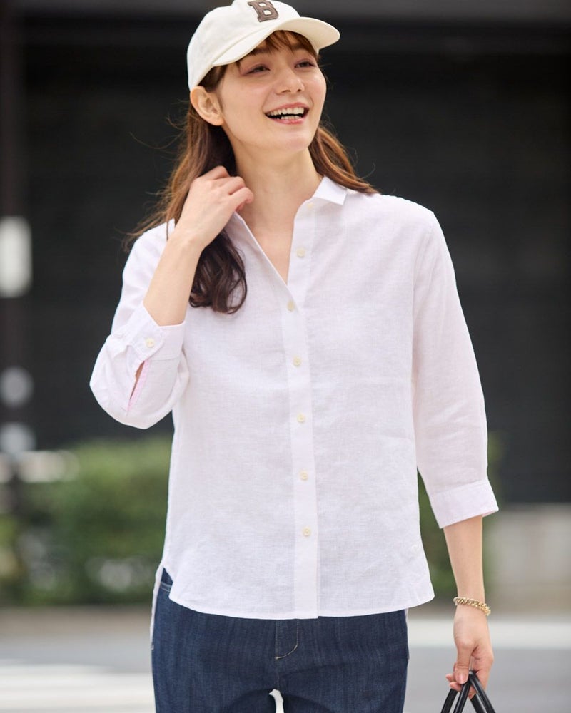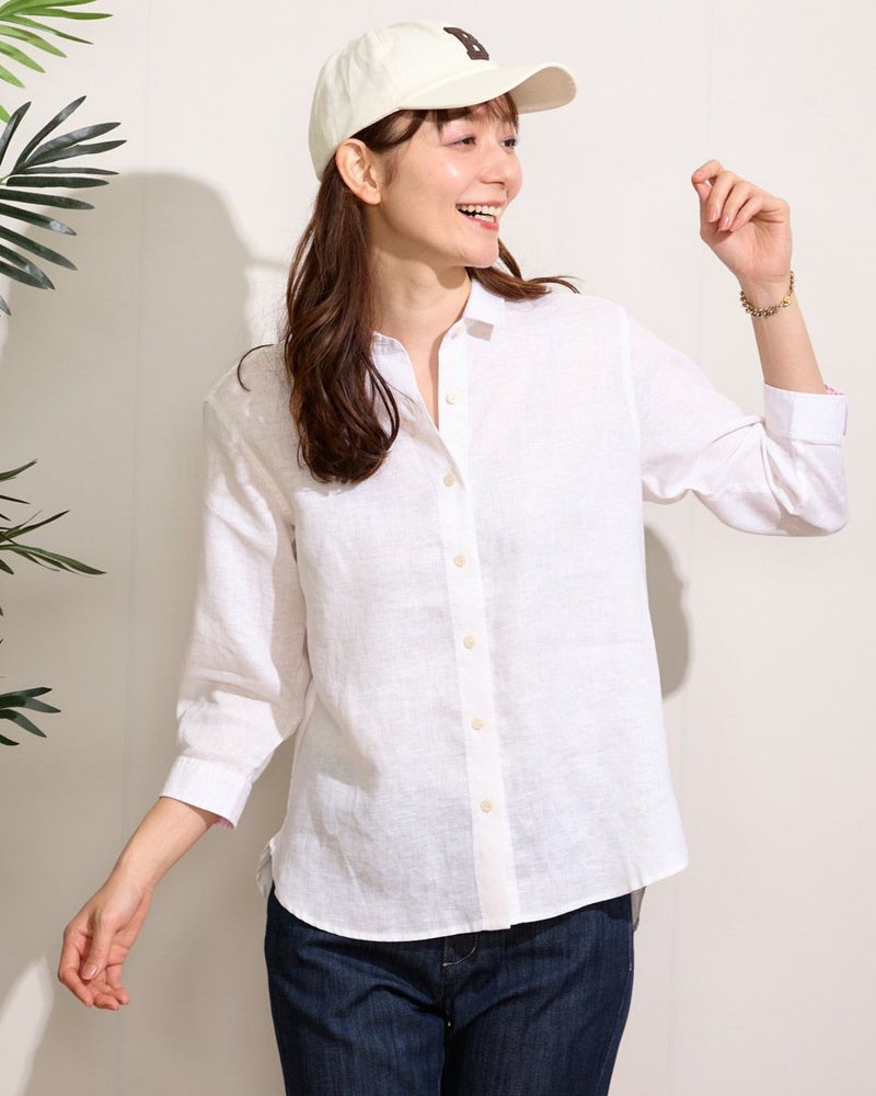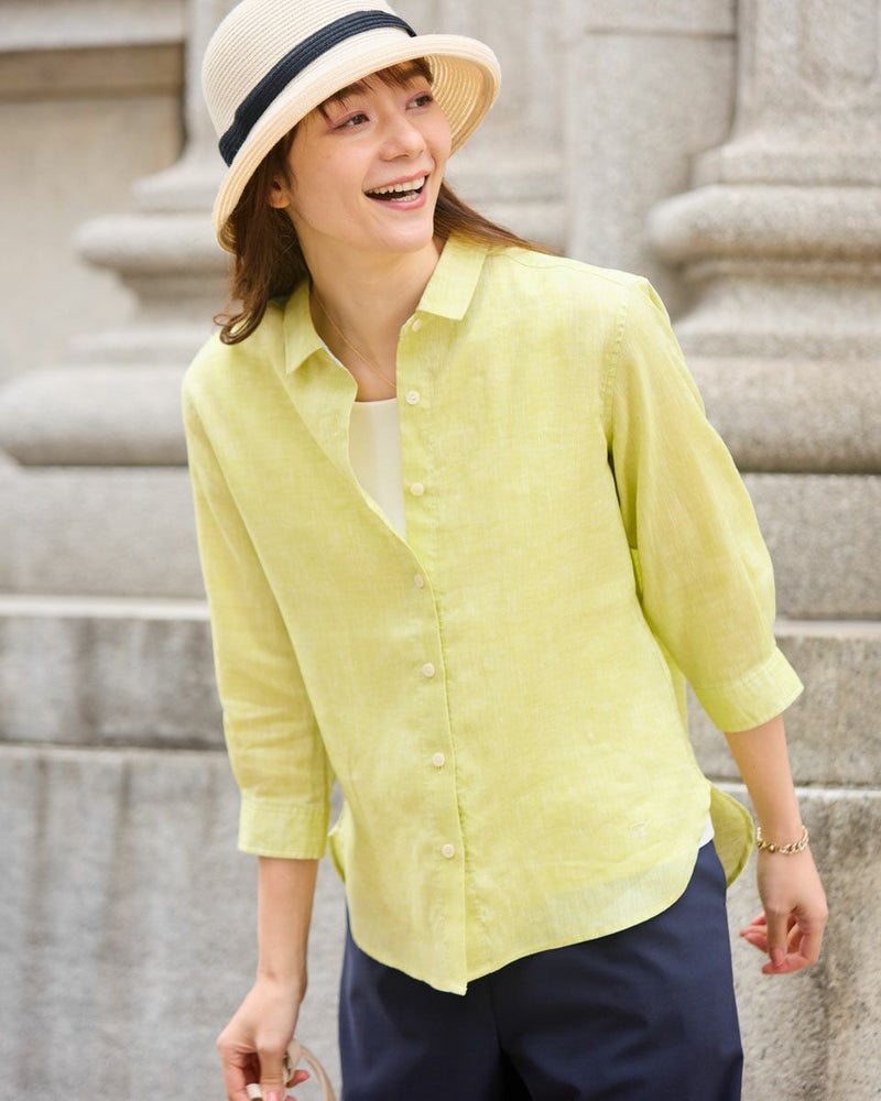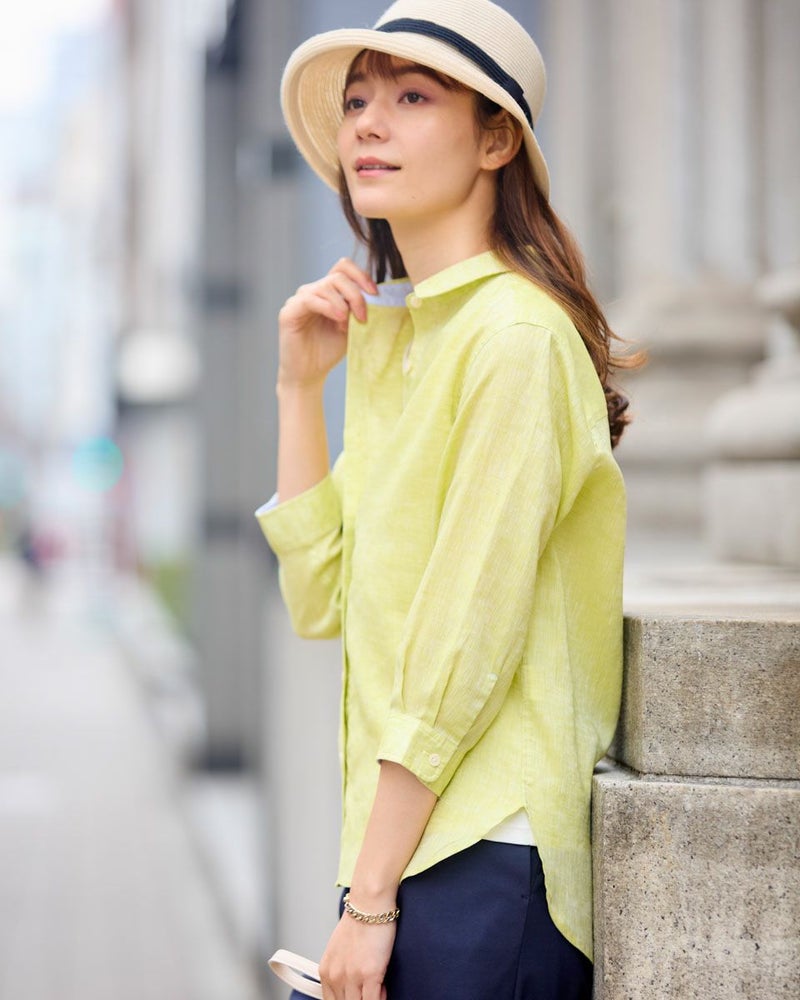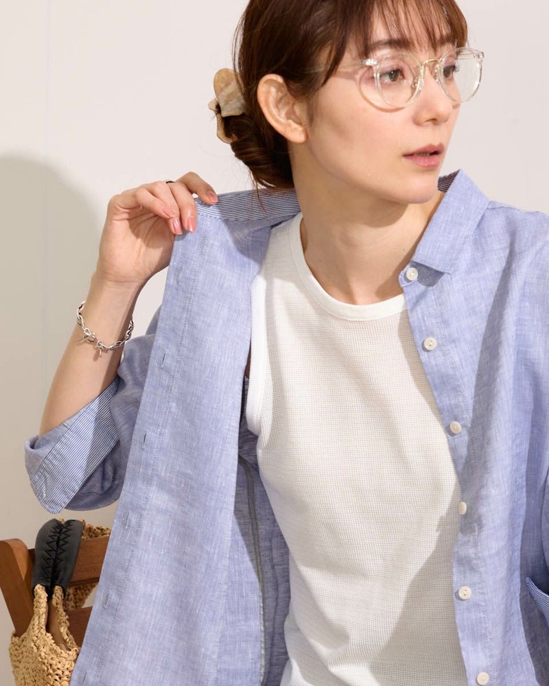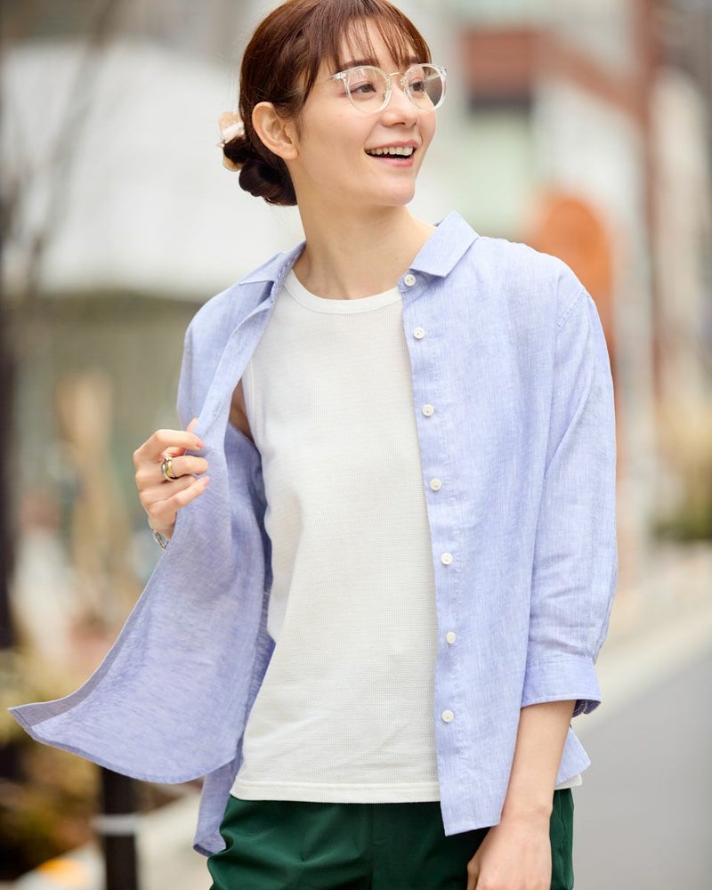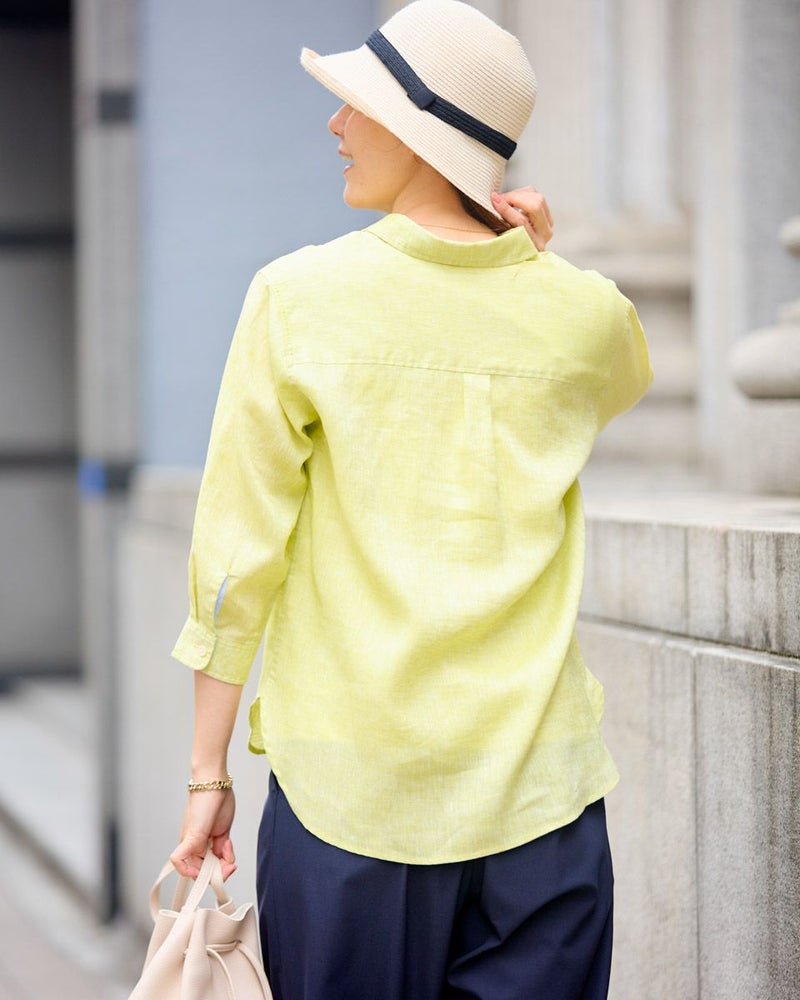フレンチリネン100%のシャツです。イージーケアでシワになりにくいのが特徴です。表面の凹凸感を滑らかにする加工で、縮みやシワを防ぎ、キュアリングという加熱加工で効果を定着させています。そのキュアリングという熱処理加工。一般的に3分160度と短い時間、高熱で処理するところを、24時間35度と長時間、低温で行うことで形態安定と柔らかさを両立させました。別布にストライプ生地を使用して着用時のアクセントに。裏糸の配色もさりげなくポイント。メンズと同素材で展開しております。