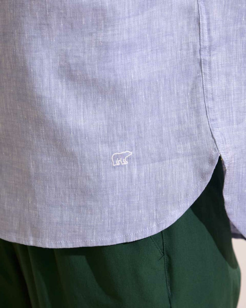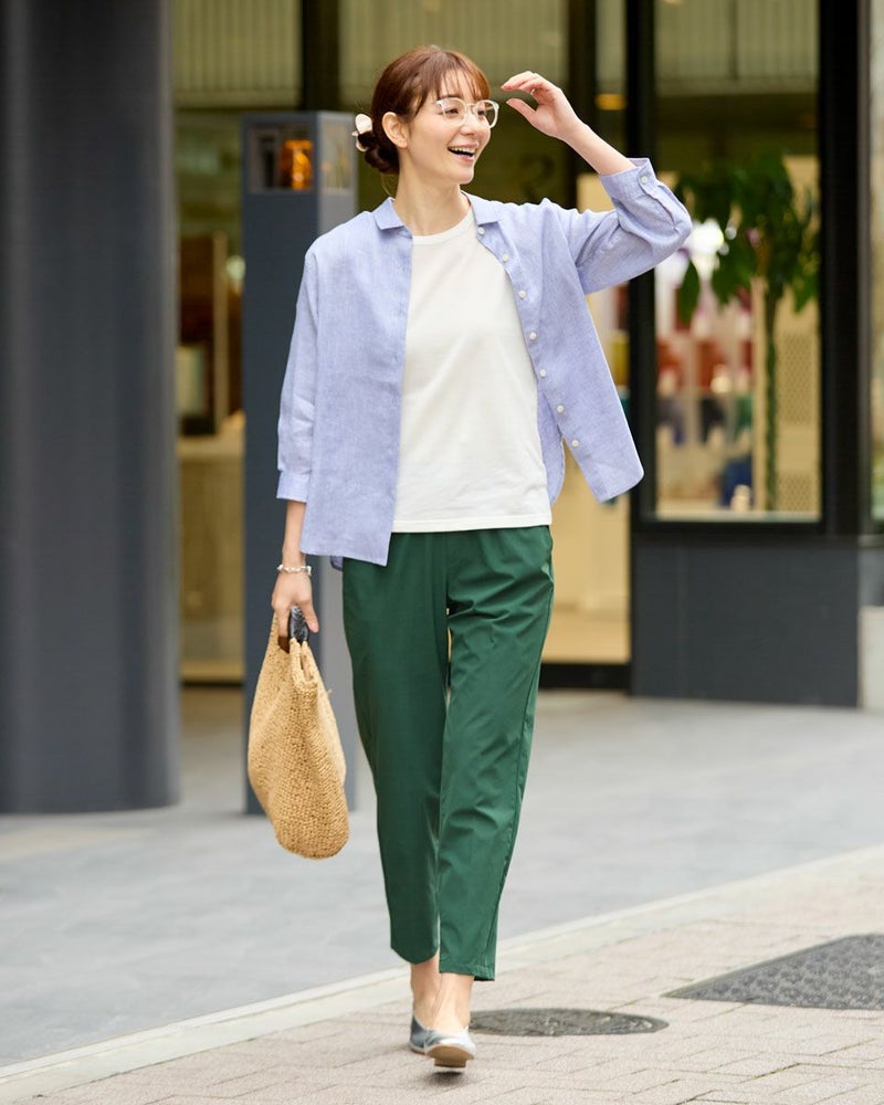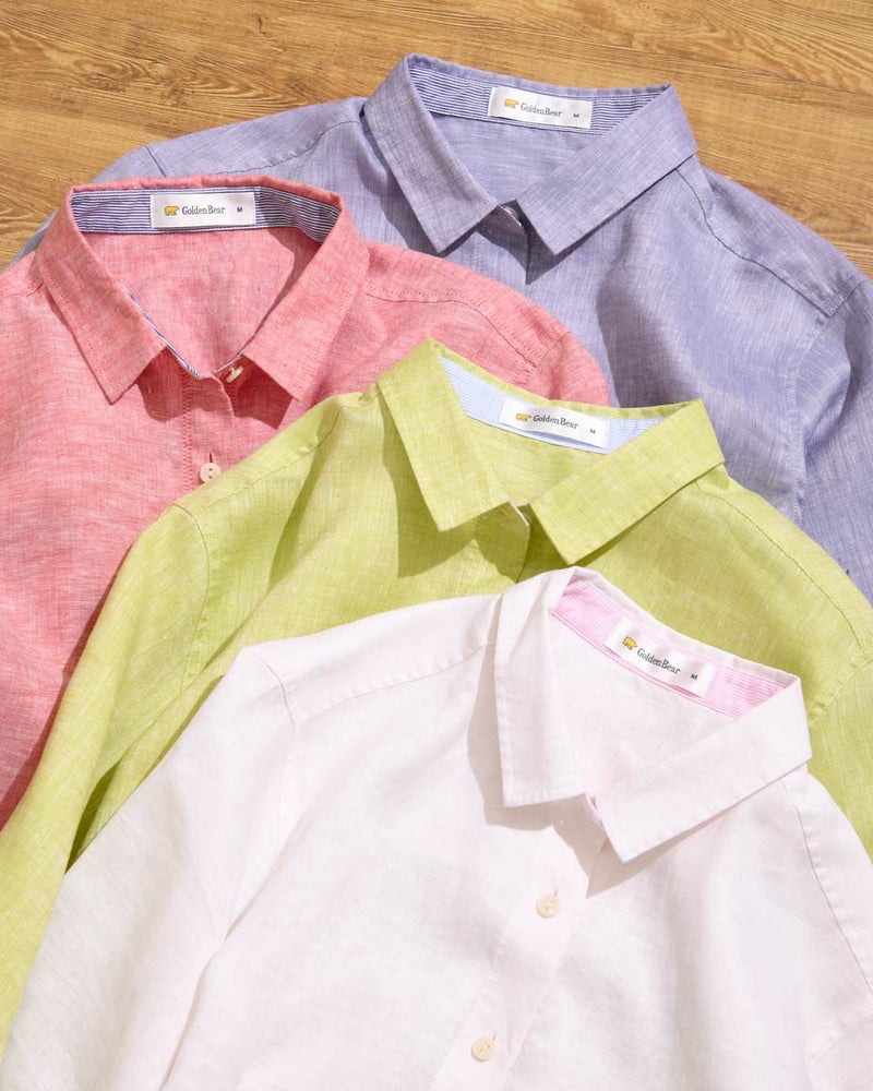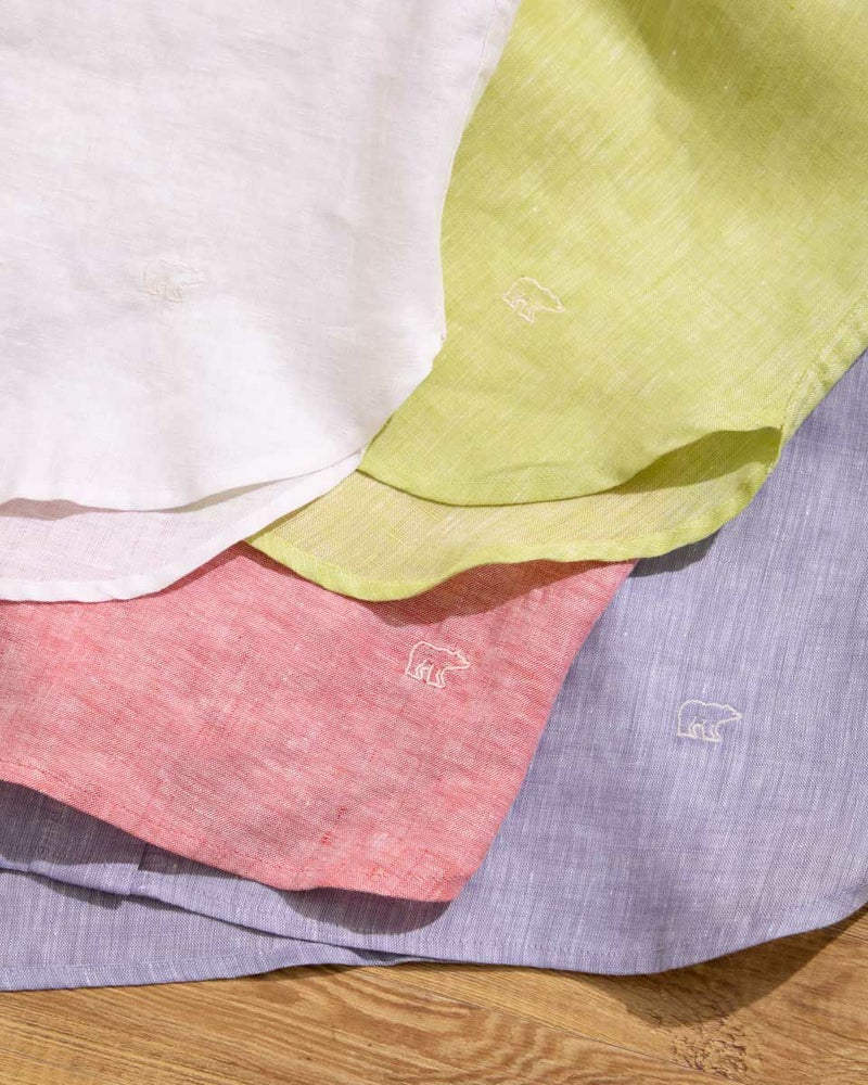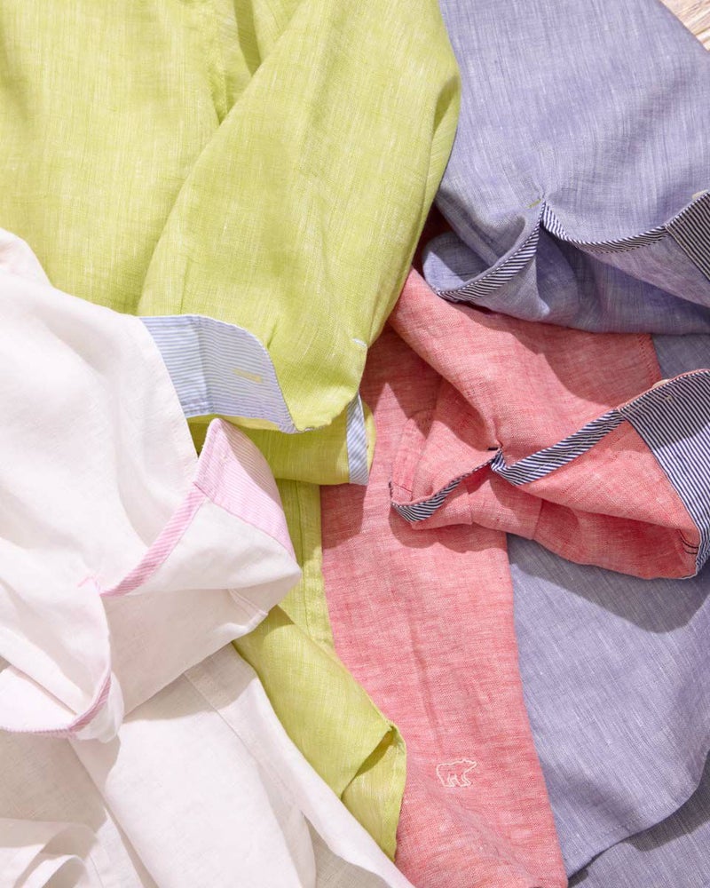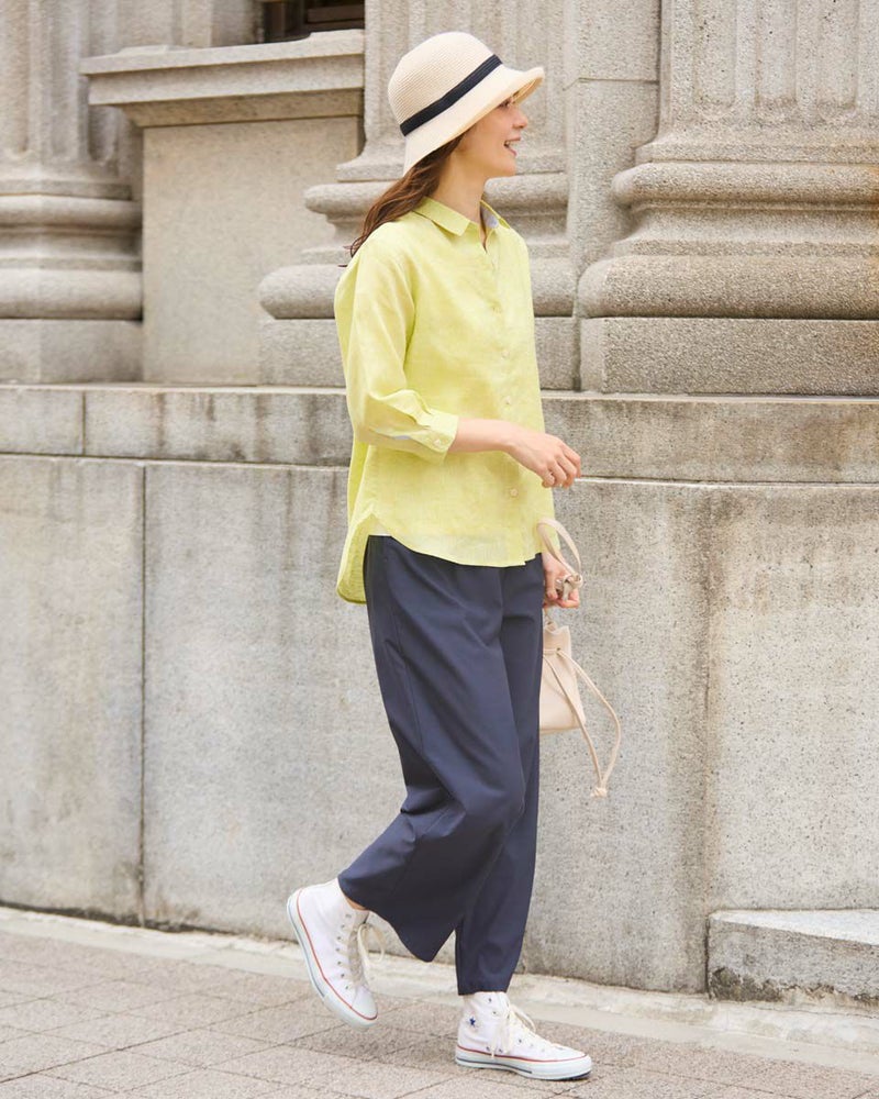 フレンチリネン100%のシャツです。イージーケアでシワになりにくいのが特徴です。表面の凹凸感を滑らかにする加工で、縮みやシワを防ぎ、キュアリングという加熱加工で効果を定着させています。そのキュアリングという熱処理加工。一般的に3分160度と短い時間、高熱で処理するところを、24時間35度と長時間、低温で行うことで形態安定と柔らかさを両立させました。別布にストライプ生地を使用して着用時のアクセントに。裏糸の配色もさりげなくポイント。メンズと同素材で展開しております。