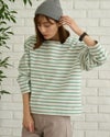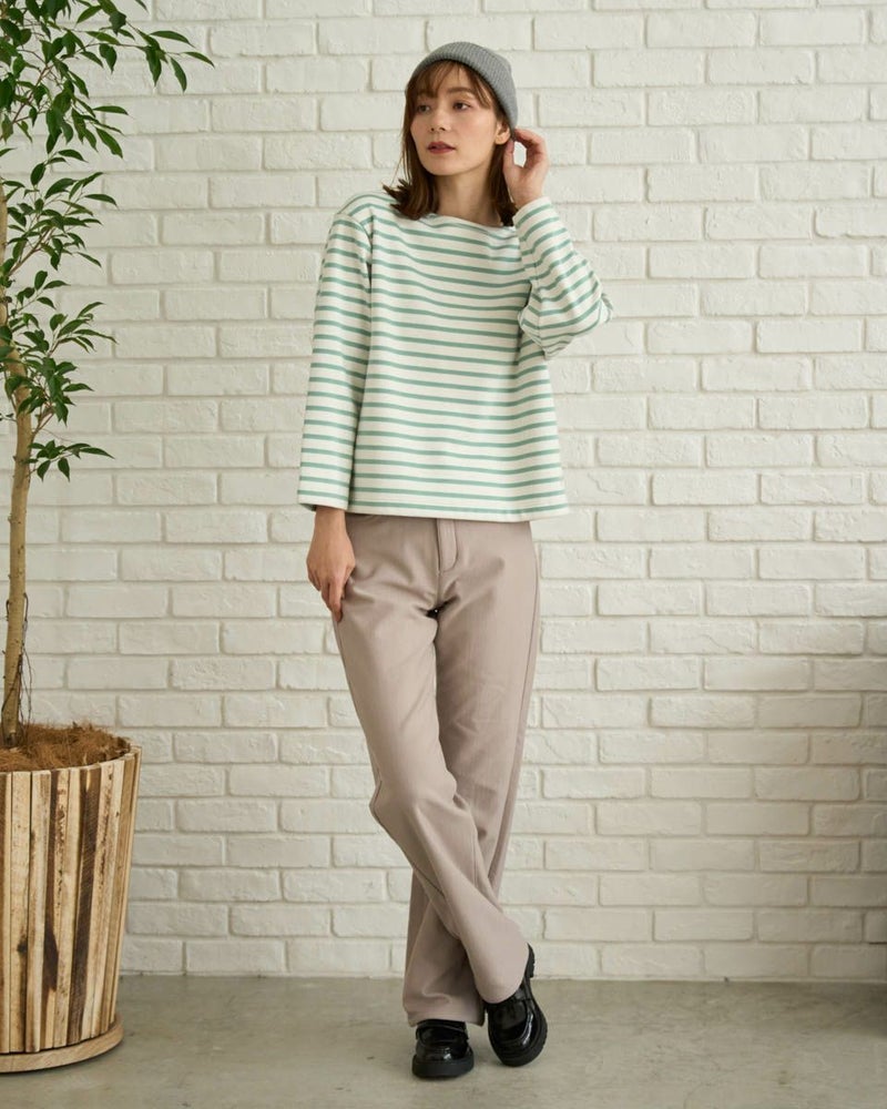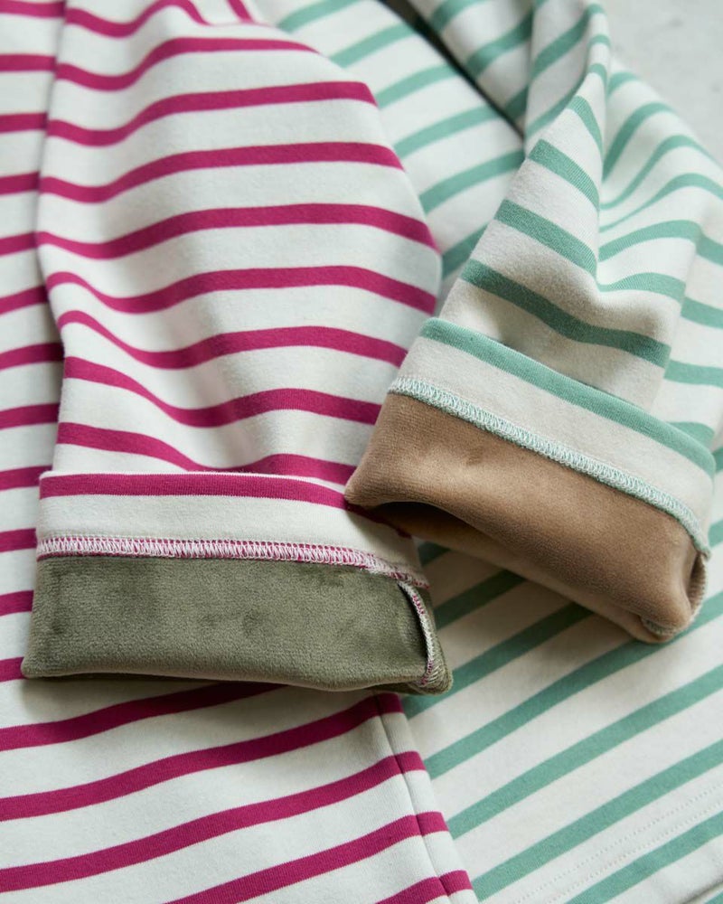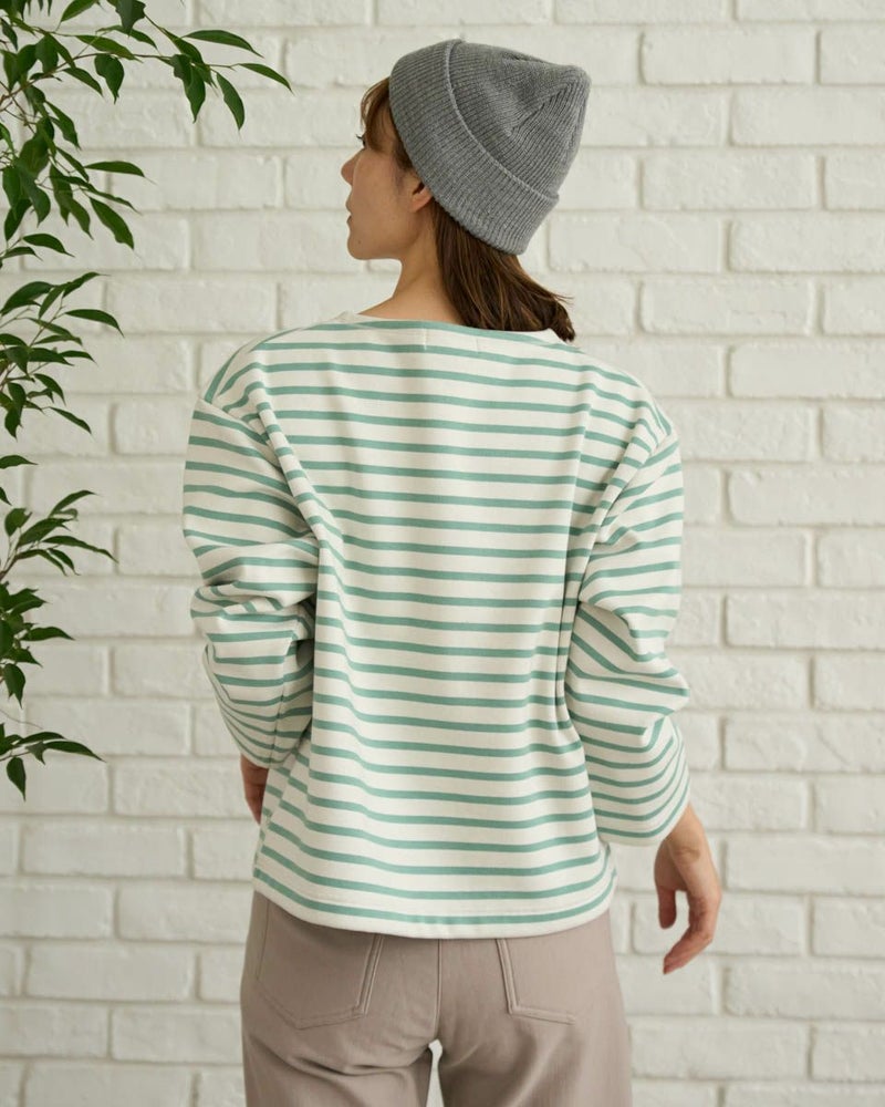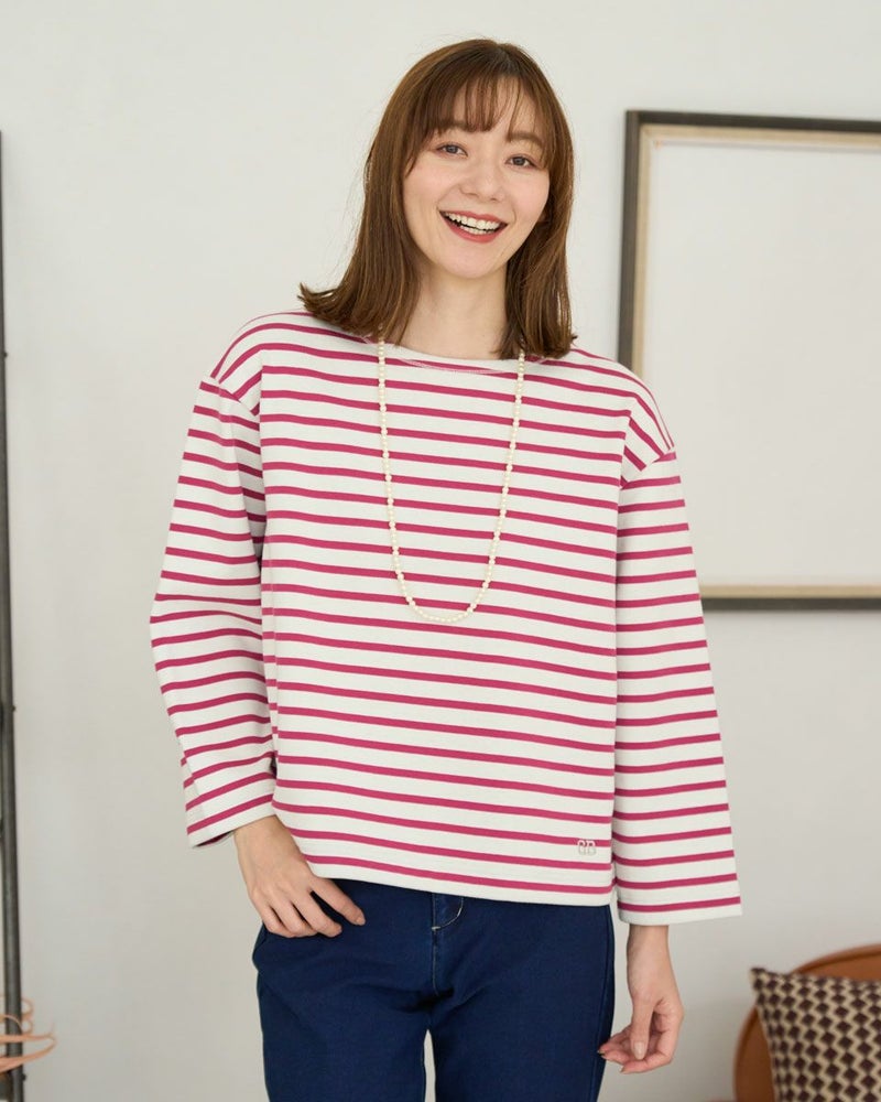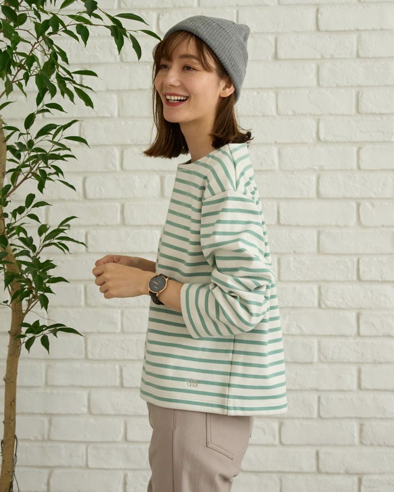 裏にシャギーフリースをボンディングしたボーダーTシャツ。明るく軽めな印象ですが裏のシャギーのタッチがソフトで暖かく、寒い時期におすすめのアイテムです。フューシャピンクとエメラルドグリーンのボーダーカラーもポイントです。