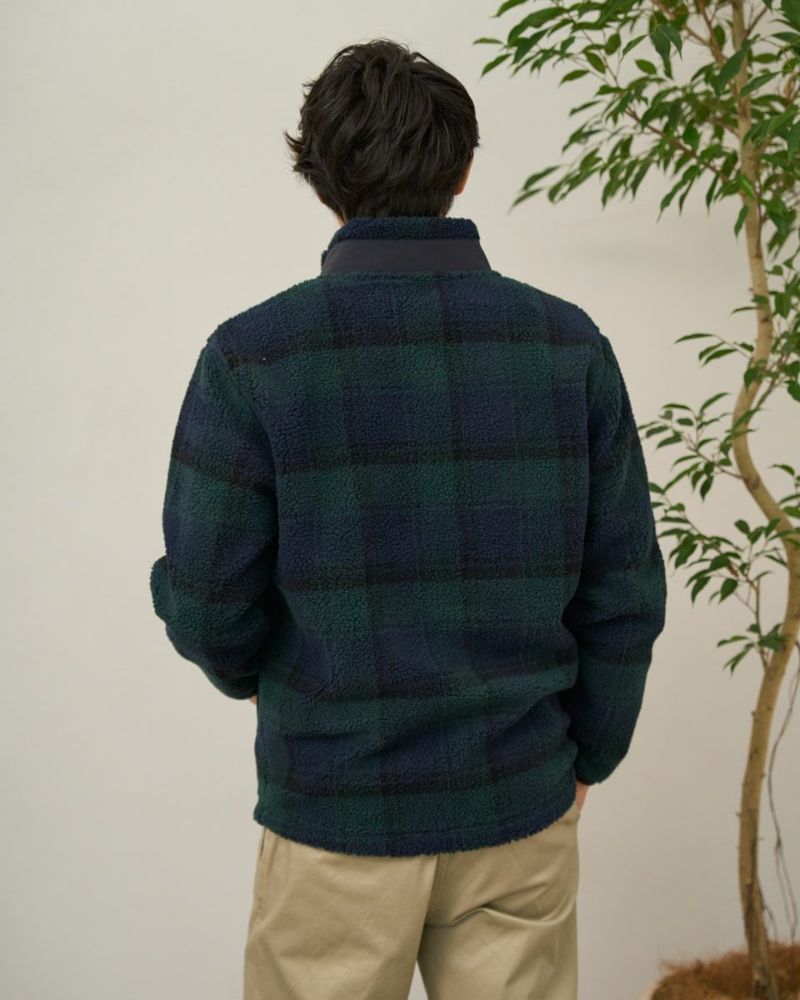 スタンドカラーのZIPブルゾンです。暖かみのあるシープボア素材を使用しています。大柄のチェックをプリントしトラッドな印象に仕上げました。アウターとして軽く羽織れる気軽さが魅力です。 モデル身長: 180 cm 着用サイズ: L サイズ Golden Bear Men's カットソー (Men's) 【着用アイテム】314QE672 モックネックニット 314QD611 クルーネックニット 314QE224 チェックシャツ 314Q3095 ニットタイ