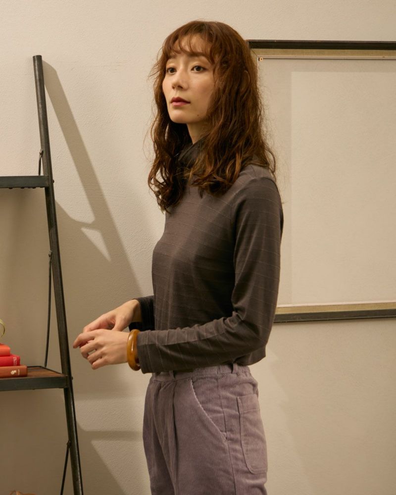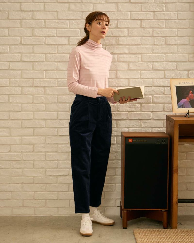 吸湿発熱機能がついたジャカードボーダーの素材を使用したタートルネックTシャツ。インナーに着用しやすいカラーを4色展開で作りました。ボーダー柄も控えめですがよく見るとカラー糸を2色使用した凝ったデザインです。タートルネックですが、ゆったりとした襟周りで圧迫感なく着用できるのもポイントです。 モデル身長: 171 cm 着用サイズ: M サイズ Golden Bear QUEEN SIZE(Ladies' 大きいサイズ ) カットソー (Ladies') 同デザイン通常サイズはこちら