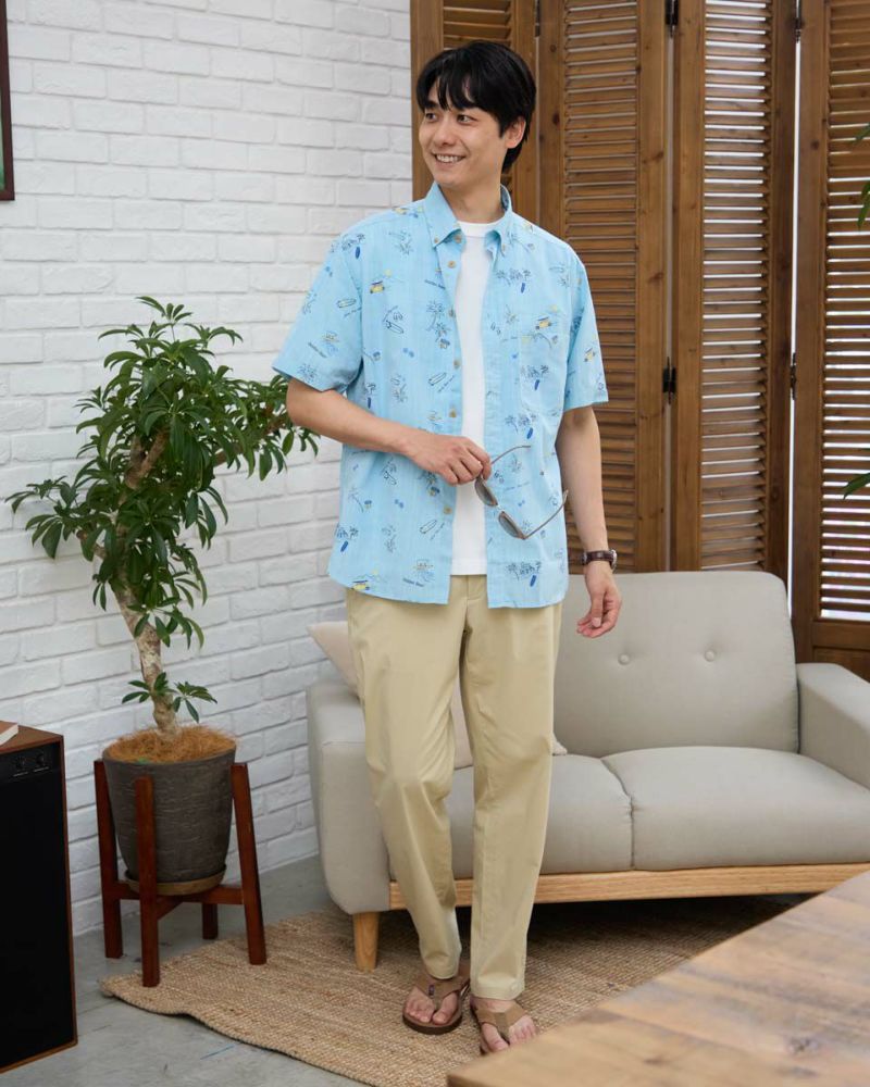 ボタンダウン襟のプリントシャツです。涼感のあるシャンブレー生地にサーフィンをモチーフにした楽しさを感じるプリントを施しました。大きめの胸のダブルポケットと幅広いヨーク切替、太めのステッチなどゆるい雰囲気に仕上げました。サイズ感もややゆったりとしたリラックスシルエットです。 モデル身長: 180 cm 着用サイズ: L サイズ 同デザイン通常サイズはこちら Golden Bear KING SIZE(Men's 大きいサイズ) シャツ (Men's)