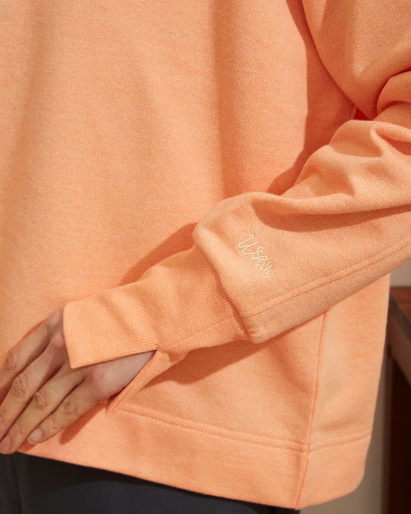 裏面に細かいループが渡り肌当たりも優しいインレイを使ったプルオーバー。裏毛よりも厚みや重さが抑えられるため冬から春へ、スイッチする時期にとても便利。コンパクトな着丈とボックス型のシルエットでラフな見た目ですが、後ろ袖を切り替えたり袖口のリブを長くしスリットを開けてモード感のある辛口なディティールに仕上げています。袖のリブは折り返すことも可能。長い状態で着ると肌が見え隠れし手元がお洒落に見えるのでおすすめです。生地の中の白糸を残したことで明るい色味がマイルドになり優しい日差しに溶け込んでいきます。