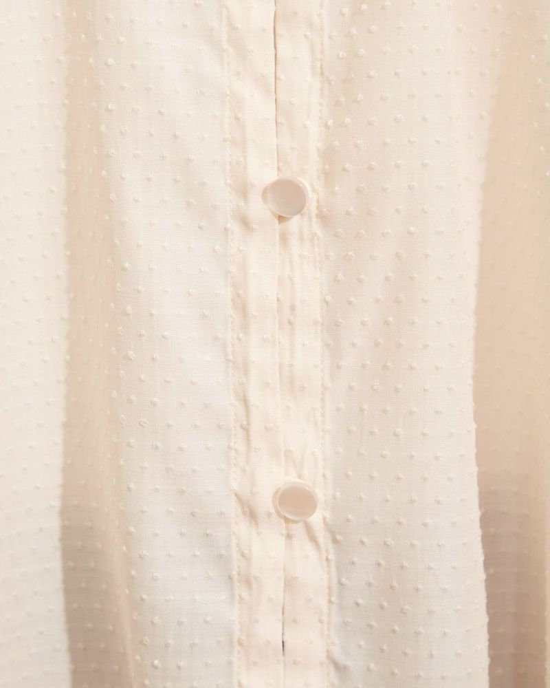 マットでしなやかな生地には小さく織り込んだドットが並び、光を反射し時々光る様子がとても綺麗。襟元に通したヒモをキュッと絞るとフリル状になった襟が立ち上がりとても華やかに。フロントで軽く蝶結びにしてお召ください。フェミニンな雰囲気なのでオフィスや在宅業務での着用もおすすめ。気温に応じてカーディガンやジレを羽織ってもOK。ボタンを全て開け羽織る時は襟をゆるく絞り小さく隆起させると顔回りに立体感が出て可愛い表情に。柔らかく女性らしさがある為、綺麗めなボトムスの他、カジュアルなアイテムとのミックスコーディネートも素敵です。