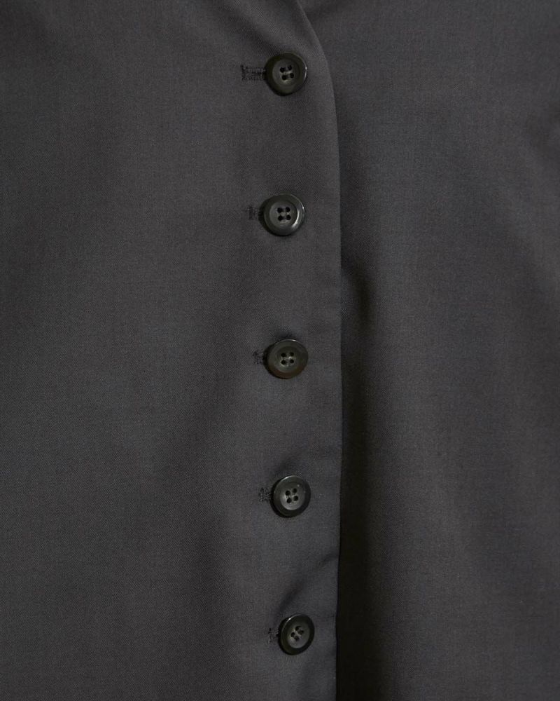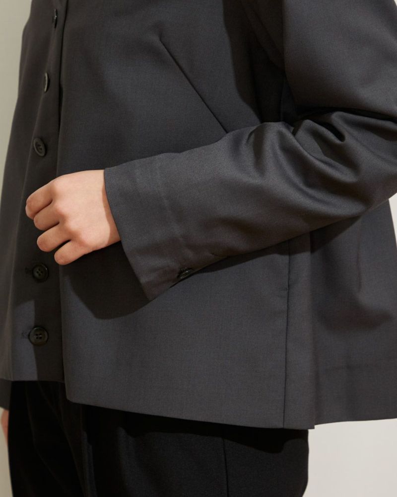 細かくツイルに織り上げた素材を使ったノーカラーのジャケットです。ほのかな光沢と整ったキメの細かさが上品なアイテム。腰骨ほどの着丈でボトムスを選ばないところも便利。フロントに並べたボタンがポイントになっているため、ポケット口は脇に付いています。後身頃には少しフレアを取っているため、柔らかいゆとりで身体に張り付かずフェミニンな雰囲気です。ニットやブラウスに羽織ったオフィススタイルはもちろん、コサージュやパールを添えてセレモニーでお召しになっても素敵です。オフィスの置きジャケットとしても使えて便利です。