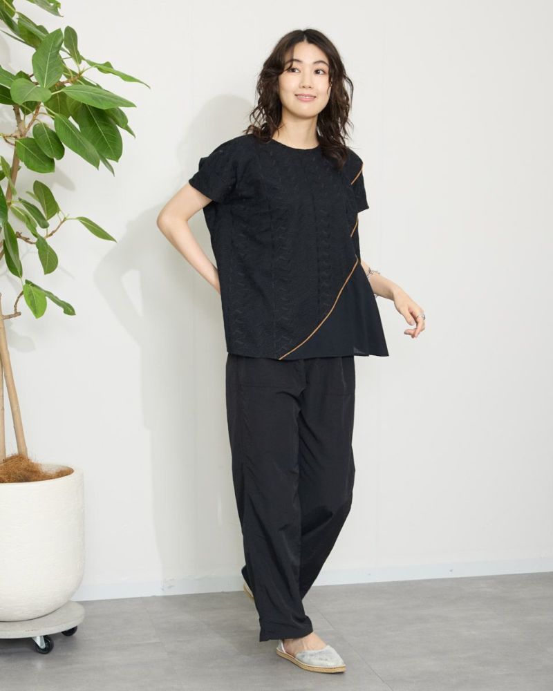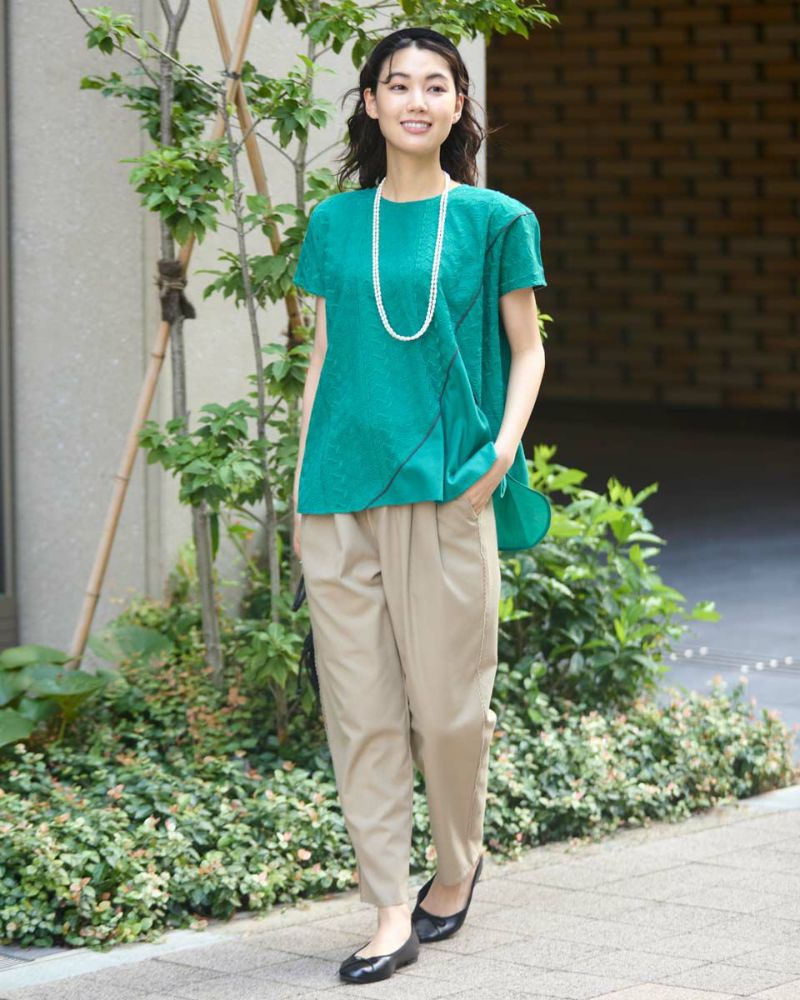 生地表面の細やかな凹凸がナチュラルで優しいコットンの生地です。伸びやかなツルが印象的な草花を表現した刺しゅうを施し、無地とブロッキングしたデザインブラウスです。暑い日差しに負けない黒と強いグリーンのボディは、晩夏まで使えメタルやビーズのアクセサリーと好相性。ボトムスを変化させオン・オフでお召しいただけます。 モデル身長: 166 cm 着用サイズ: M サイズ Golden Bear White Label (Ladies') ブラウス (Ladies') 【着用アイテム】468QA751 イージーパンツ 468QB751 ベイカー風イージーパンツ