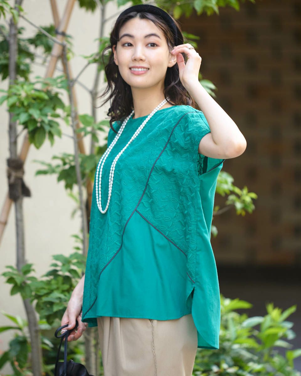 生地表面の細やかな凹凸がナチュラルで優しいコットンの生地です。伸びやかなツルが印象的な草花を表現した刺しゅうを施し、無地とブロッキングしたデザインブラウスです。暑い日差しに負けない黒と強いグリーンのボディは、晩夏まで使えメタルやビーズのアクセサリーと好相性。ボトムスを変化させオン・オフでお召しいただけます。 モデル身長: 166 cm 着用サイズ: M サイズ Golden Bear White Label (WOMEN) ブラウス (WOMEN) 【着用アイテム】468QA751 イージーパンツ 468QB751 ベイカー風イージーパンツ