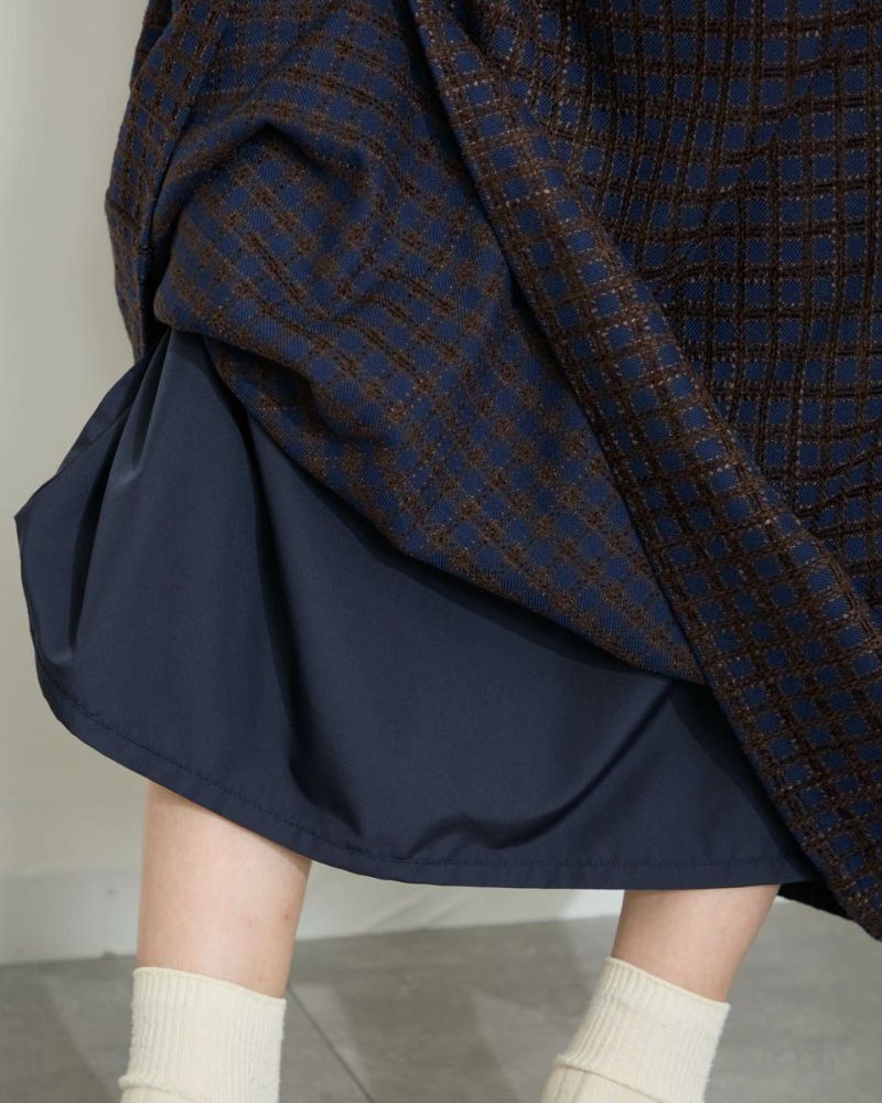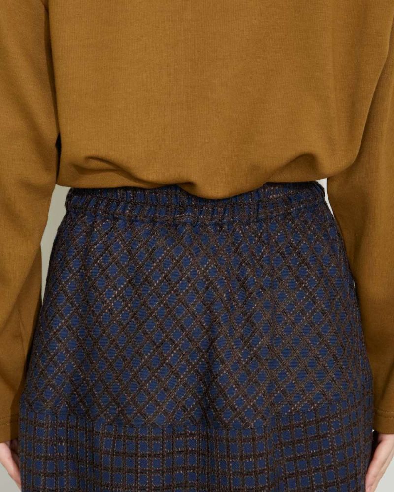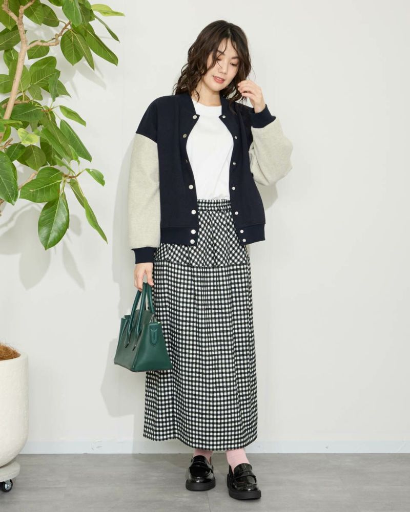 丸みを帯びたシルエットが裾に向かってすぼまっていくバルーン型のスカート。格子柄で可愛さのある生地ですがミモレ丈で足を隠した姿が聡明な品の良さも感じる1着になっています。着脱に便利な総ゴム仕立て。裏地が付いているのでタイツとの摩擦も無くお召しいただけます。8mmほどの格子部分にはプクプクとした凹凸が可愛いモール糸を使っているため温かみも感じ表情豊かな風合いが魅力になっています。トップスはスウェットでカジュアルダウンすると可愛いです。パンプスやブーツとの相性も抜群です。 モデル身長: 166 cm 着用サイズ: M サイズ Golden Bear White Label (Ladies') ボトムス (Ladies') 【着用アイテム】467QC402 ロゴTシャツ 467QC430 カット羽織り 467QD434 スタジアムジャンパー 468QD751 スカート 467QC002 ショルダーバッグ