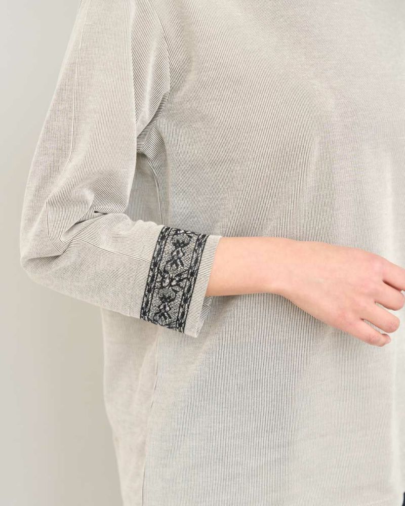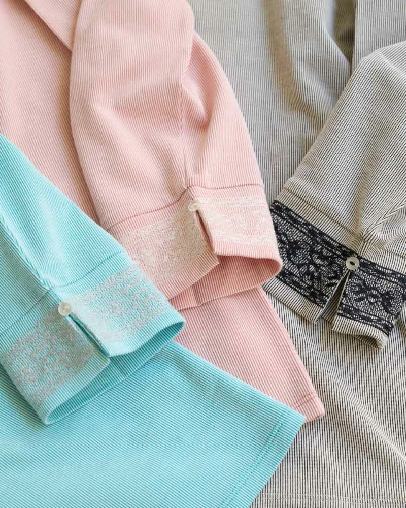 ヨコ方向のテンションに優れた生地は着心地が良く、春夏のラインナップでもお馴染みの素材。細かくストライプに編んでいるため無地見えし他のアイテムとも相性抜群です。重ね着にも便利なセットインスリーブ仕立て。アンティークのレースをイメージした刺しゅうで飾った袖口が可愛らしく初夏まで1枚着をお楽しみいただけます。甘さを抑えたピンクカラーは顔映りを明るくし大人世代におすすめの春カラーです。 モデル身長: 167 cm 着用サイズ: M サイズ Golden Bear White Label (Ladies') カットソー (Ladies') 【着用アイテム】468R2750 テーパードパンツ 468R3760 ストレートパンツ