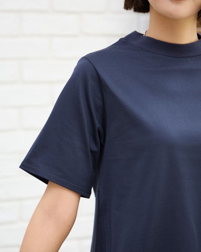 キメが整い、ほどよいツヤもある生地は砕けすぎず大人世代にお薦め。首に馴染み着脱しやすいようにハイネック部分には伸縮性のあるスパンフライスを使用。首周りの肌露出が抑えられ上品に見える点が支持される半袖Tシャツです。リラックス感のあるボクシー型ですが後ろ裾に加えたフレアが揺れ女性らしい柔らかさもある1着。前裾に施した6cm幅のレースがアクセントになり1枚着も楽しめるアイテム。