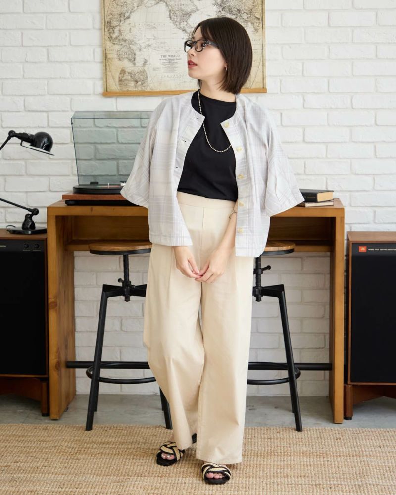 親しみのある折り紙のやっこさんのような形のアイテム。ドルマンスリーブでアームホールに切り替えがなく袖下で生地のたわむ様子にこなれた雰囲気がある所も素敵なポイント。薄く、ほのかに透け感のあるベースに馴染むように織られたチェック柄がモダンで大人世代におすすめ。生地に表情があるのでサッと羽織るスタイルもサマになります。大ぶりのネックレスでパンチを効かせた着こなしも受け止めてくれる1着です。