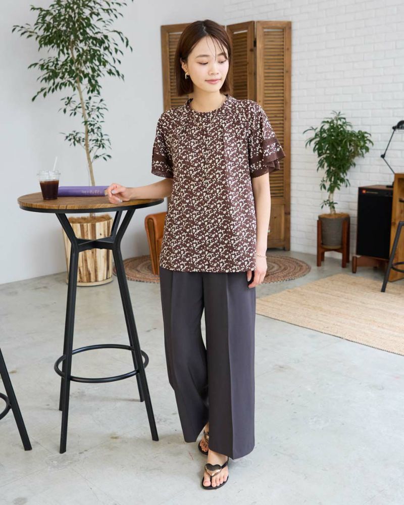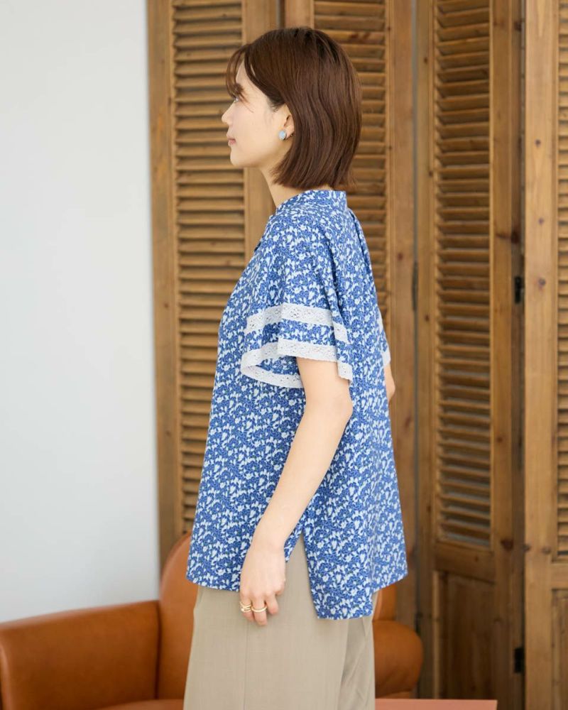 秋の収穫に向けて小さな実を付け始めたオリーブをイメージしたプリントブラウス。肩を優しく包むラグランスリーブは袖口のフレアが揺れ優雅で涼しげ。袖下の内側にマチを付けているため脇や下着が見えにくく1枚着もしっかり担います。素材がしなやかに落ちるため上品な佇まいが魅力です。蒼く茂る葉を落ち着いたトーンで表現し、全体的にシックなため初秋まで着用が可能。綺麗めなボトムスと合わせてオフィスや学校行事でお召しになっても素敵です。デニムやカゴバックとのカジュアルコーデも◎パールやスキンジュエリーで光を添えたコーデも梅雨どきの曇天に映えおすすめです。