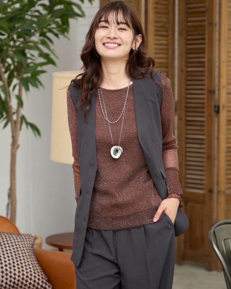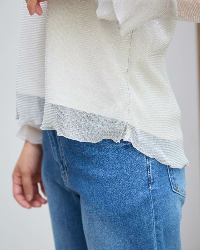 ドレスでお馴染みのチュールネットを使ったデザインカットソーです。小さな六角形の編み目が連続し編まれた素材はヨコ方向のテンションに優れソフトに身体を包みます。前後の身頃は天竺と2枚仕立てにして透けを遮断、インナーの透けを心配することなくお召しいただけます。袖はチュールの1枚仕立てですが一緒に編み込まれたシルバー糸の煌めきで肌の透け感、存在感が軽減されシアーアイテム初挑戦のお客様にもトライしやすい1着です。袖口のフレアが揺れ手先を綺麗に映します。ニュアンスのあるライトグレーはパーティー感がなく合わせやすい点もポイント。ジレを羽織ったり冬はスウェットを重ねても素敵です。