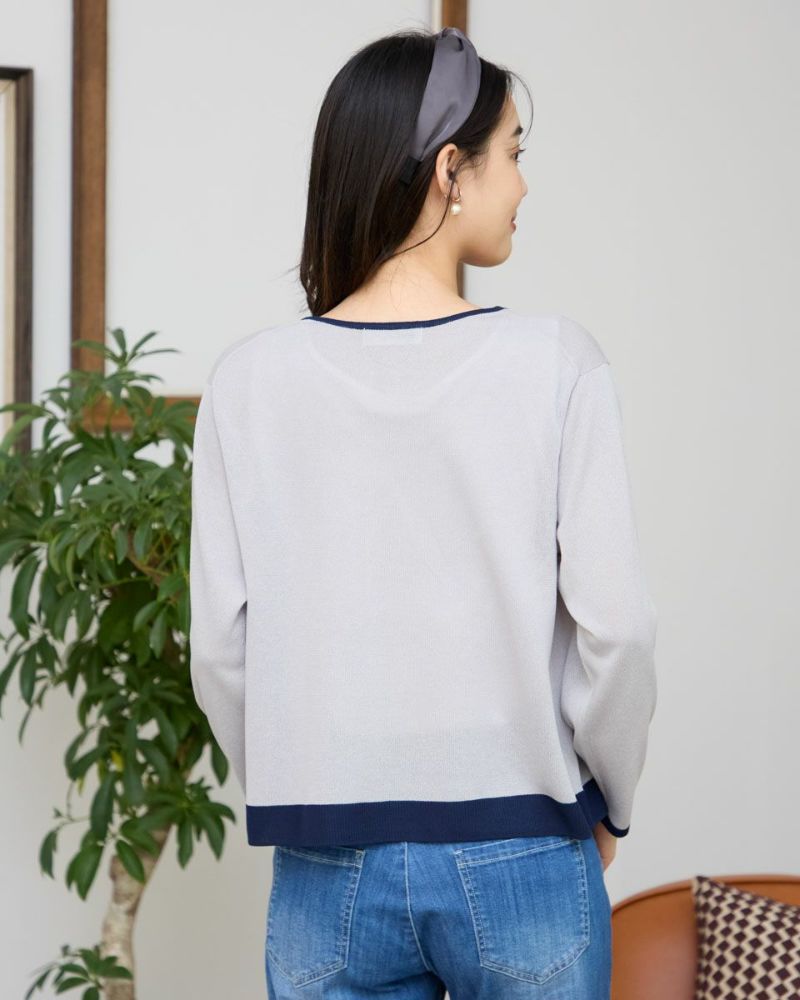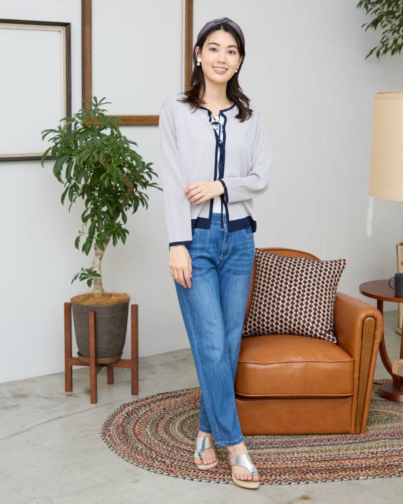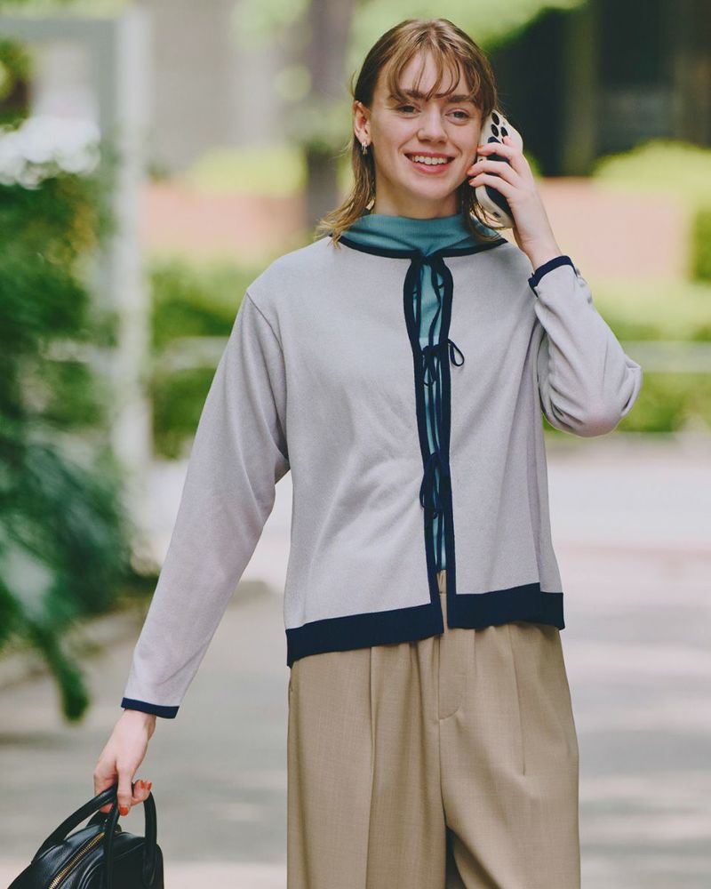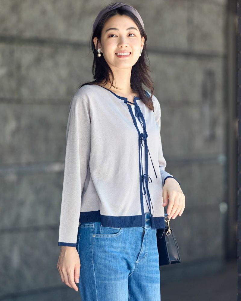ほどよいシャリみとツヤ感があるハイゲージの編地はキレイめな表情が魅力。長袖に設定したカーディガンですが毛羽感も無いため熱がこもらずサラッと肌当たりも涼やか。配色のトリミングとフロントのリボン使いがアイキャッチになる1着。セットインスリーブできちんとした印象もあるためオフィスや学校行事での着用もおすすめ。フロントのリボンは結んでポイントにしたり垂らしたままラフさを演出してもOK。フェミニンなアイテムなのでデニムと合わせたミックスコーディネートやカーディガンを主役にワンピースに羽織るスタイルも素敵です。ニュアンスのある落ち着いた配色は秋カラーとも馴染み10月頃までお召しいただけます。
