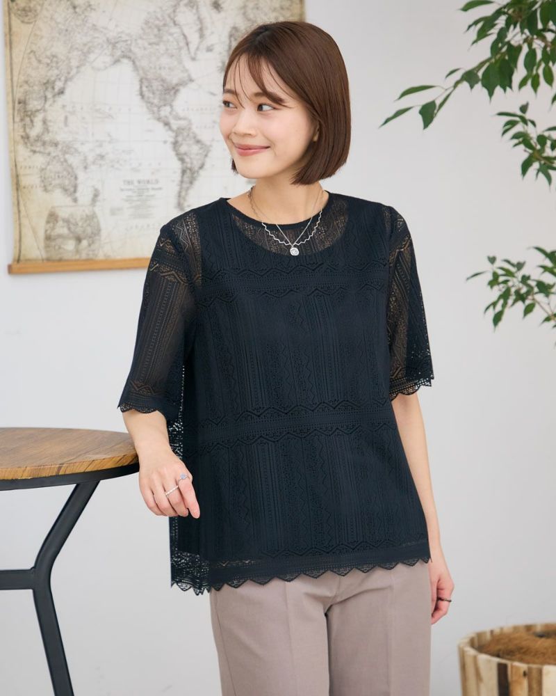 ポリエステル100%のラッセルレースを使用したブラウスです。裏地にキャミソールを付けています。デザインはノーカラーの後ろ釦開き仕様です。袖口と裾はレースの柄に合わせスカラ状にハンドカットしています。色はアイボリーとブラックの2色展開です。本体とキャミソールは取り外し可能です。