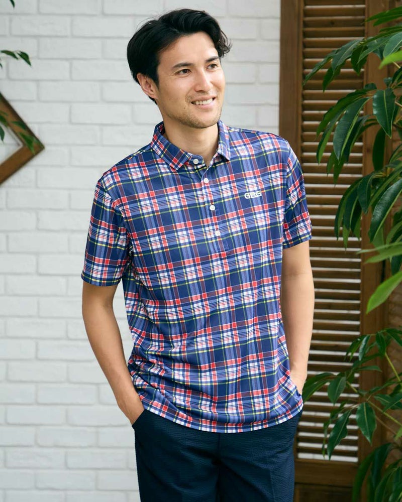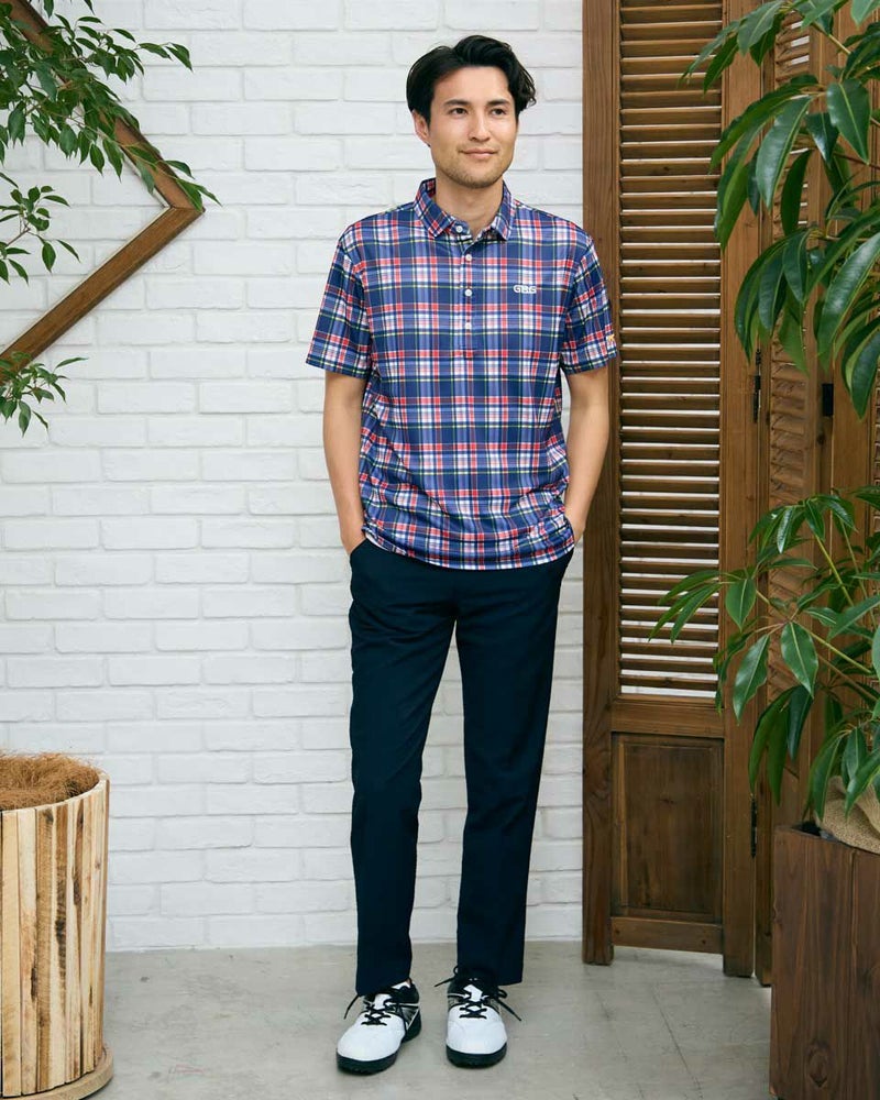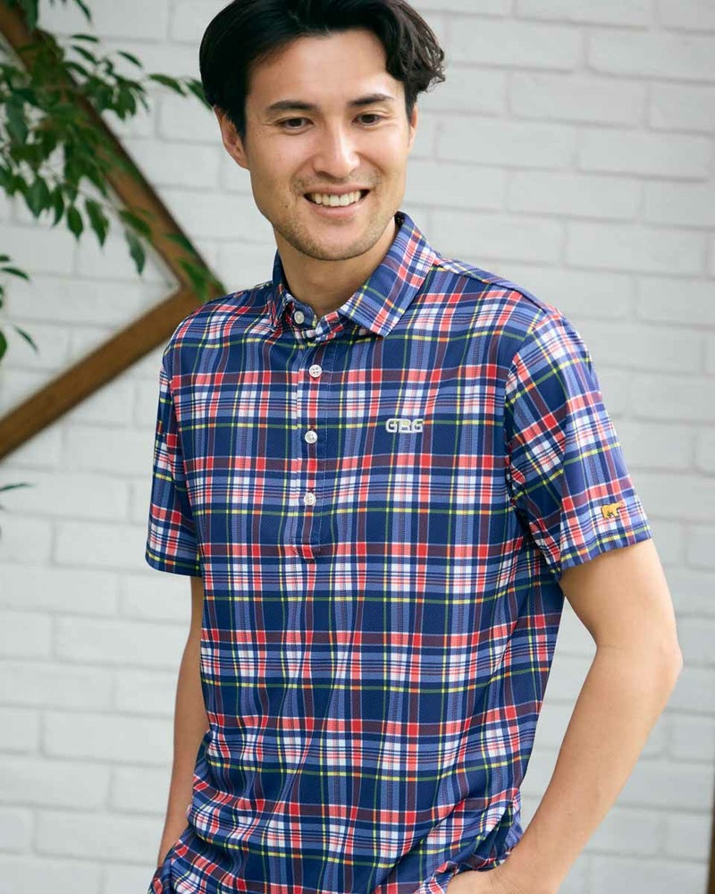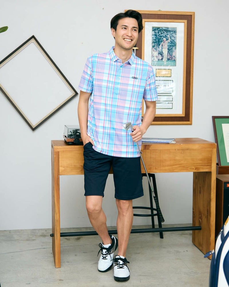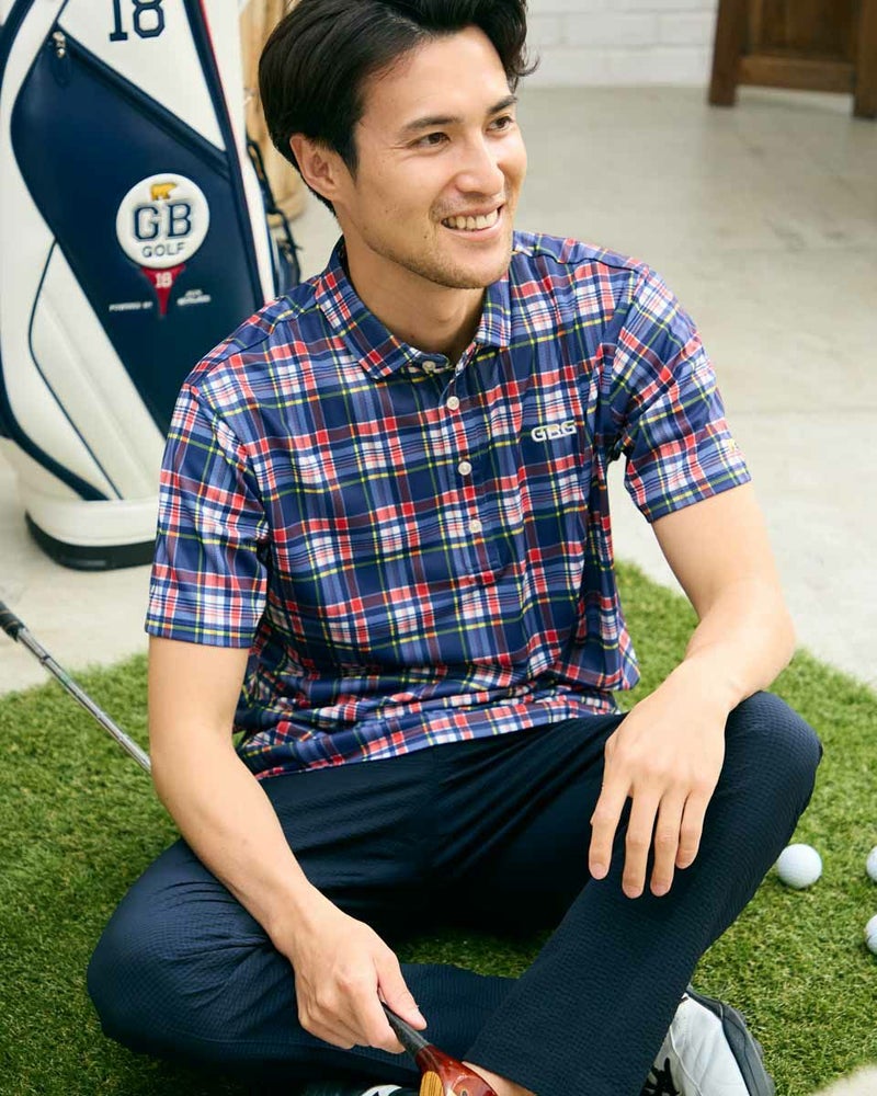 トラッドな柄を使用したポロシャツです。春夏らしい配色のチェックをプリントしました。 表面はポリエステルメッシュ、裏面にナイロンを入れた冷感素材を使用しています。是非“ヒンヤリ感”を体感してみてください!今シーズンを代表するイチオシアイテムです! モデル身長: 180 cm 着用サイズ: L サイズ GB GOLF カットソー (MEN) 【着用アイテム】 GBG バケットハット(品番:312R4001) GBG パンツ(品番:312R3702) メッシュキャップ(品番:312R4002) TRAD ショーツ(品番:312R5710)