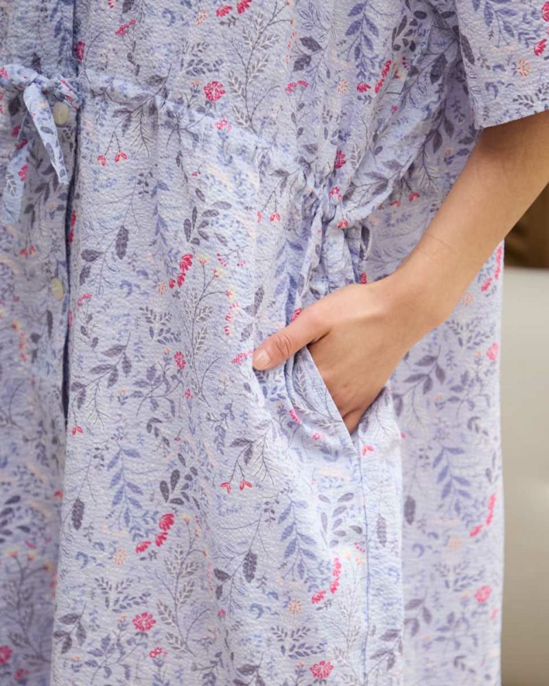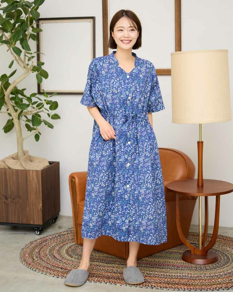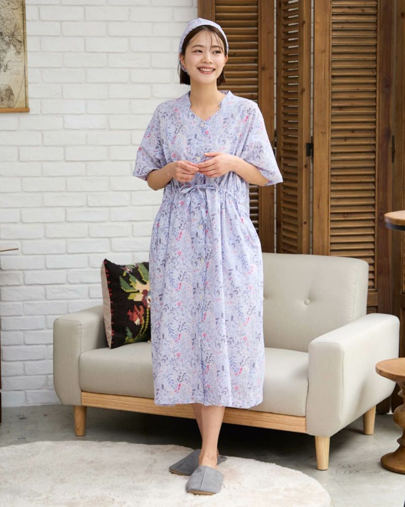リラックスタイムに最適な花柄ワンピースパジャマです。ゆったりとしたサイズ感と、綿100%快適性をお楽しみください。日常のカジュアルウェアとしても着用して頂けます。