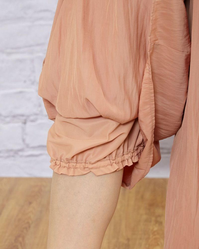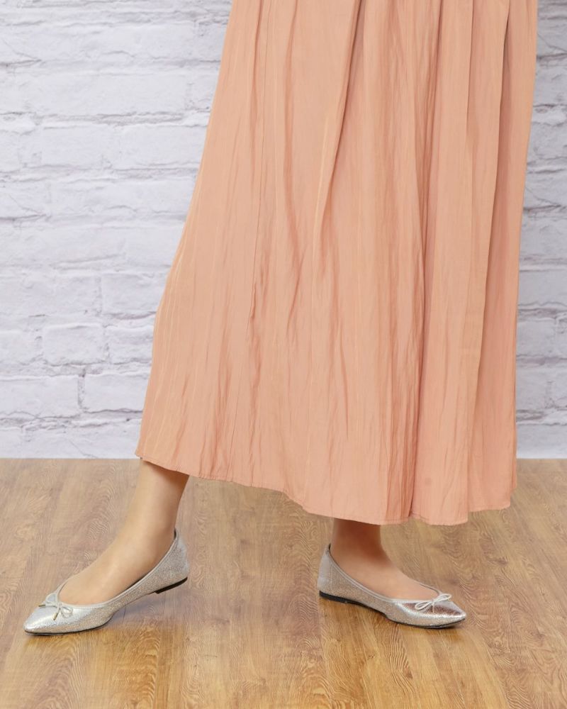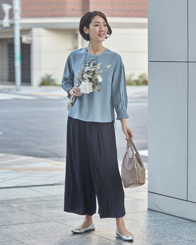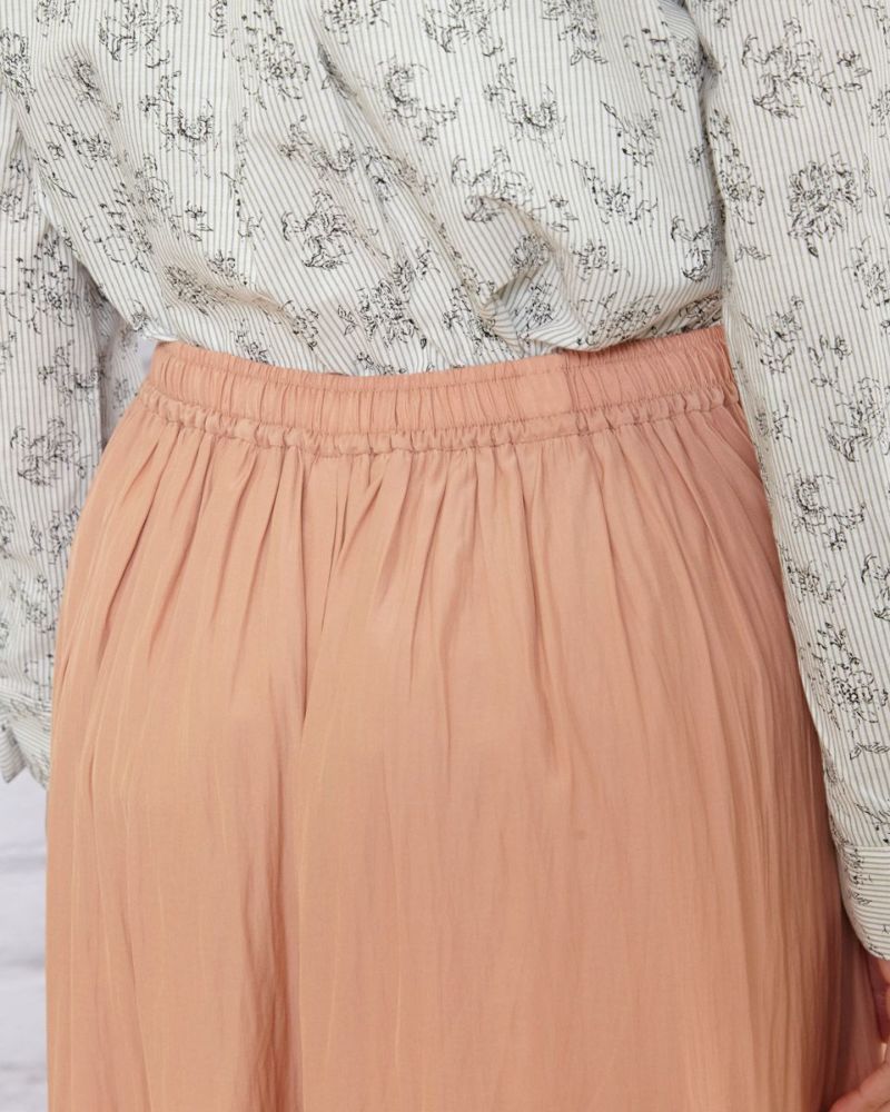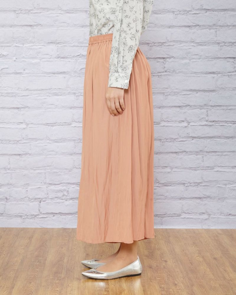 生地にワッシャー加工をかけたナチュラルなプリーツのガウチョパンツです。トイレに行く時など表地の裾が床につかない様に、裏地の裾にゴムを入れて表地を巻き込む事が出来る工夫をしています。