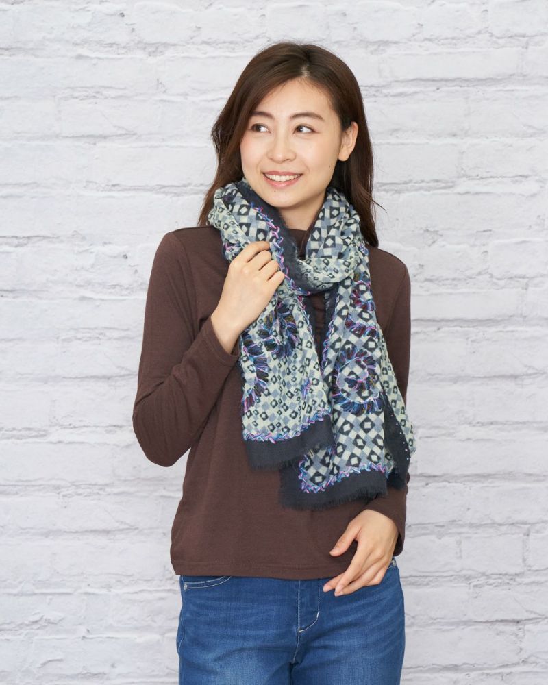 プリントに太めの糸の刺繍が豪華なウールストールです。暖かくおしゃれと実用性を楽しめるストールです。 Golden Bear Ladies' アクセサリ (Ladies')