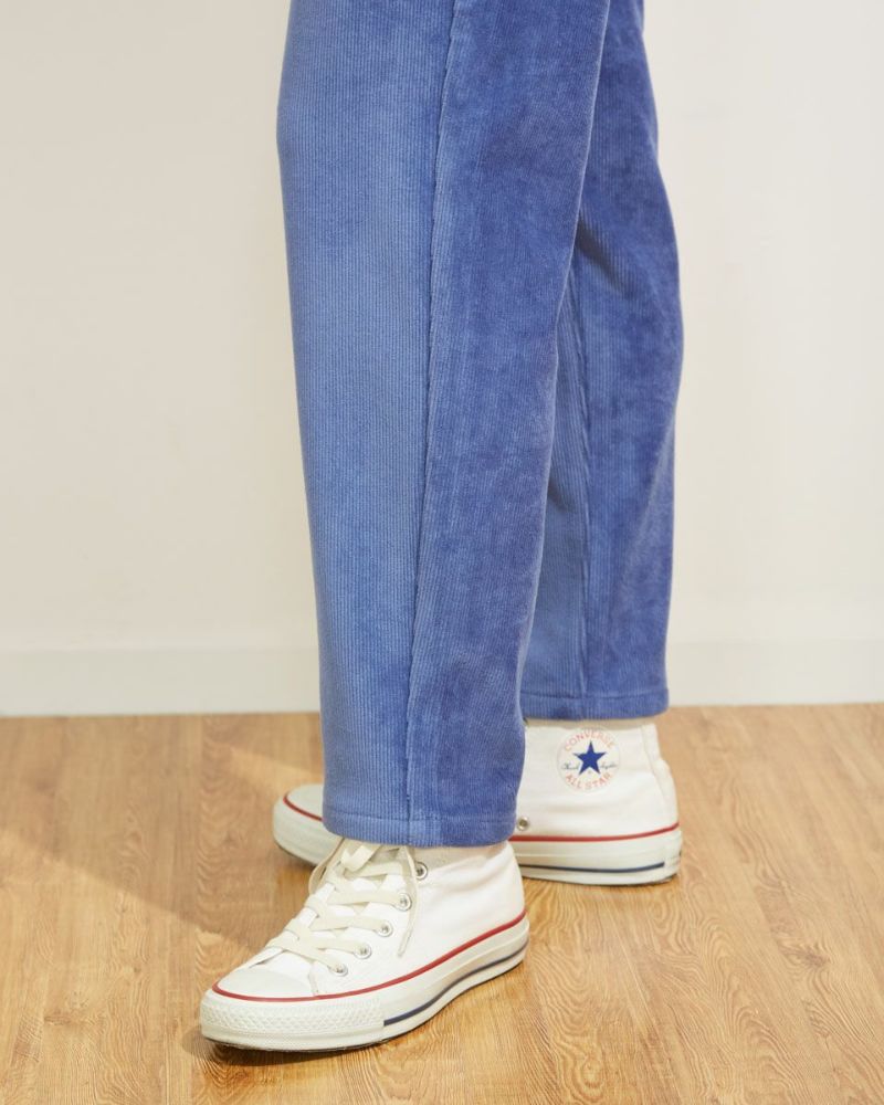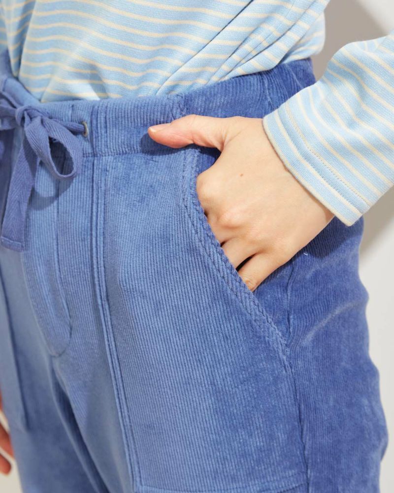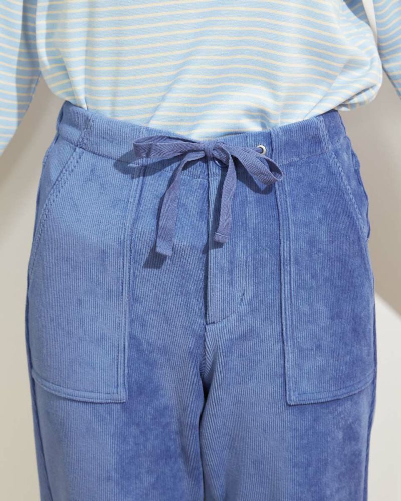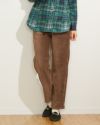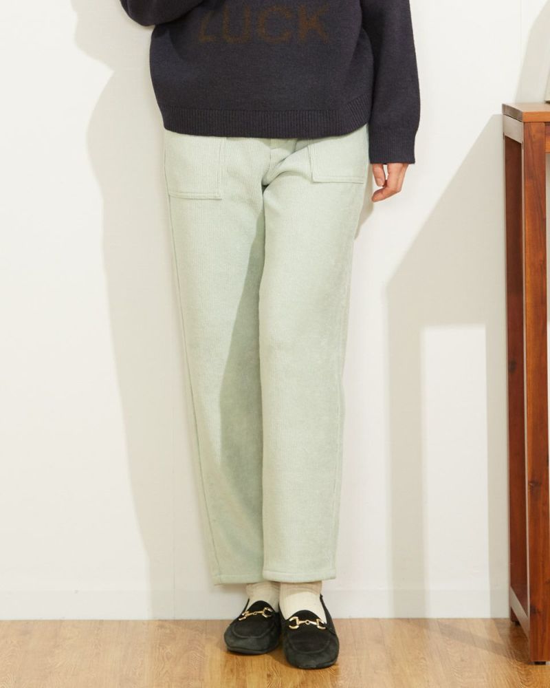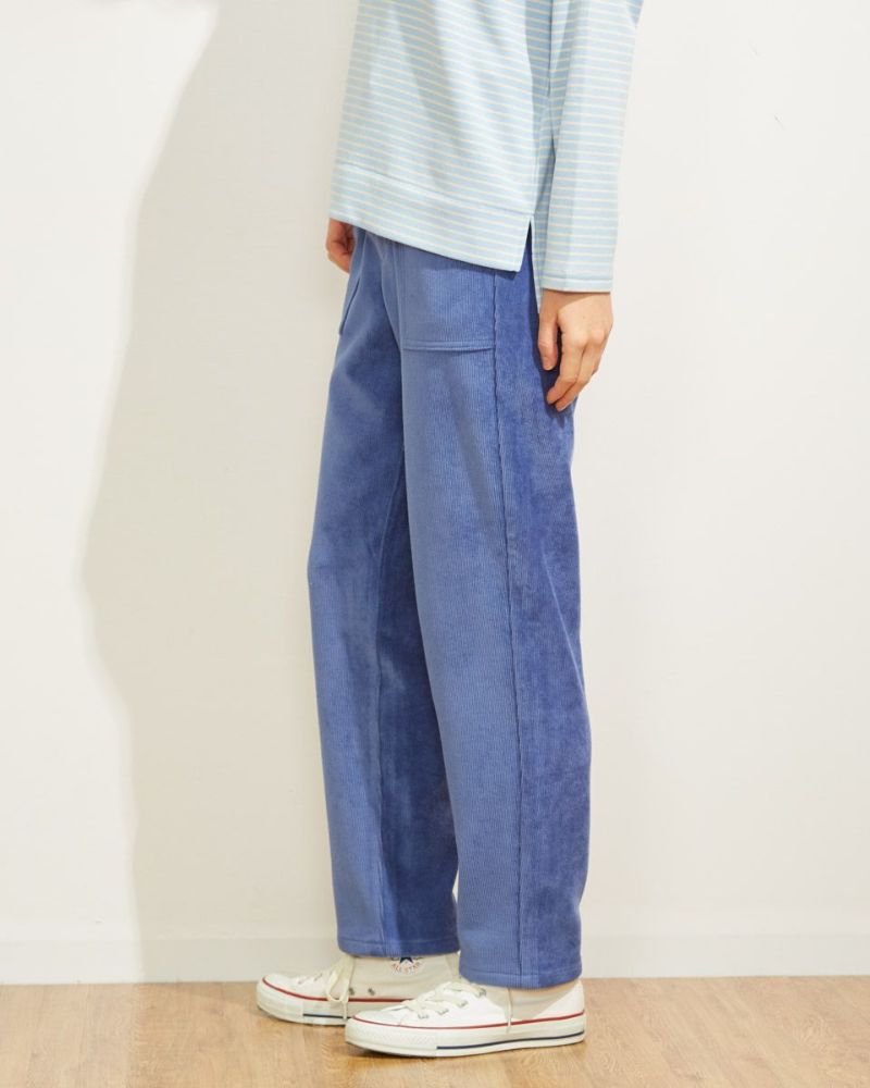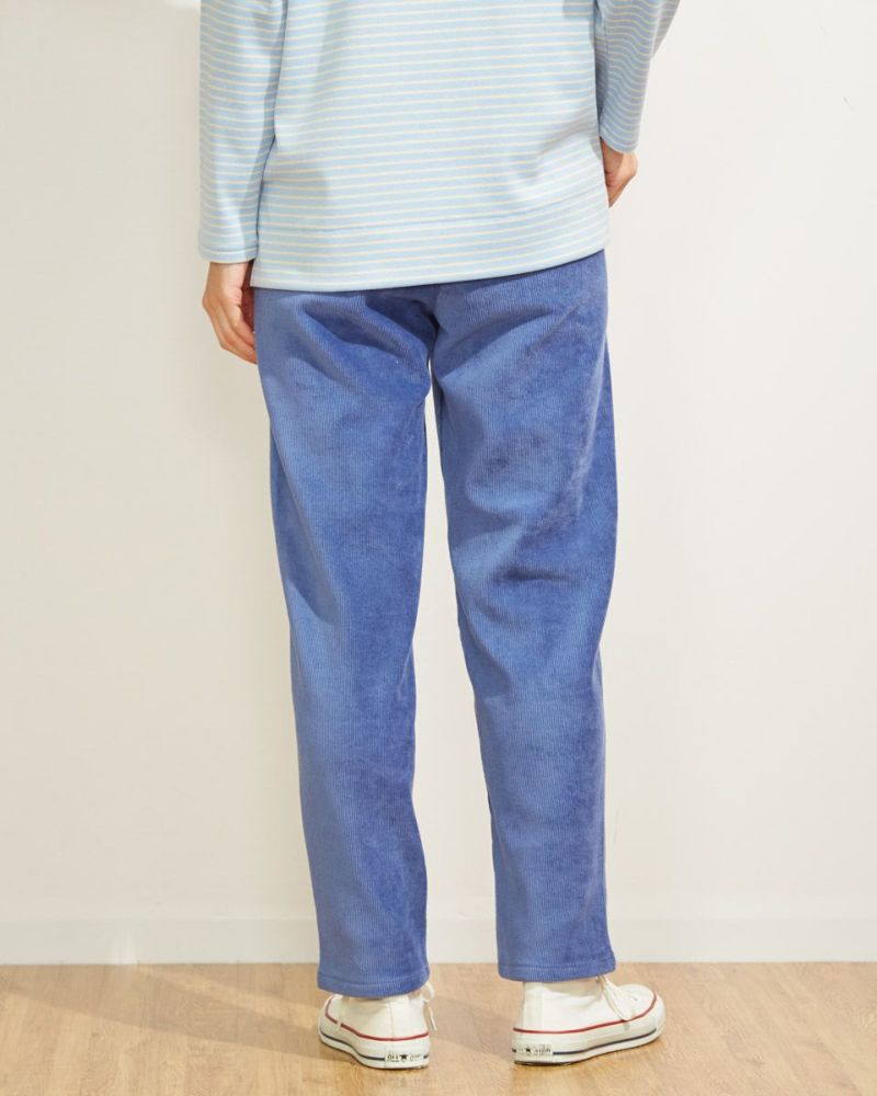 綿ポリエステルのニットコーディネートュロイで、柔らかい風合いが特徴です。前ファスナー開きでウエストベルトの切り替えは無しです。後ろのウエストのみ平ゴムを入れ、前はテープを通して、絞る事が出来ます。ベーシックなテーパードパンツに比べ、ヒップはややゆったり目です。
