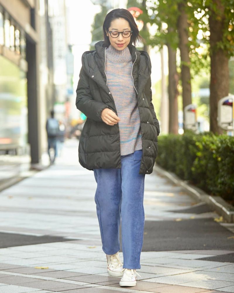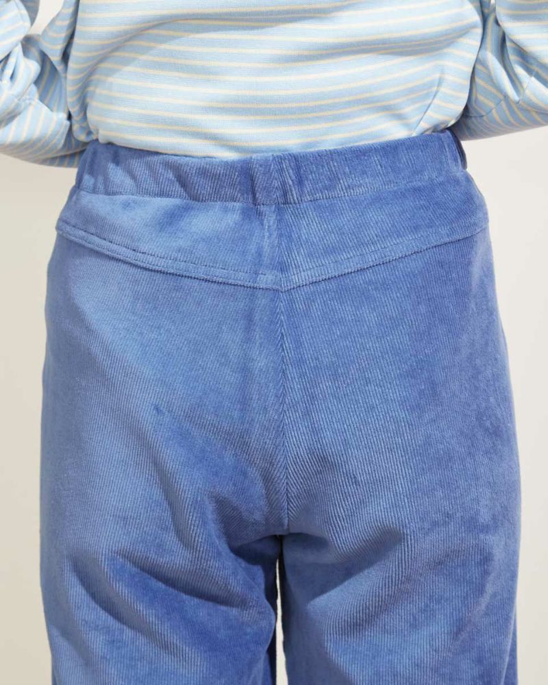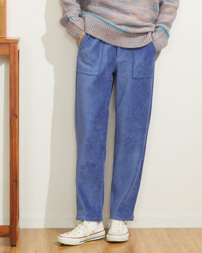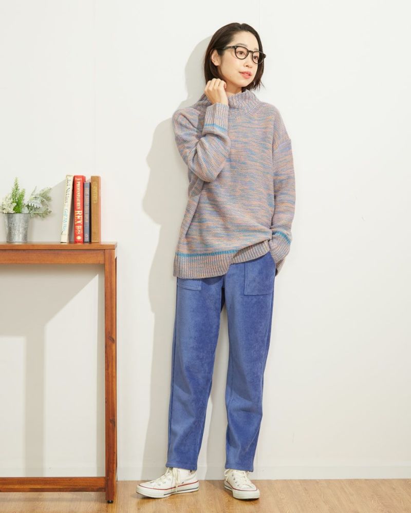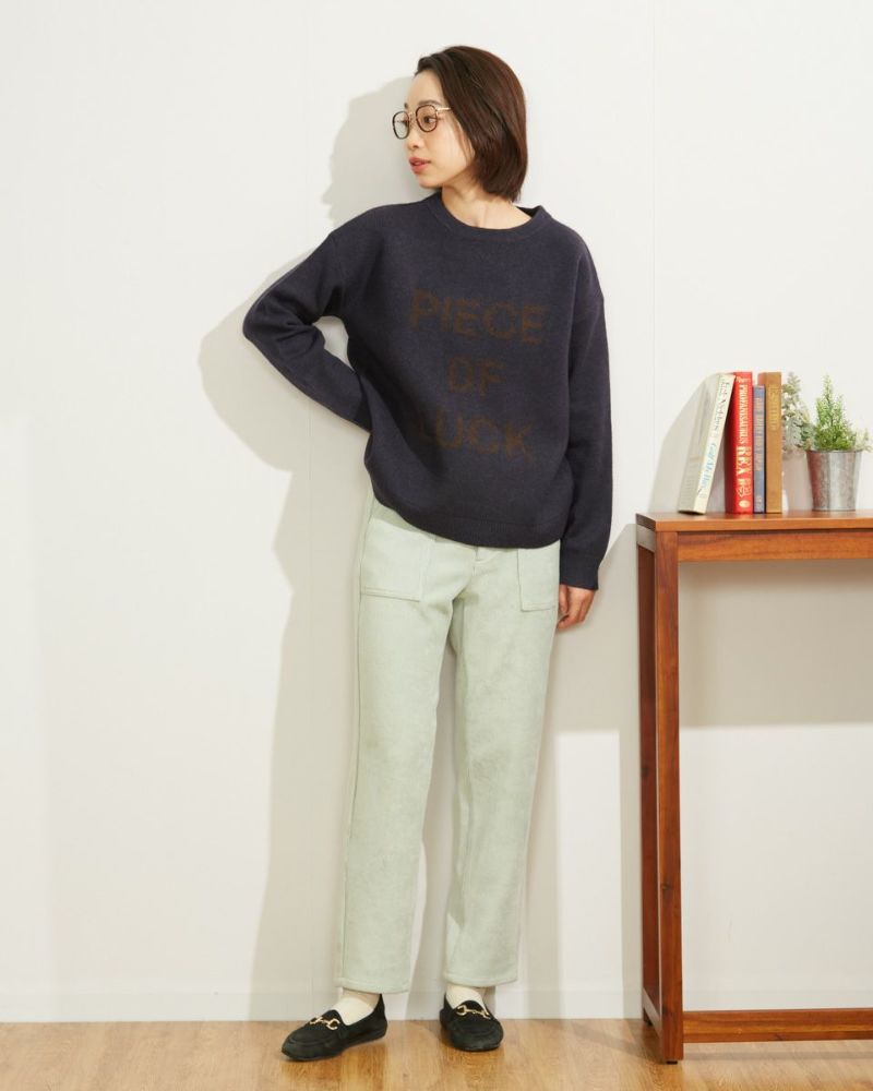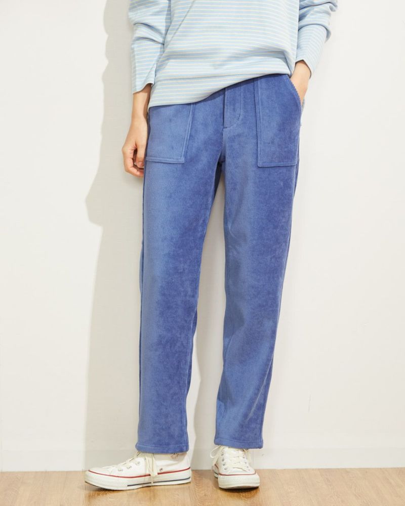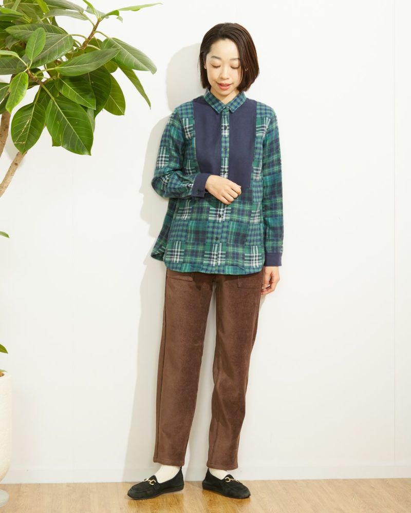 綿ポリエステルのニットコーディネートュロイで、柔らかい風合いが特徴です。前ファスナー開きでウエストベルトの切り替えは無しです。後ろのウエストのみ平ゴムを入れ、前はテープを通して、絞る事が出来ます。ベーシックなテーパードパンツに比べ、ヒップはややゆったり目です。