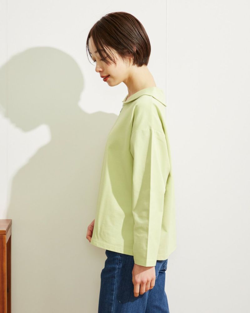 ハーフジップのプルオーバー。ゆったりシルエットでラフに着用できます。フラットカラーも女性らしく硬くなりすぎない襟付きデザインです。ライトグリーンとカーキの2色展開。