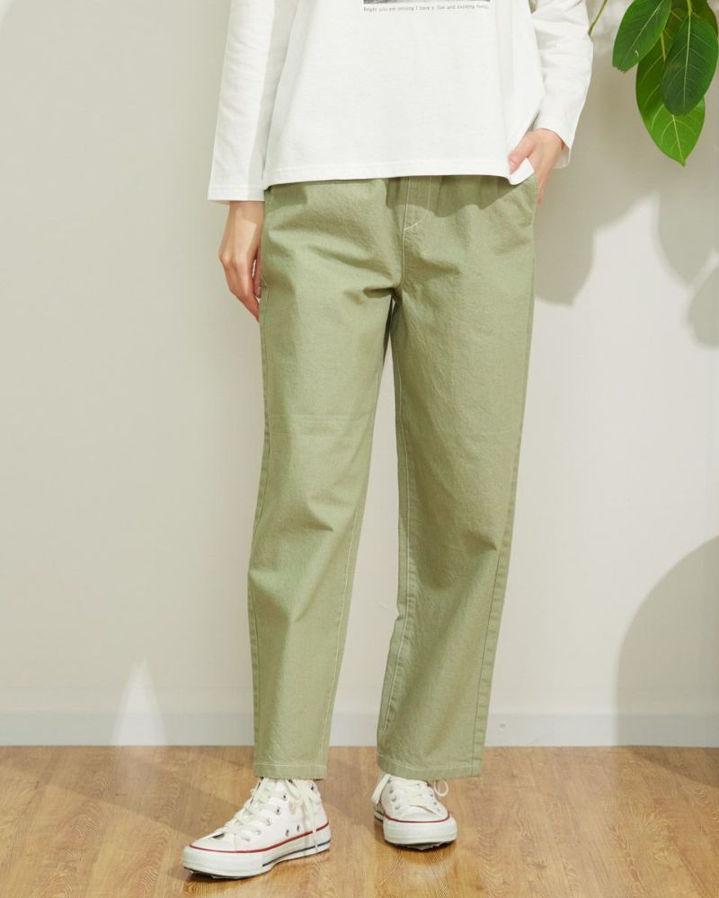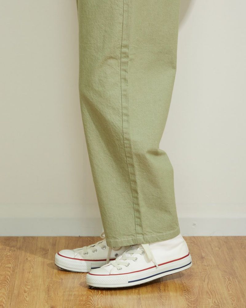 綿100%のツイルを使用したアンクル丈のストレートパンツです。ストレッチの入っていない素材ですので、30cmの深い股上で、ヒップから裾にかけて全体にゆったりとした分量をとっています。ウエストは開き無しのギャザーゴム仕様で内側に紐を通しています。