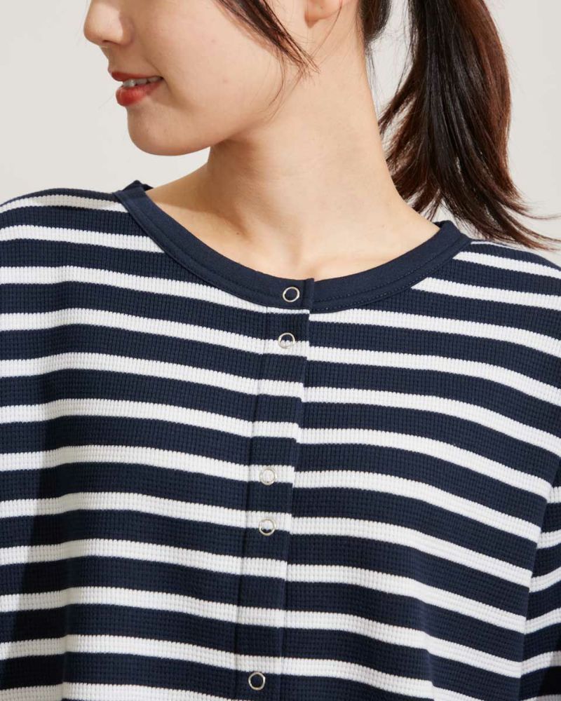 ドライタッチなワッフル素材を使用したカットカーディガン。フロントはスナップボタンで閉じてプルオーバーとしてコーディネートするのもおすすめです。 モデル身長: 166 cm 着用サイズ: M サイズ Golden Bear Ladies' カットソー (Ladies') 【着用アイテム】467Q3702 折山プレスカーゴパンツ 467Q3703 テーパードパンツ