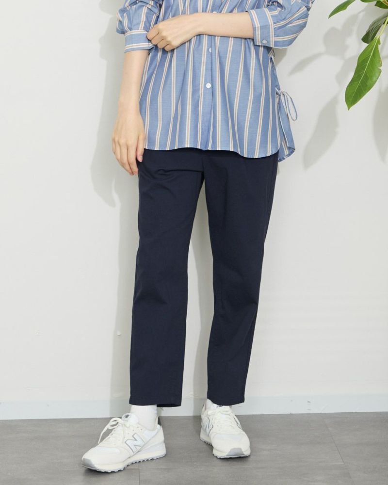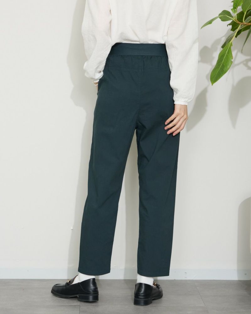 サラッとした肌触りの麻混素材を使用したクロップドパンツです。デザインはギャザーとタックを入れヒップ周りにゆとりを持たせたテーパードシルエットです。ウエストのベルト部分は本体と同色の平ゴムを直に接いでいますので良く伸びます。着用時の快適なはき心地をぜひお楽しみください。