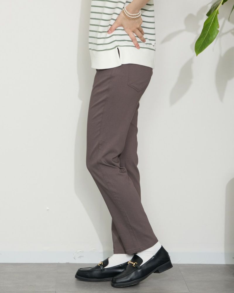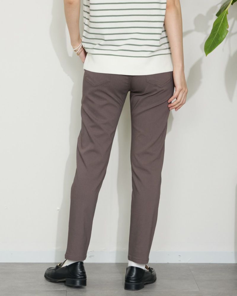 レーヨン・ナイロンツィルの素材を使用したアンクルパンツです。レーヨンの柔らかい肌触りが特徴です。横方向にとても良く伸び、穿き心地の良い素材です。シルエットはベーシックなテーパードです。 モデル身長: 166 cm 着用サイズ: 61 サイズ Golden Bear WOMEN ボトムス (WOMEN) 【着用アイテム】467QA405 リブ使いボーダーTシャツ 467QB410 七分袖ボーダーTシャツ