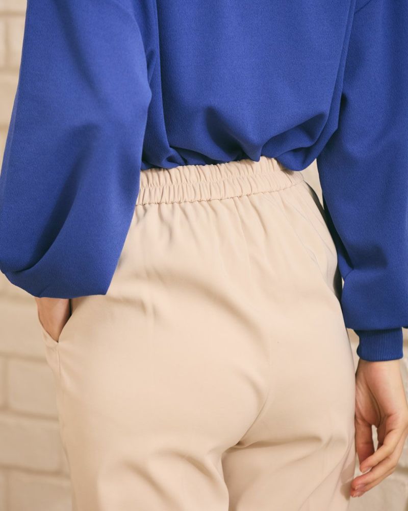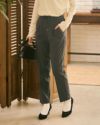 横ストレッチの効いたキレイ目ポリエステルツイルを裏起毛し、暖かみの有る肌触りの素材に仕上げました。ウエスト部分は後ろのみギャザーゴム仕様にし、開き無しで着脱できるデザインです。シルエットは前身にタック、後ろ身にギャザーを入れヒップ周りの分量をゆったりさせたテーパードシルエットです。前後折山プレス入りです。