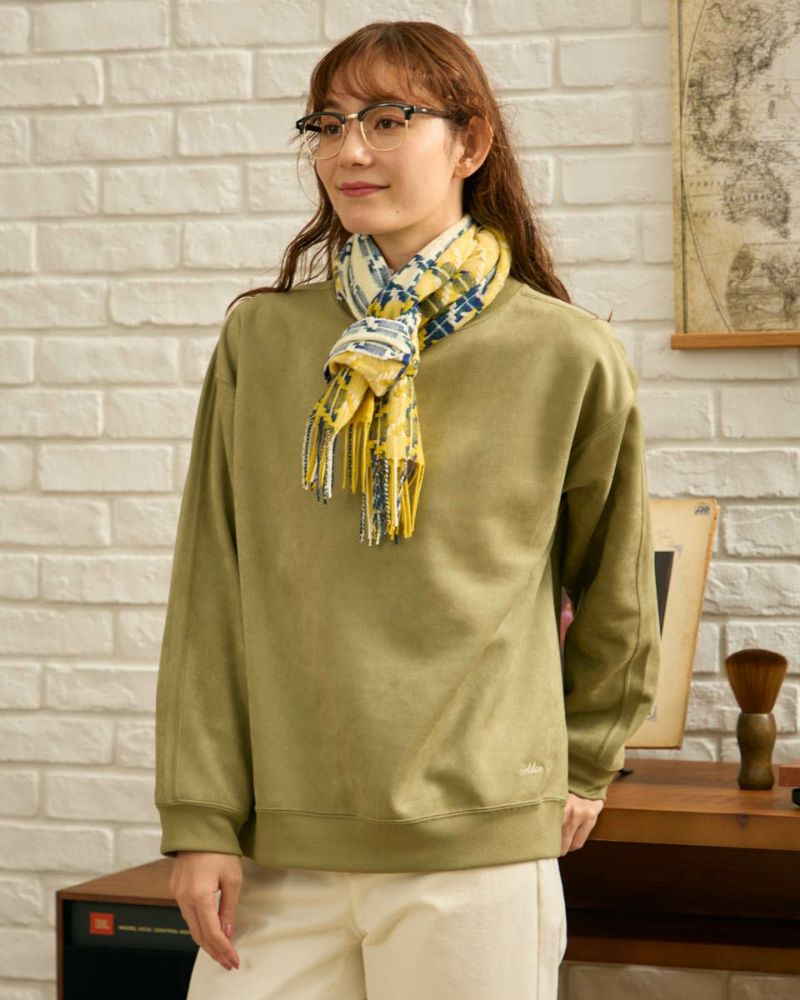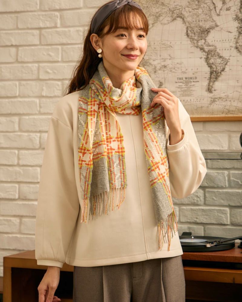 薄手で柔らかなWOOLを使用したチェックストールです。ジャカード織が表情を豊かにコーディネートのアクセントになります。 Golden Bear Ladies' アクセサリ (Ladies') 【着用アイテム】467QD431 ロゴプルオーバー 468QD650 クルーネックPO 467QE702 ストレートパンツ 468QD750 ストレートパンツ