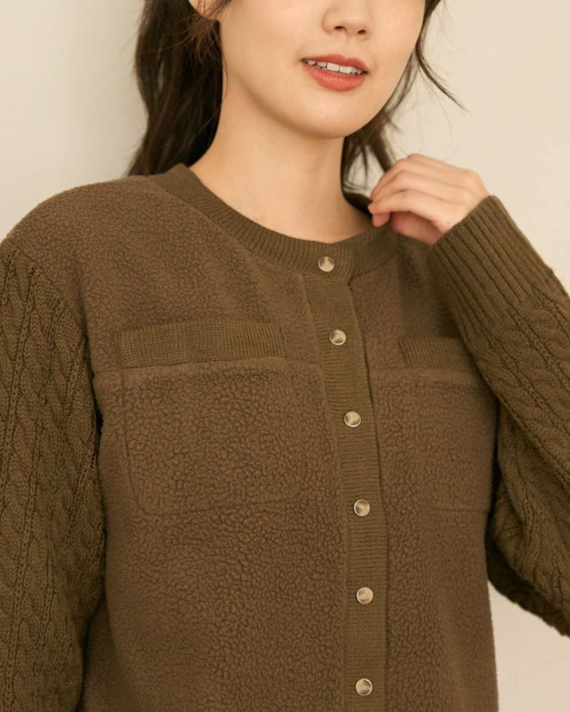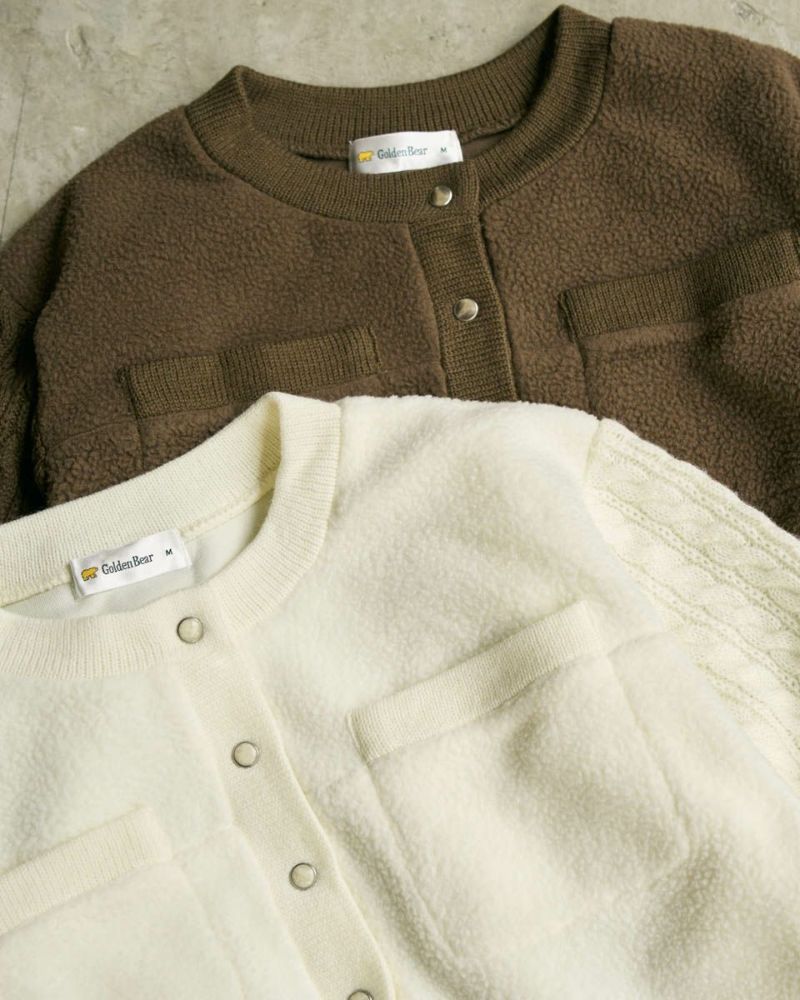 フリースとニットを組み合わせてデザインしたカーディガン。異素材コンビのコントラストが楽しいアイテムです。ショート丈なのでトレンド感も出て、デニムやスカートとの相性も◎