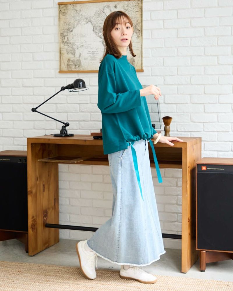 ワッフル素材を使用したトップスです。裾にリボンを通したデザインで、ドロストしてシルエット変化を楽しめるアイテムです。裾をインするのに抵抗がある場合でも前裾を調整することで簡単にニュアンスを出すことができます。全く絞らず、そのままのストレートなシルエットも楽しめます。 モデル身長: 171 cm 着用サイズ: M サイズ Golden Bear Ladies' カットソー (Ladies')