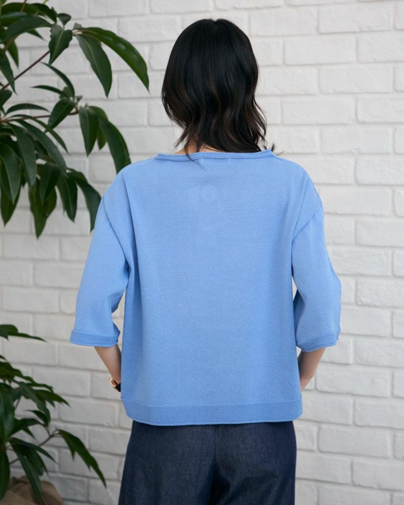 和紙とポリエステルの糸を使用しホールガーメントで編んだプルオーバーです。清涼感ある凹凸感をお楽しみいただけます。触り心地はサラサラしていて張りがあり、強度も高くしっかりした編み上がりのニットです。 モデル身長: 166 cm 着用サイズ: M サイズ Golden Bear Ladies' ニット (Ladies') 【着用アイテム】467R4701 ガウチョパンツ 468R3760 ストレートパンツ