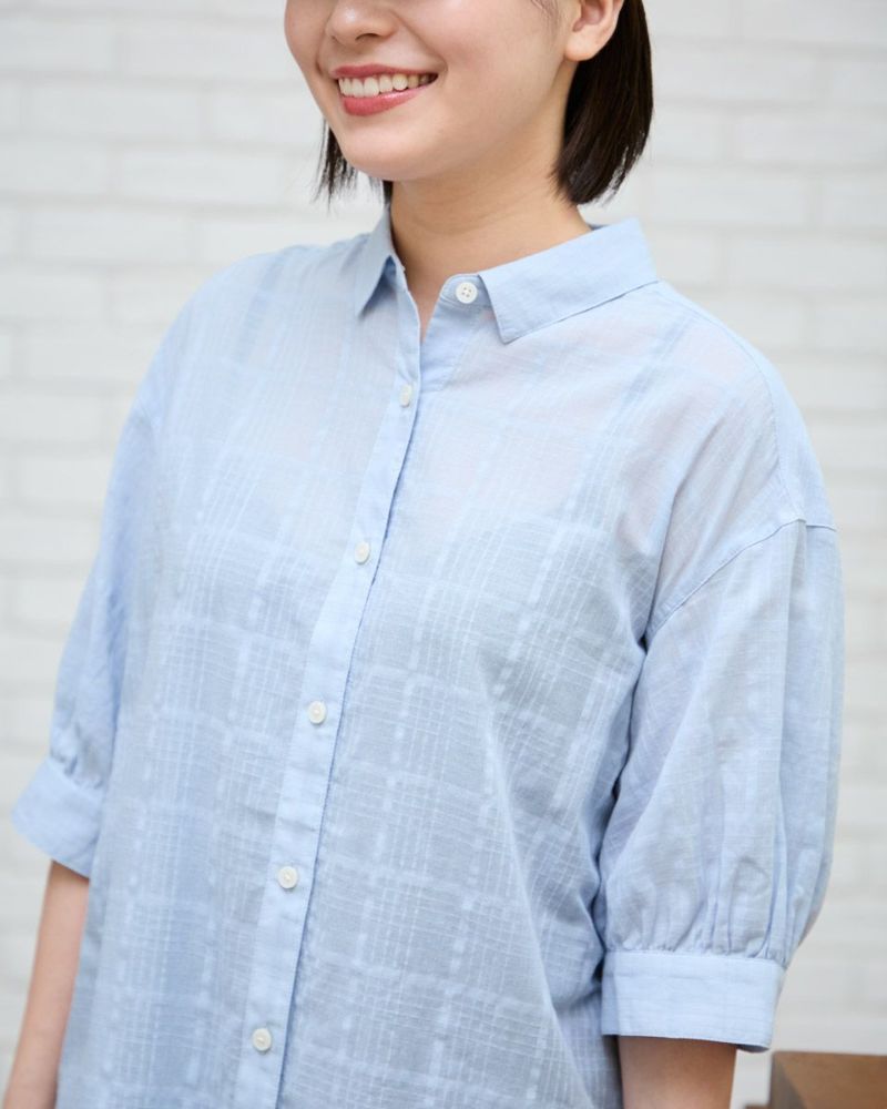 オーガニックコットンを使用した透け感のある素材を使用したブラウスです。少しオーバーサイズのサイジングは夏にぴったりです。 モデル身長: 162 cm 着用サイズ: M サイズ Golden Bear Ladies' ブラウス (Ladies') 【着用アイテム】468R6353 ドッキングワンピース