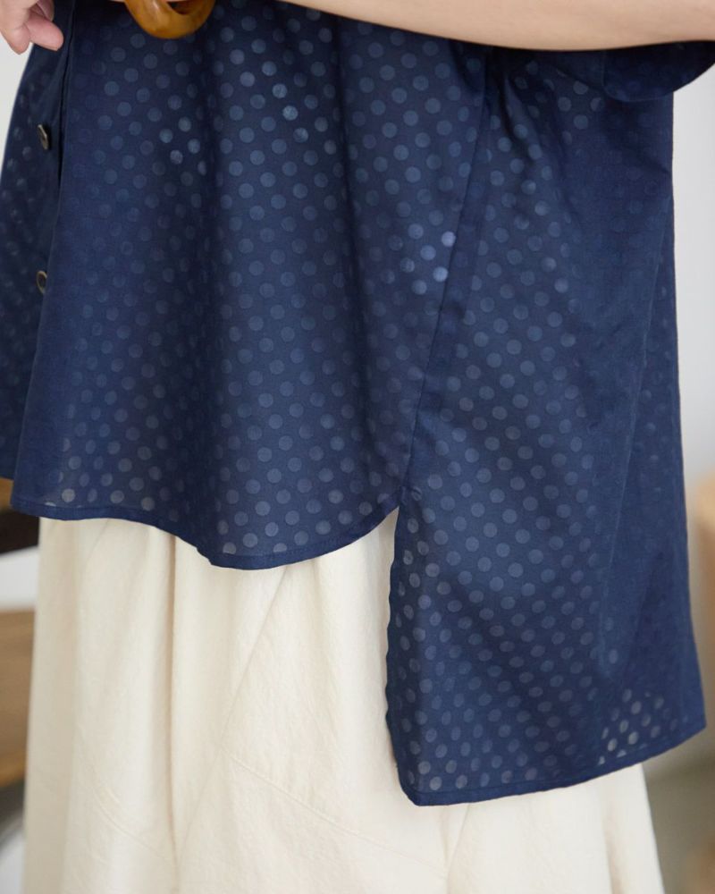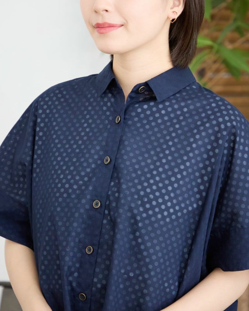 水玉柄にオパール加工した綿ポリエステル素材のブラウスです。(オパール加工とは薬品で繊維の糸を溶かし透かし模様を作る加工のこと)身頃は分量をゆったりととり、袖は五分丈のドルマンスリーブになります。台襟付きシャツカラーで前開きのデザインなので羽織としても着用頂けます。裾は前後差をつけ、前の両脇はラウンドせさせて、後ろは直線のスリットにしています。色はアイボリーとネイビーの2色展開になります。